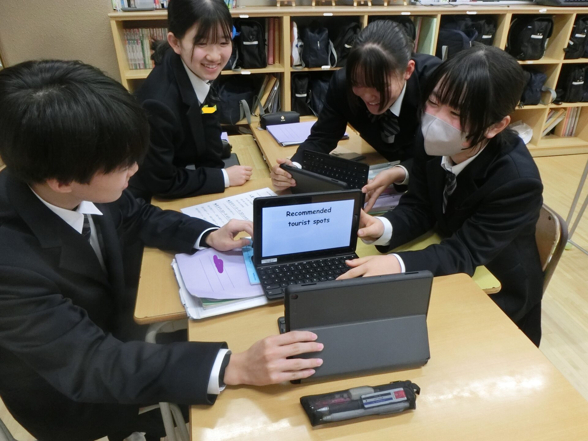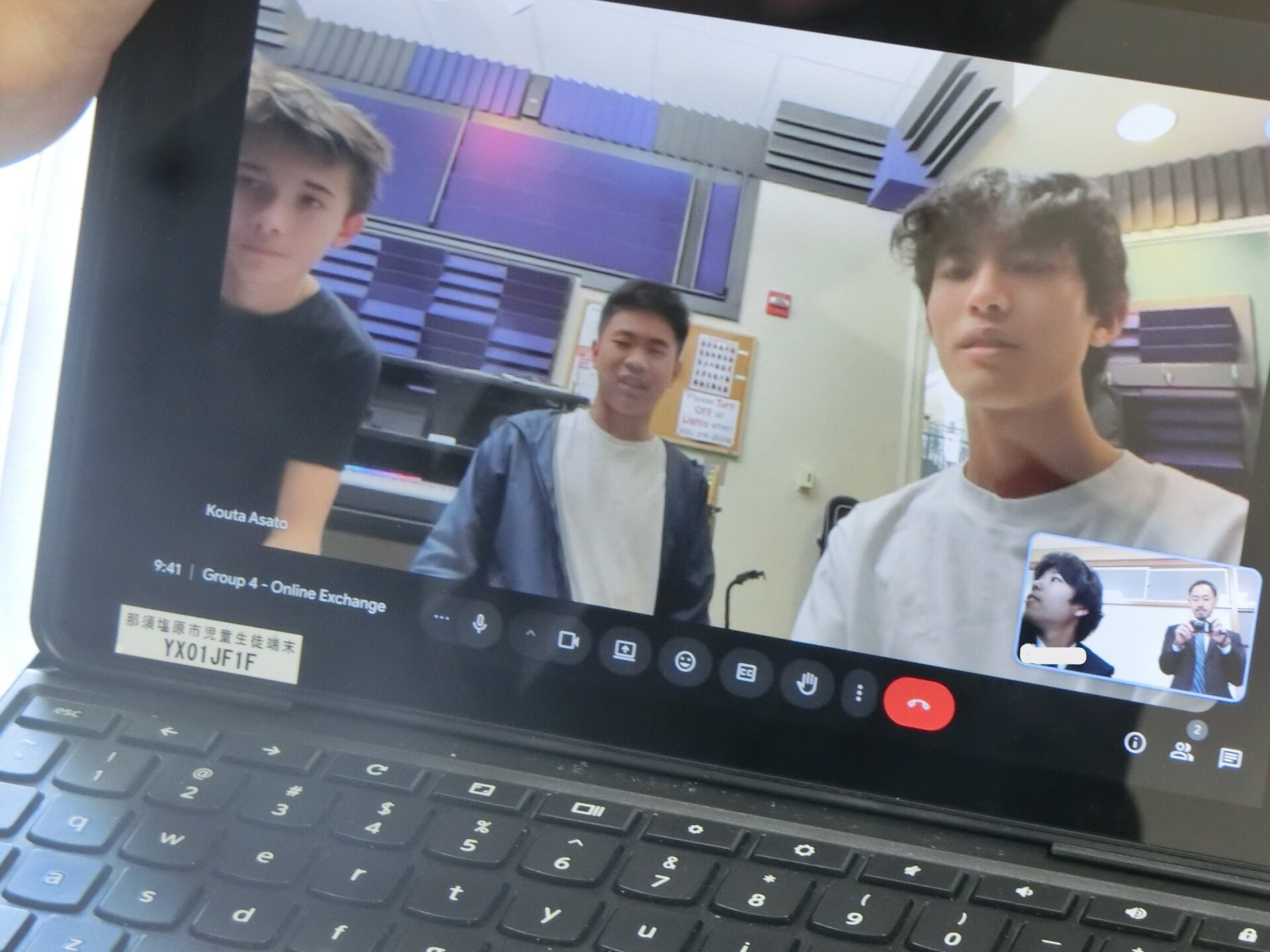 今日は英語の授業でハワイの学校とのオンライン交流会を行いました。以前、本校の様子を見に来られたハワイの学校の先生と現地の生徒とグループごとにリモートで自己紹介と文化紹介をしました。