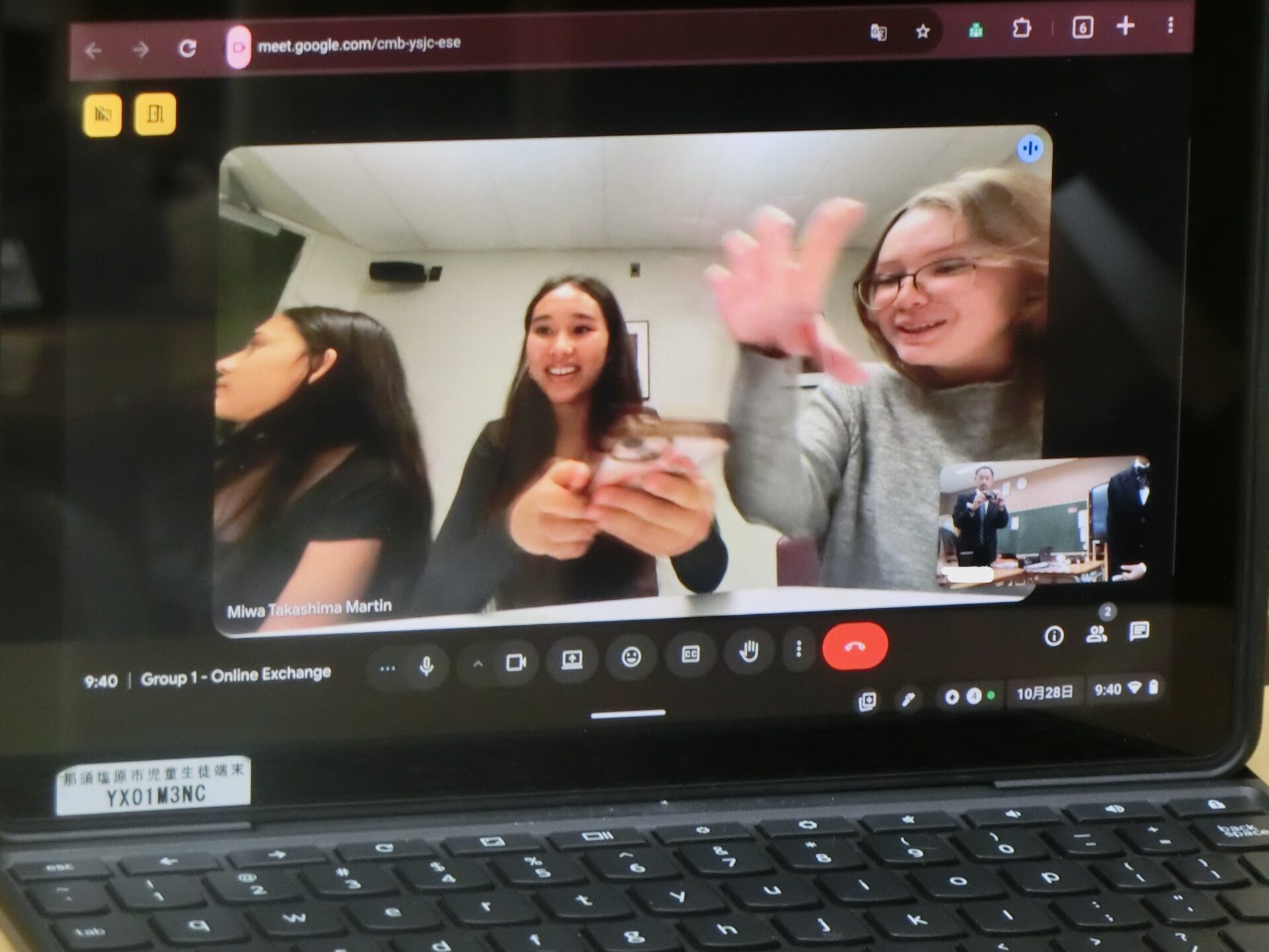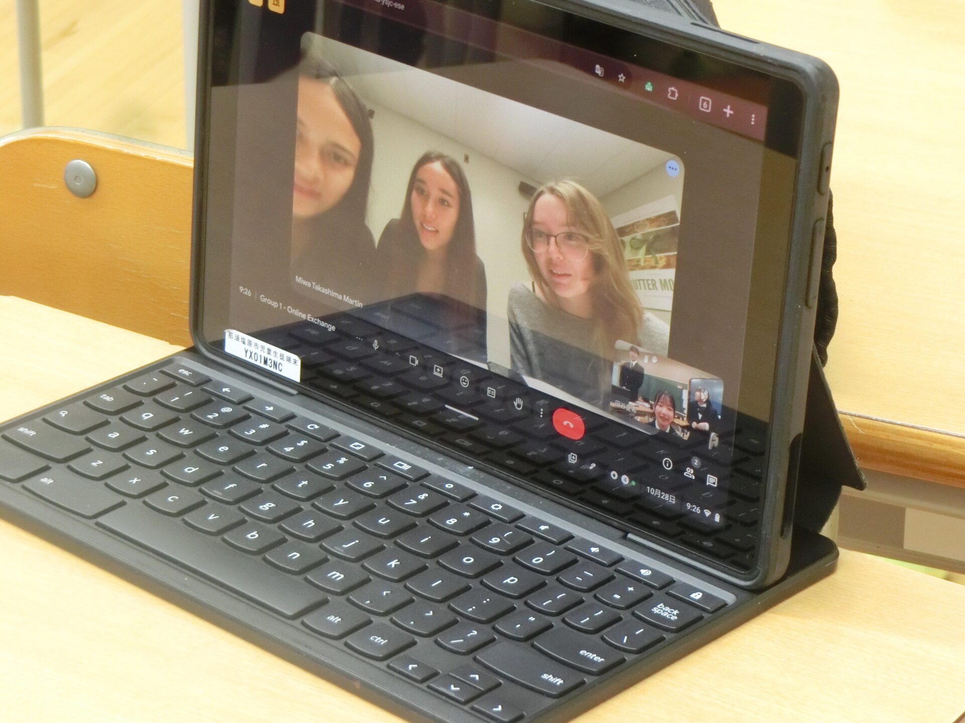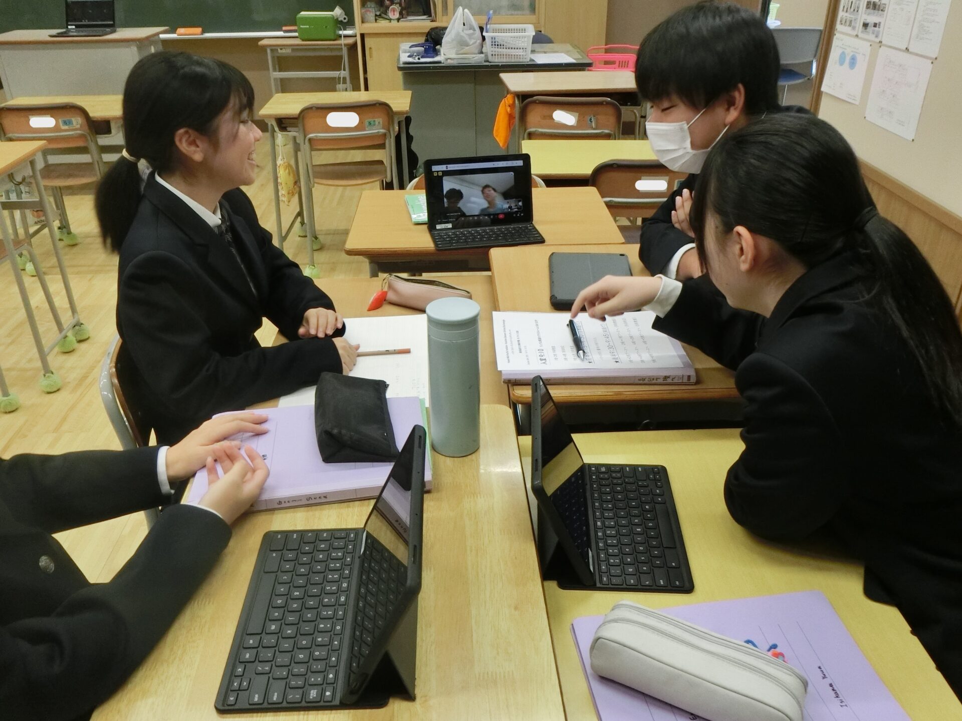 今日は英語の授業でハワイの学校とのオンライン交流会を行いました。以前、本校の様子を見に来られたハワイの学校の先生と現地の生徒とグループごとにリモートで自己紹介と文化紹介をしました。