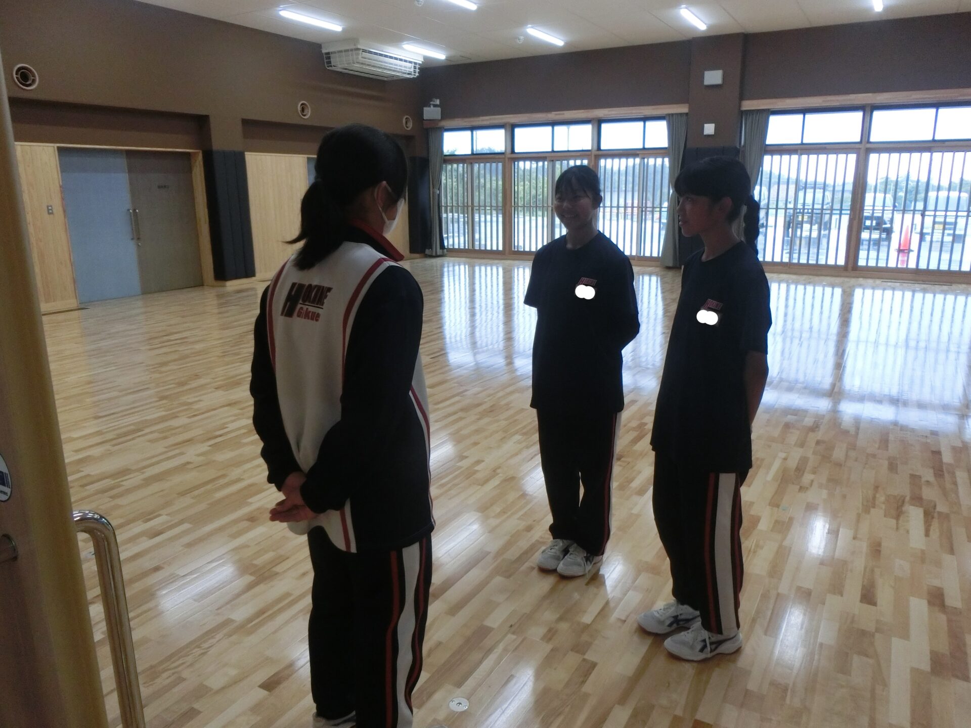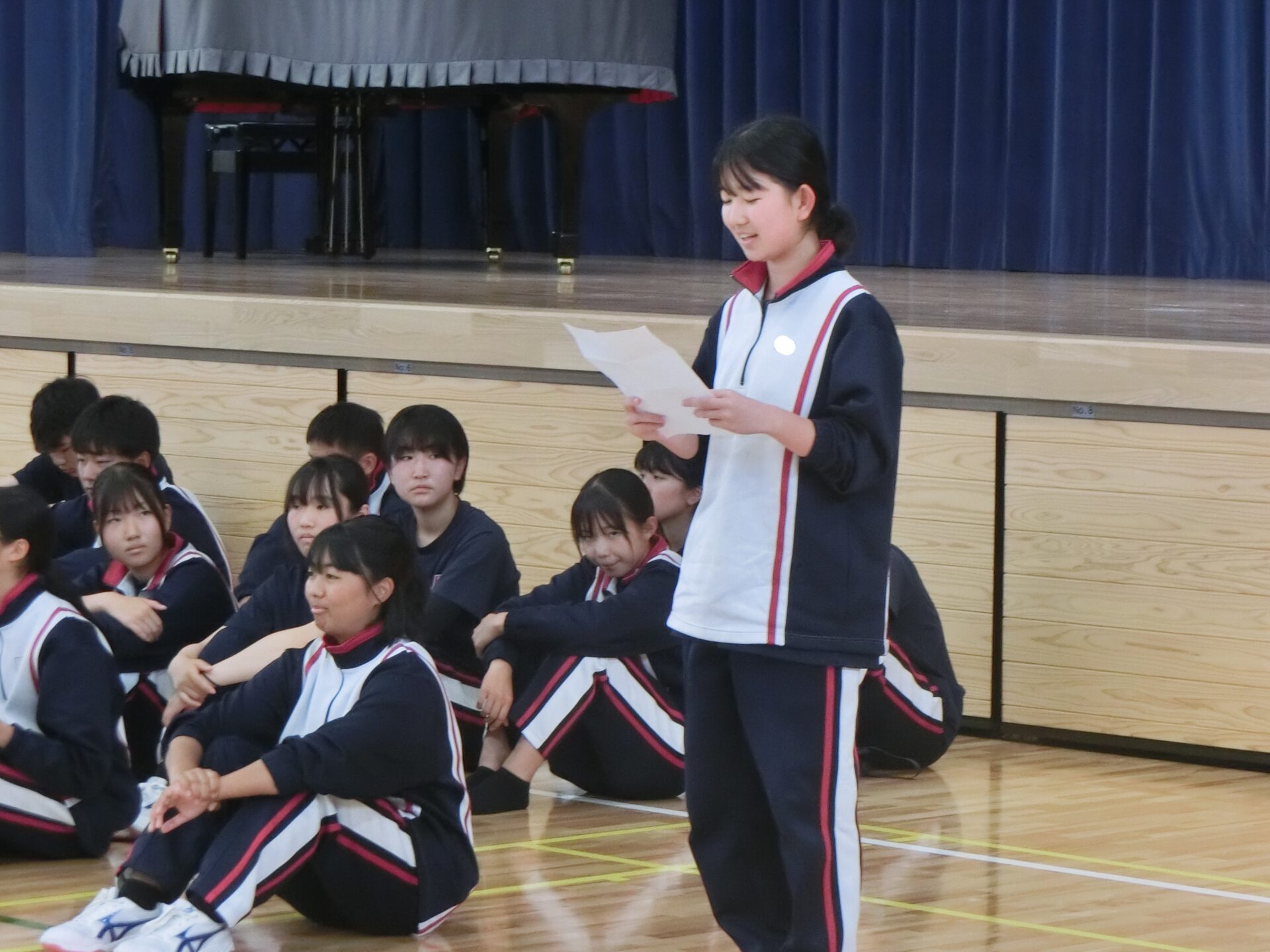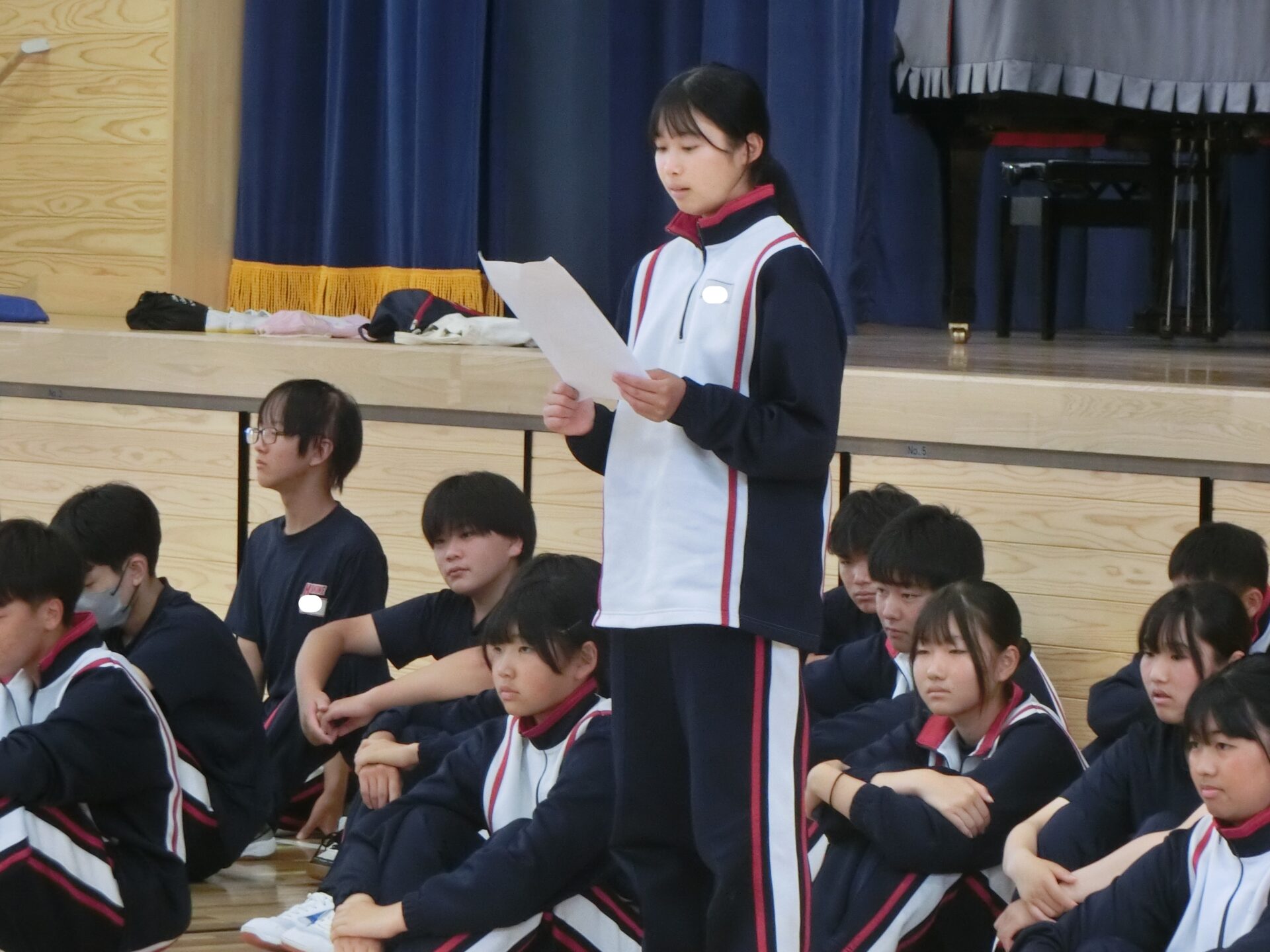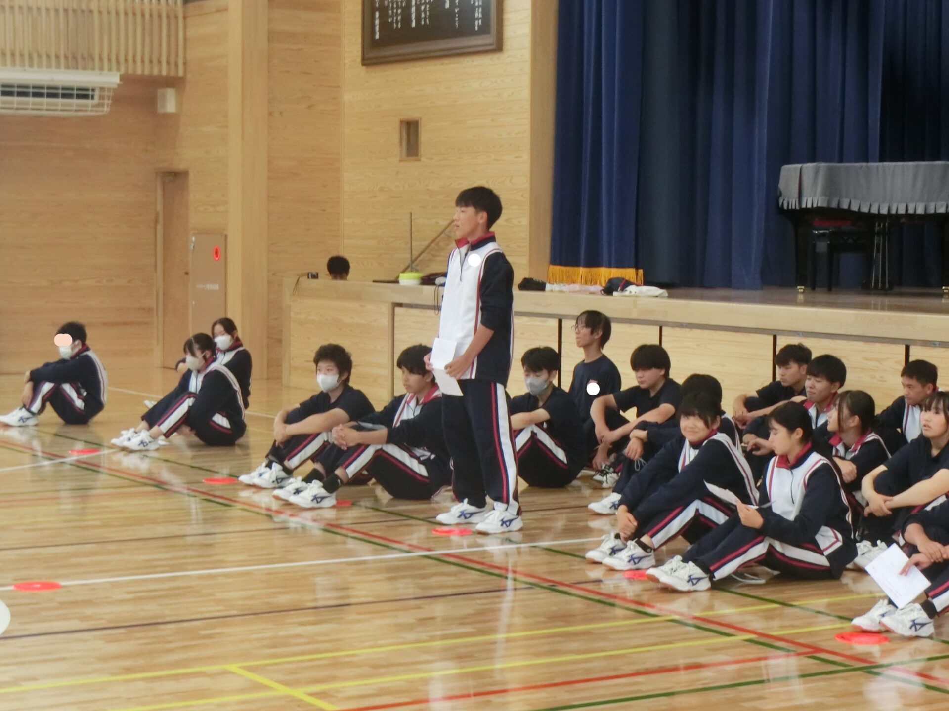 はじめに、9年生の各部の部長から総体に向けて意気込みの発表がありました。それぞれの部の目標や大会にかける思いなどをしっかり発表していました。