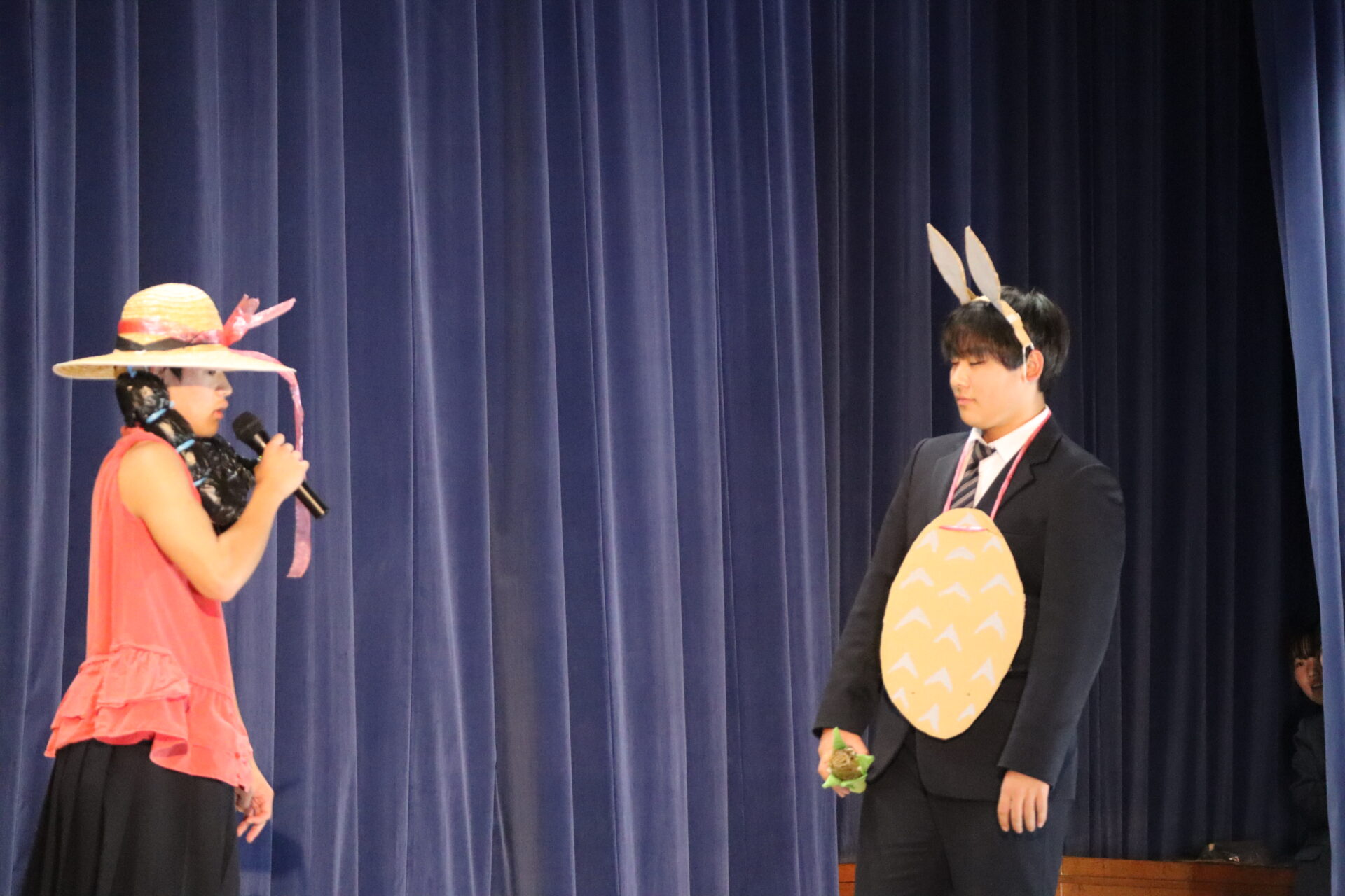 劇の小道具から台本まで自分たちで準備し、最後のトリを飾りました。クラスでは、2年前に「桃太郎」、昨年度は「浦島シンデレラ」、そして今年と3年連続でフル出場となりました。