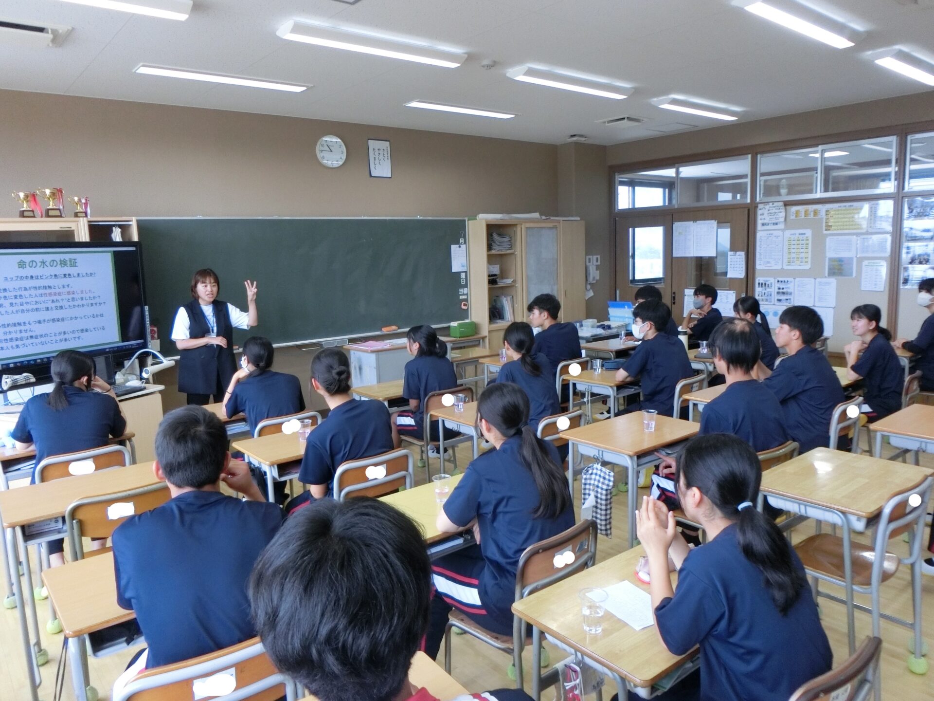 水の実験ではコップの水を交換し合い、性感染症が無症状で感染し、本人も気づかないことが多いことが分かりました。