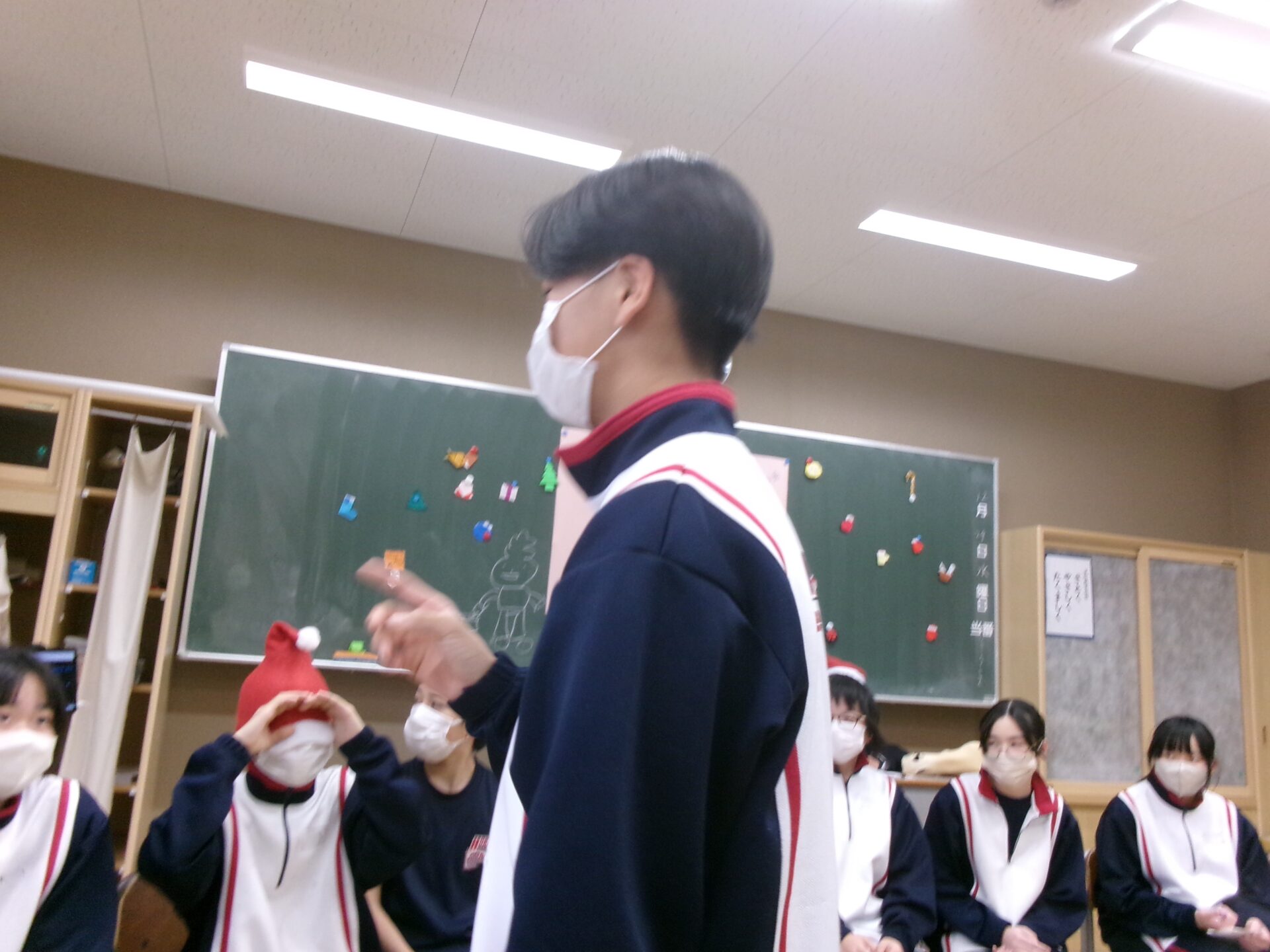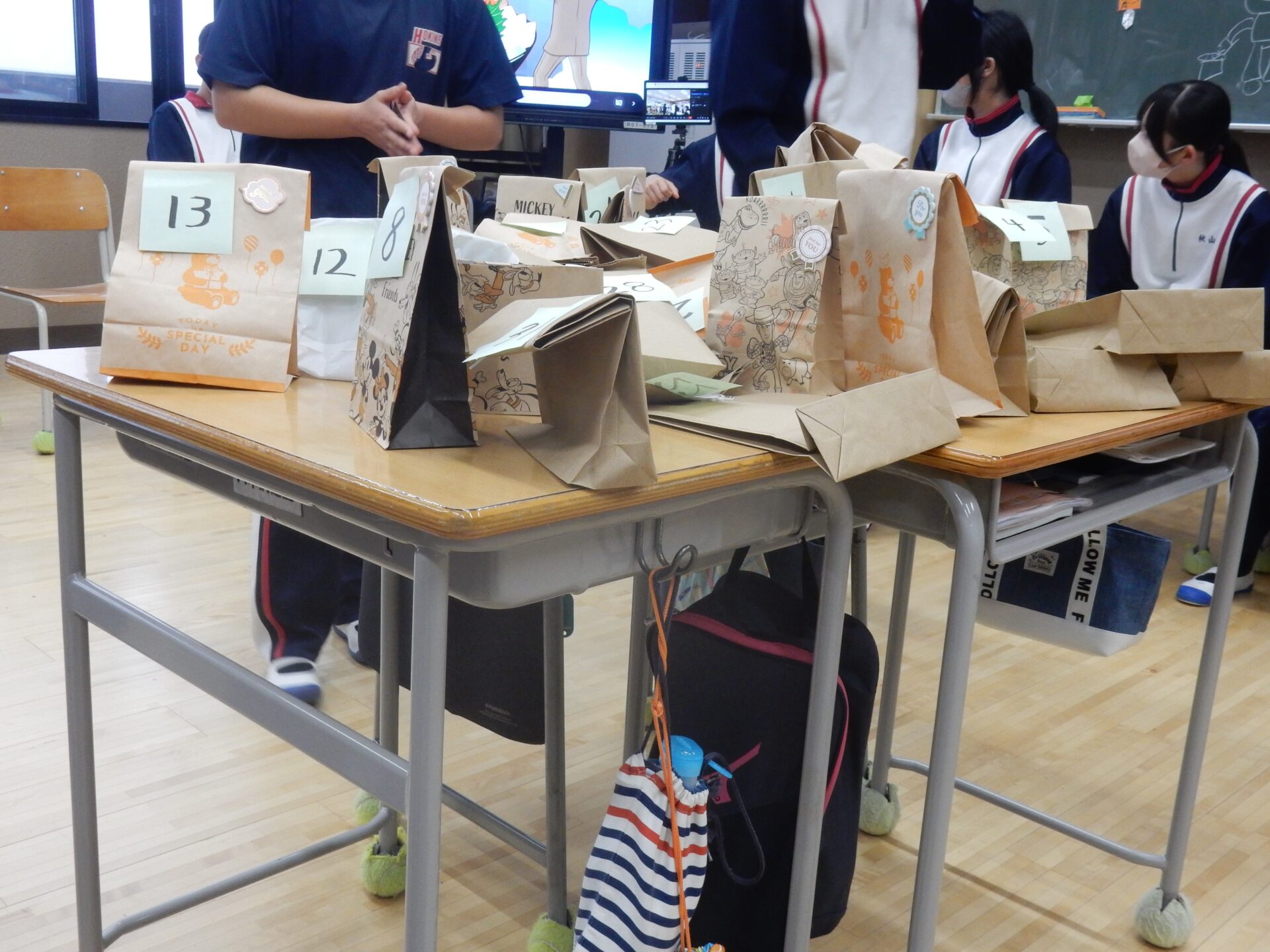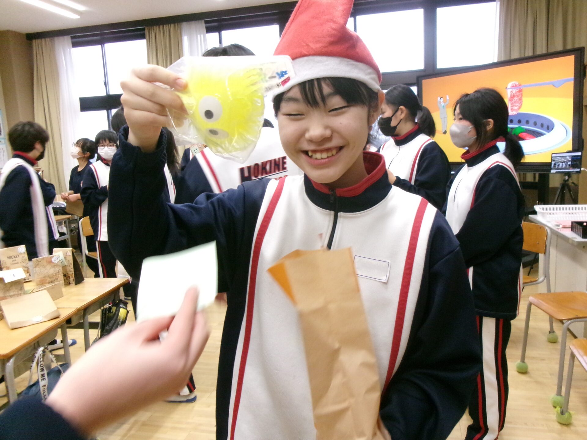 その後は、プレゼントとメッセージカードの交換です。メッセージカードは、4月から撮りためた集合写真の裏に今年頑張ったみんなをねぎらうメッセージを書き、交換しました。また、フルーツバスケットの結果をもとにプレゼントを選びました。ちょっとしたプレゼントでももらえると嬉しそうにしていました。