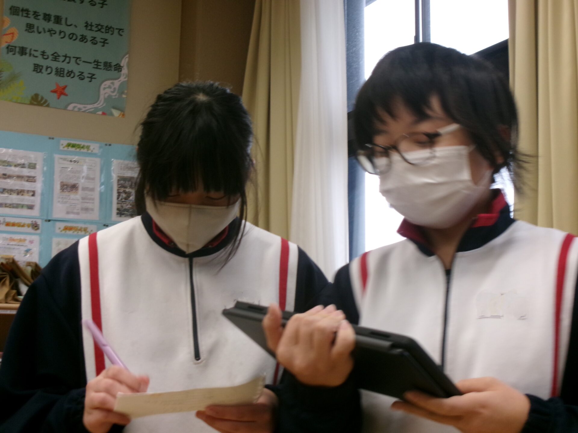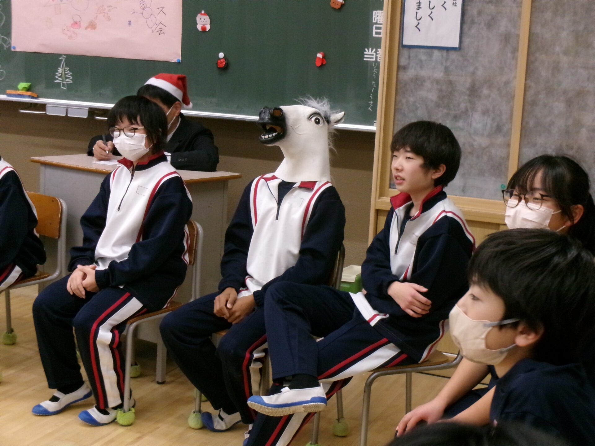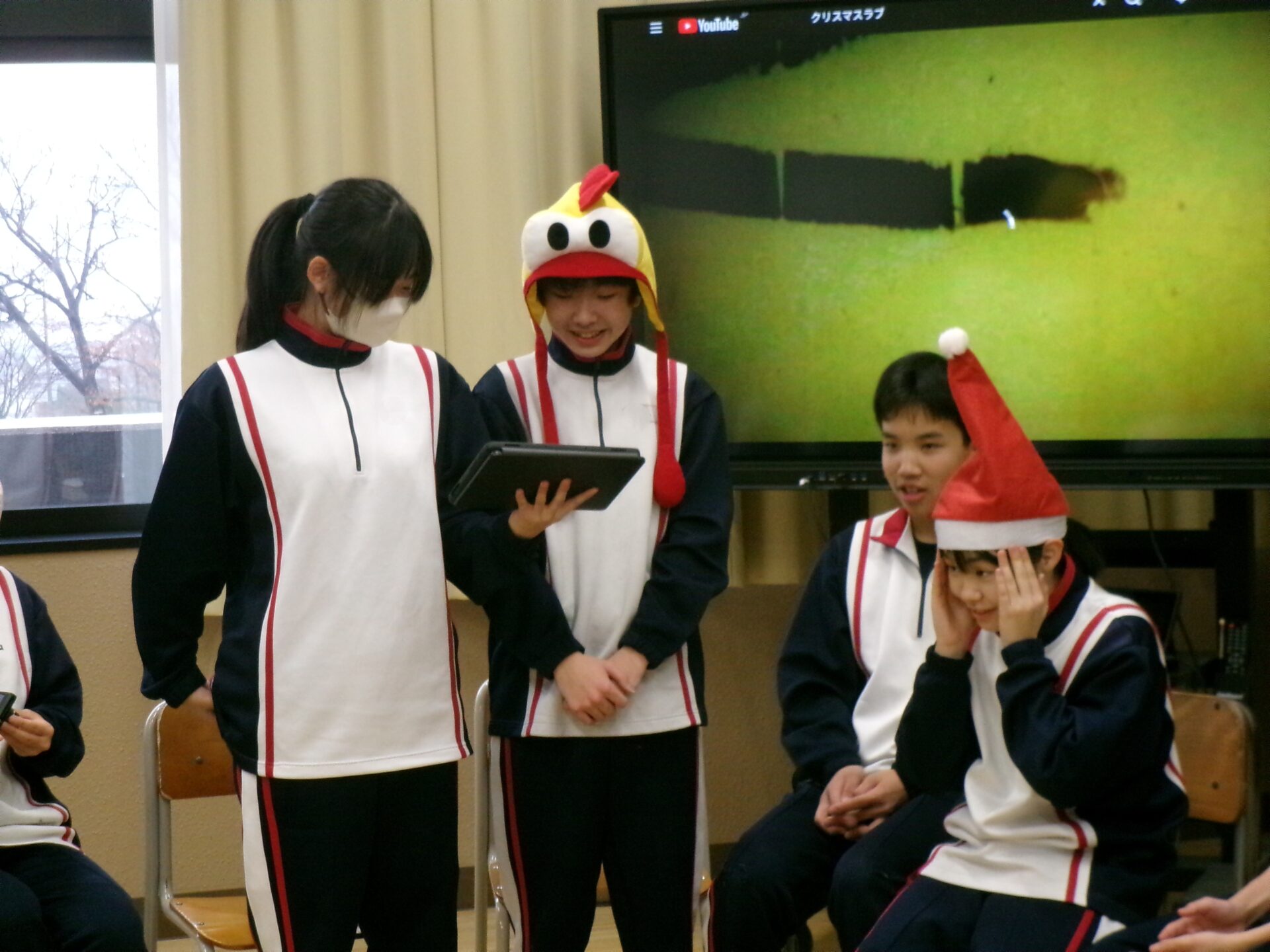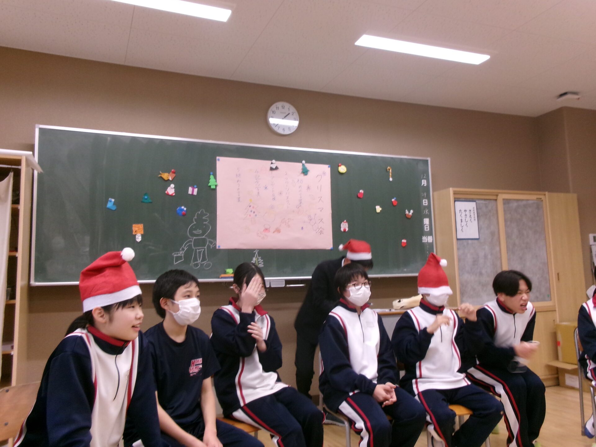 その後は、プレゼントとメッセージカードの交換です。メッセージカードは、4月から撮りためた集合写真の裏に今年頑張ったみんなをねぎらうメッセージを書き、交換しました。また、フルーツバスケットの結果をもとにプレゼントを選びました。ちょっとしたプレゼントでももらえると嬉しそうにしていました。