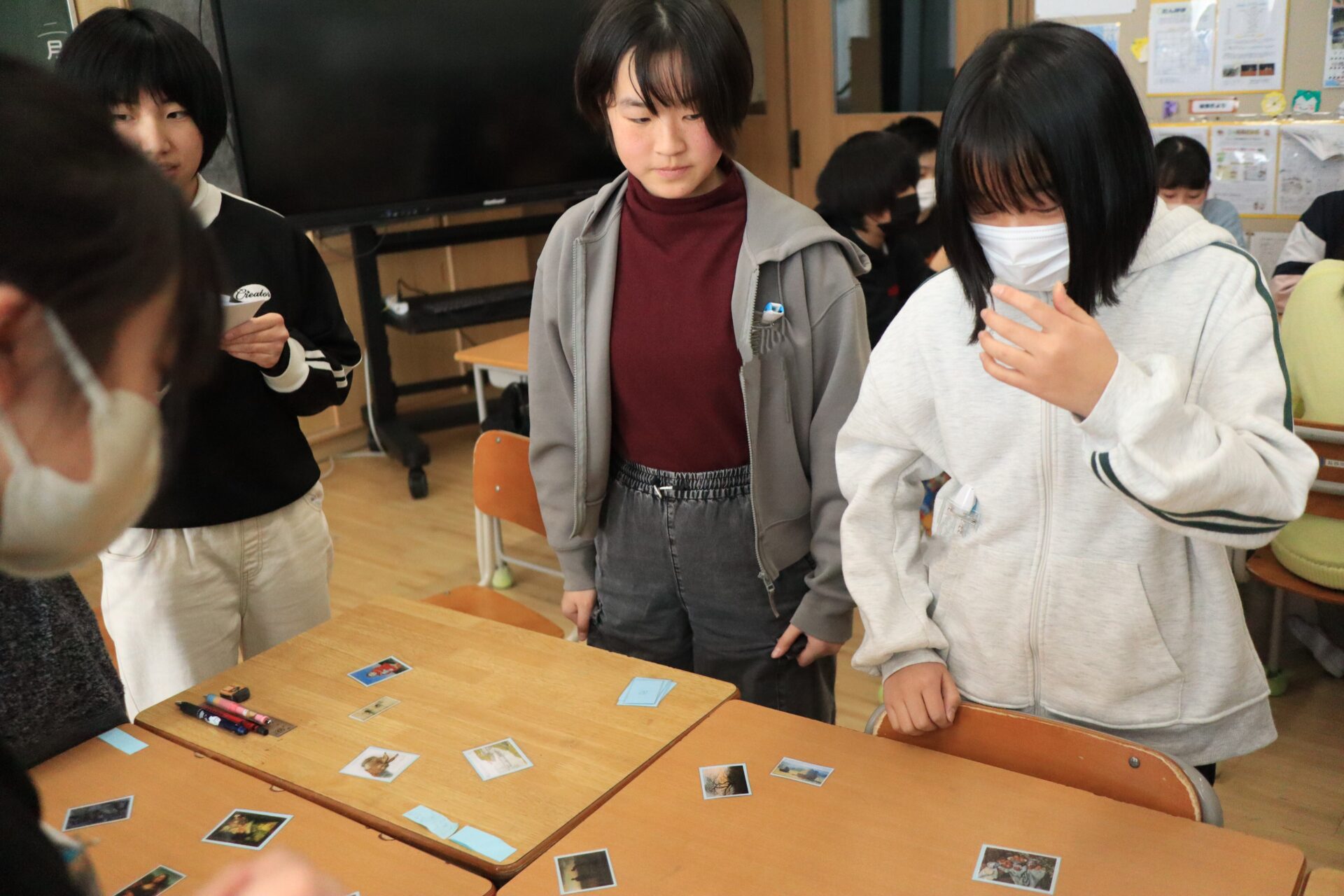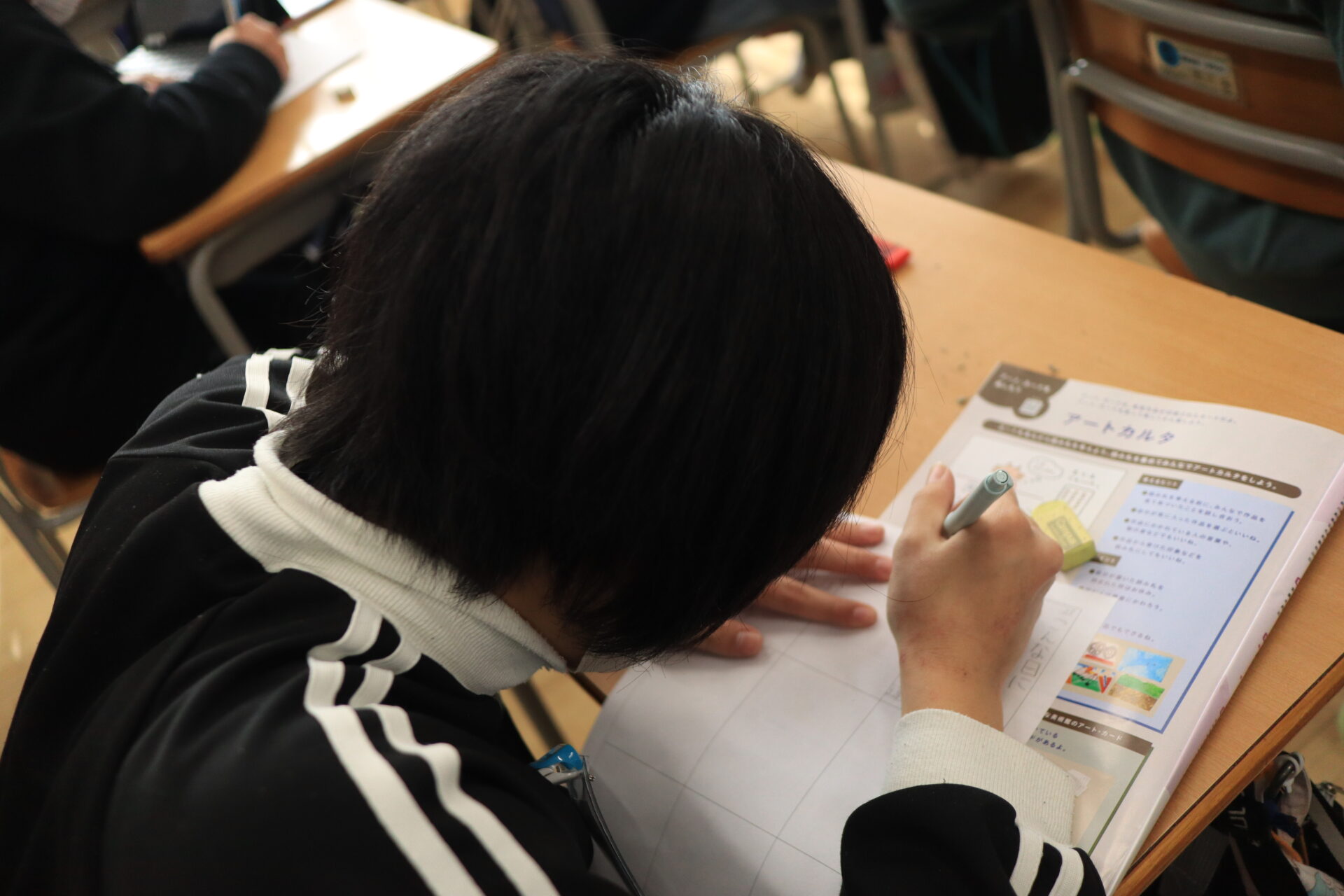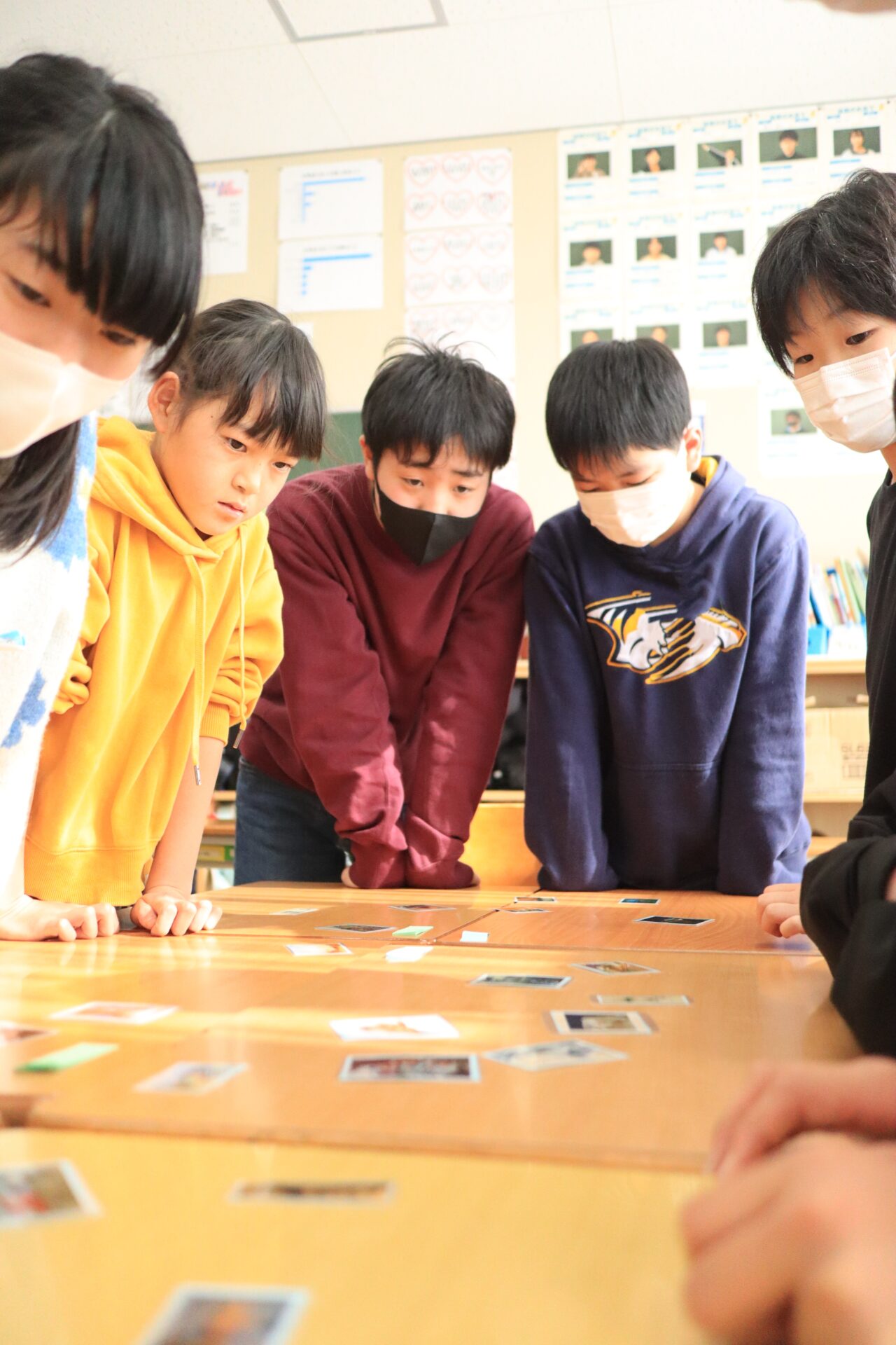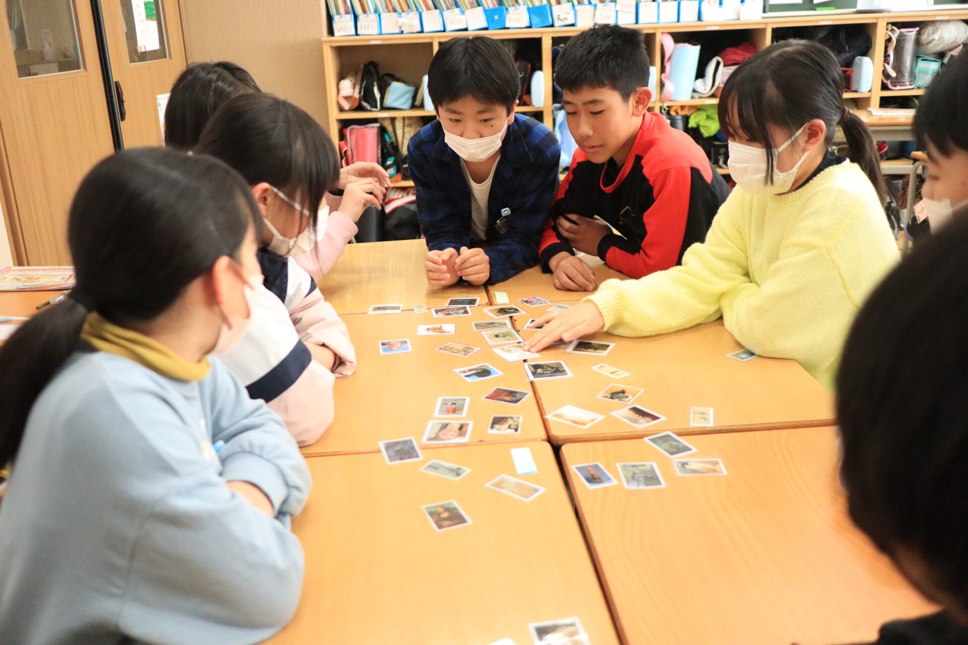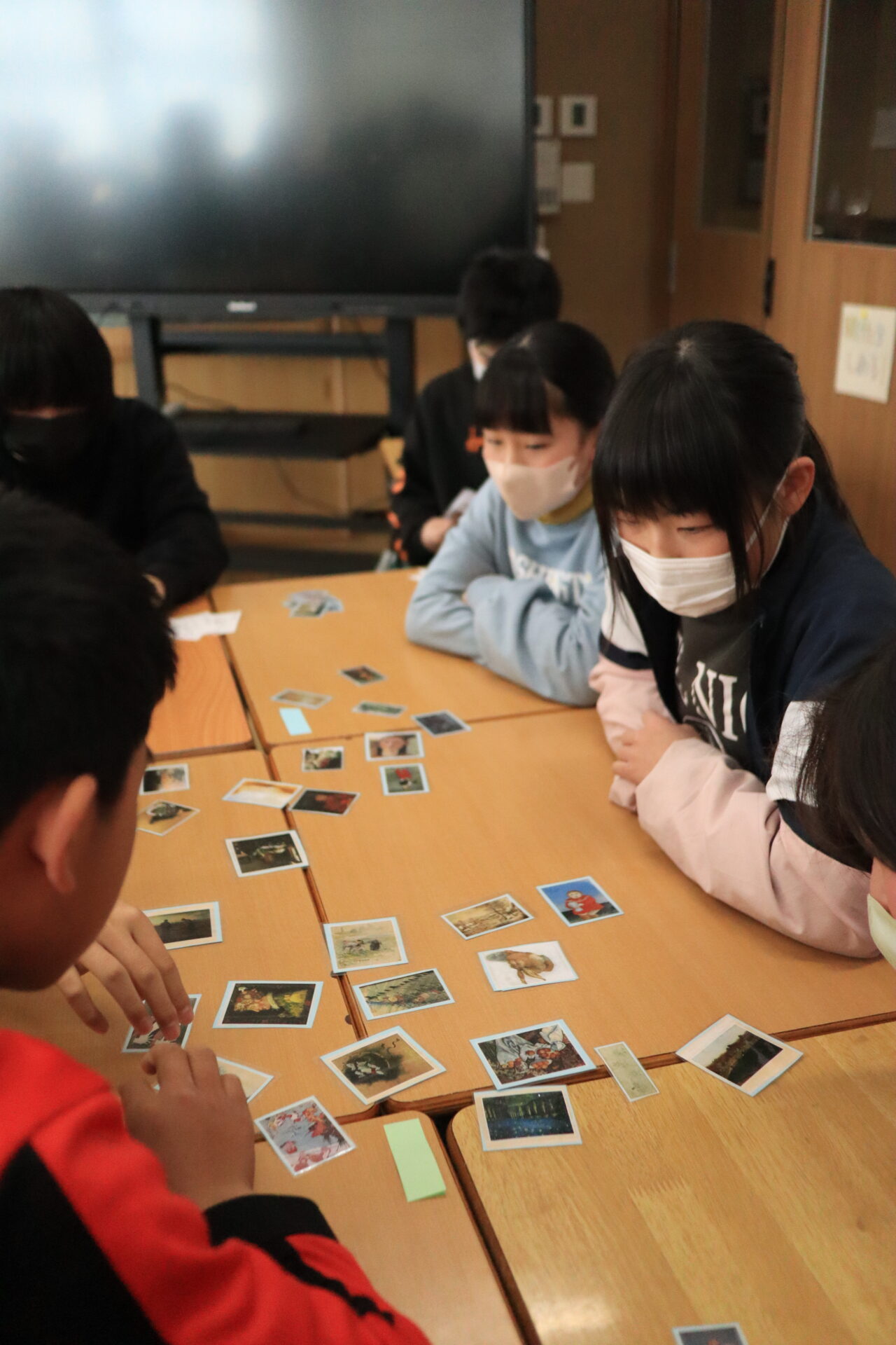 2026.02.06 6年生 全校生 アートカルタ 管理者学校 図工の時間に、様々な国や年代の作品に親しみ、鑑賞の楽しさを味わってもらうために「アートカルタ」を行いました。作品を鑑賞し、五・七・五の読み札を作り、自分の感じたことを言葉に表しました。その読み札を使って「アートカルタ」を行い、自分とは違う感じ方や考え方に触れることで、自分の考え方を広げることができたと思います。 読み札の言葉を想像し、絵札を一致させ「これだ!」と素早く手を出し、絵札を獲得していました。普通のカルタよりも、ちょっと難しい様子でしたが、とても楽しそうに活動していました。 #6年生