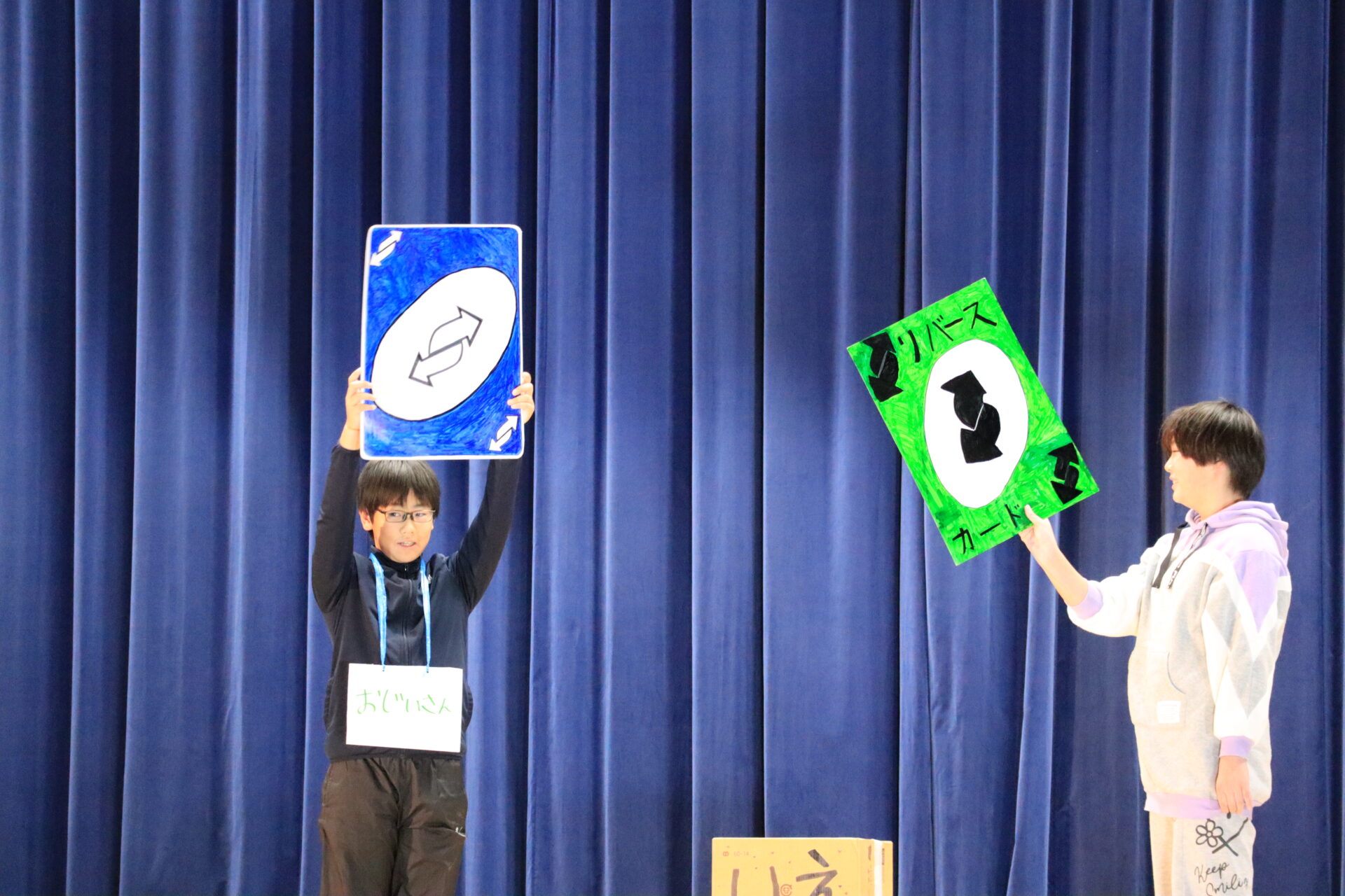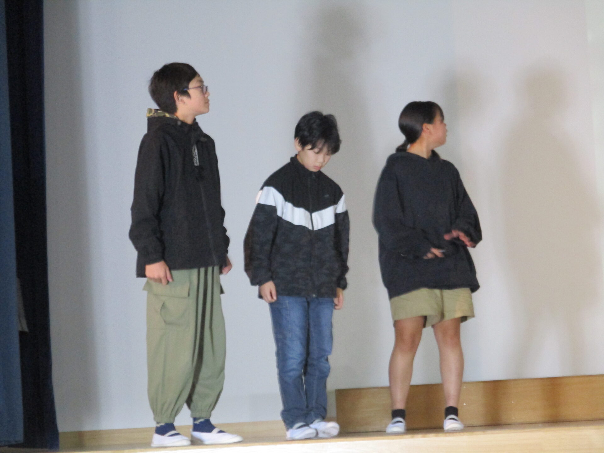 有志発表では、自分たちで全てを考え、オーディションを受けて、今日の舞台に立ちました。忙しい中、自分たちで考え、台本や道具を作っている様子が見られました。オーディションのときよりもおもしろくなっていたり、楽しそうに踊っていたりなど何倍もよくなっていました。会場からは手拍子や笑い声が聞こえてきて嬉しかったようです。
