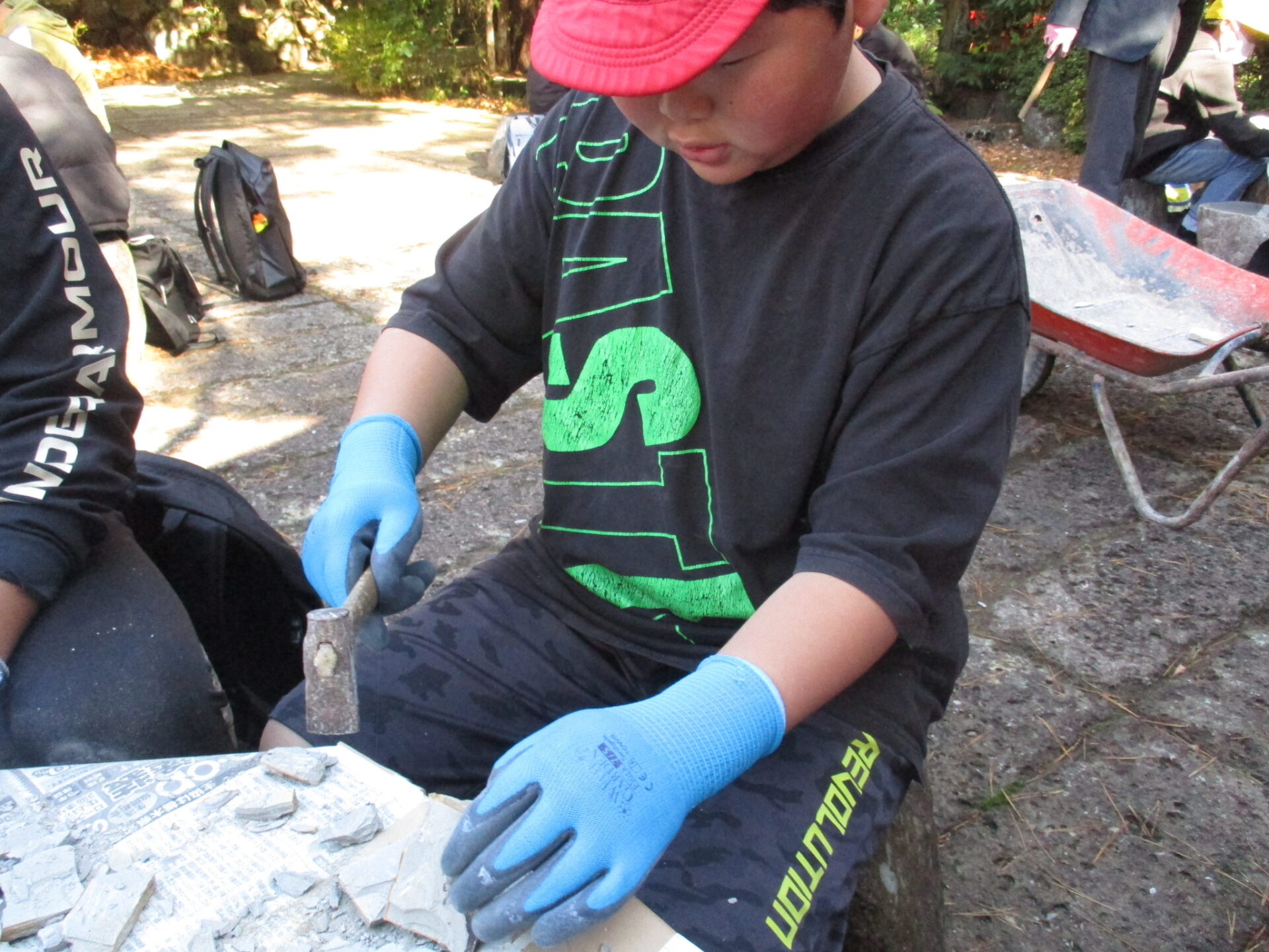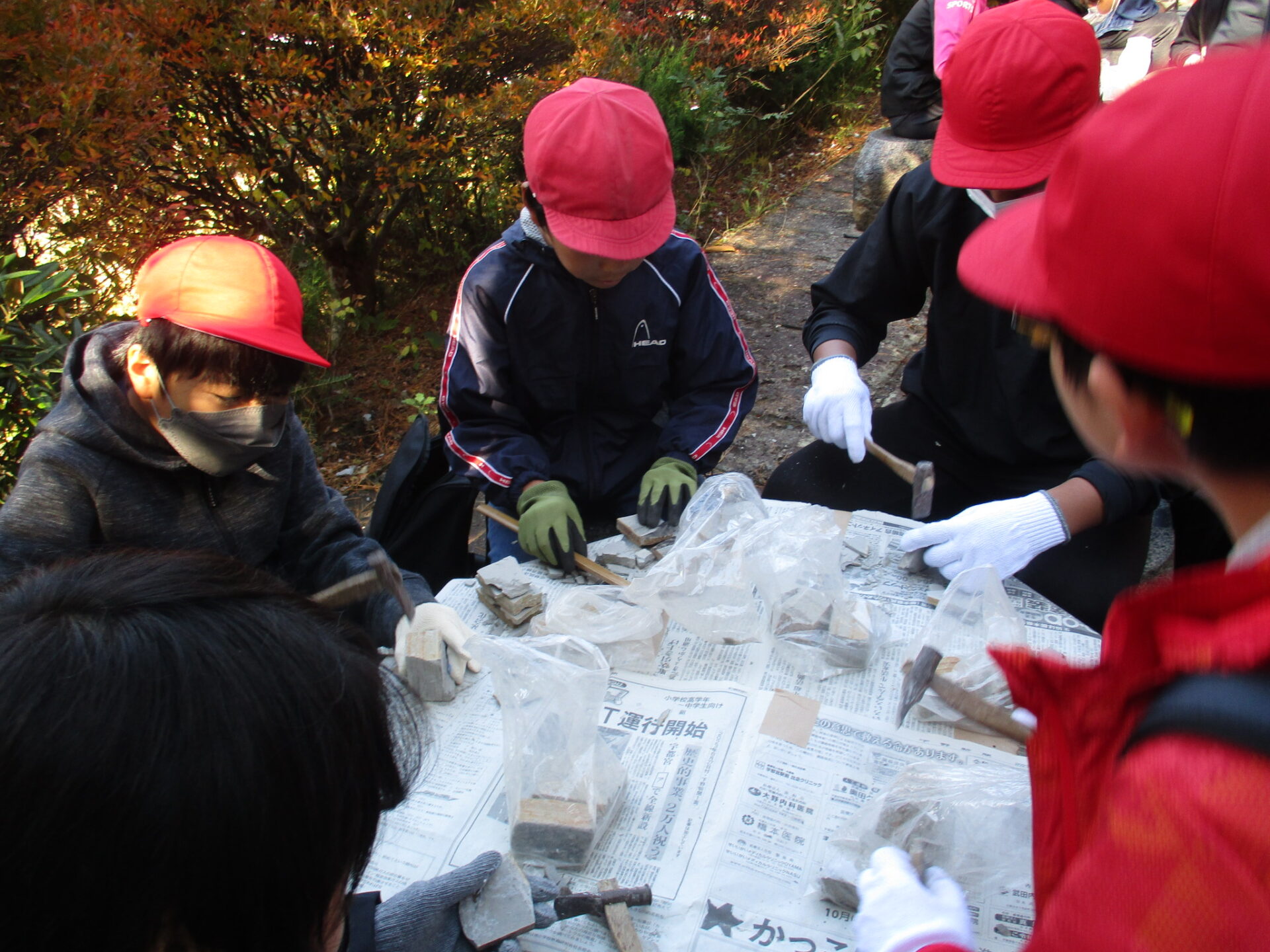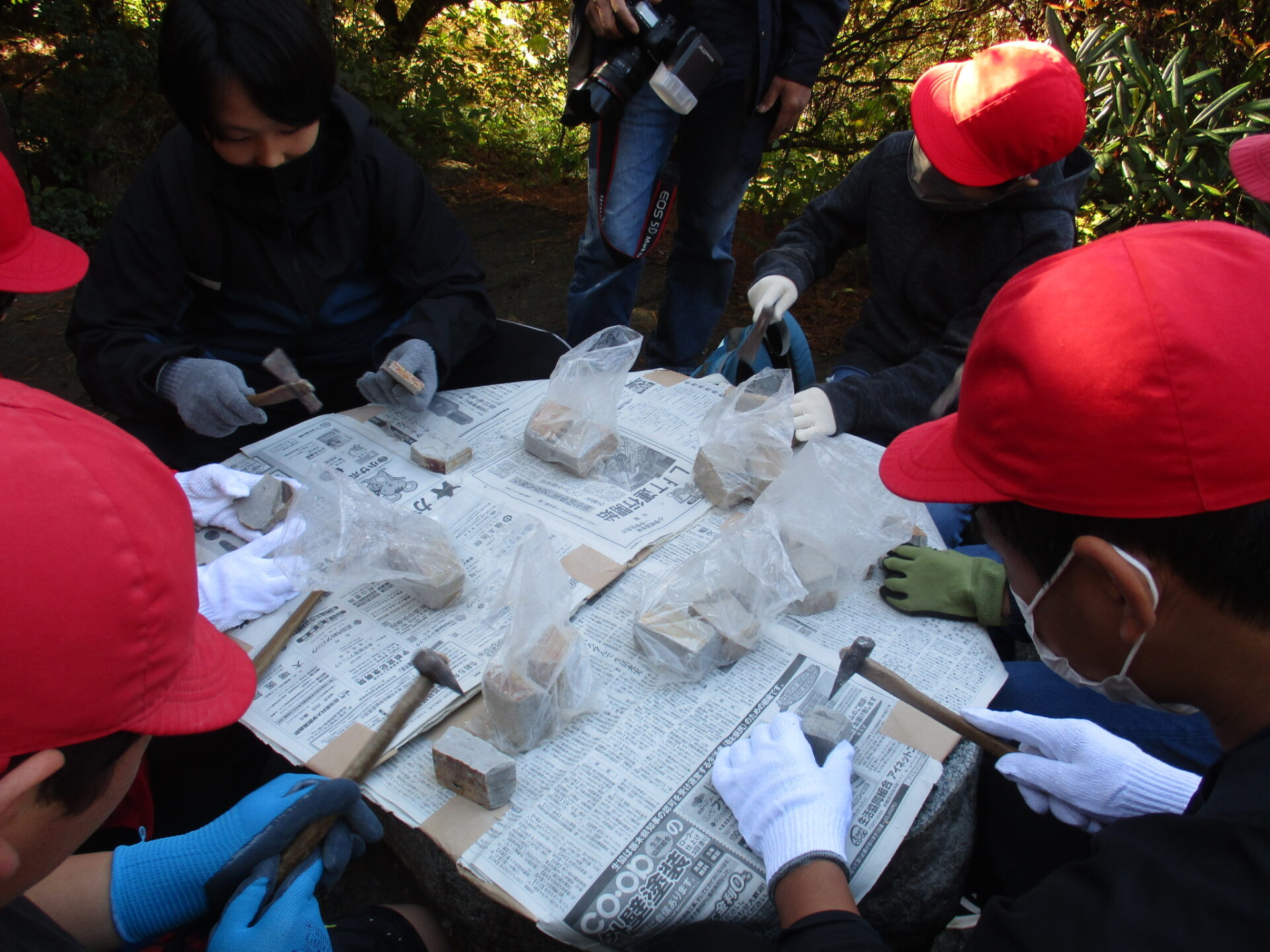 理科見学では、材木岩を見たり、地層を見たりしました。その中でも、子どもたちが一番楽しみにしていたのは、木の葉化石園での化石発掘体験です。残念ながら動物の化石を見つけることができた人はいませんでしたが、いろいろな大きさの葉っぱの化石を見つけることができました。本日、化石を持ち帰っていますので、ぜひ、お子さんにどうだったか聞いてみてください。