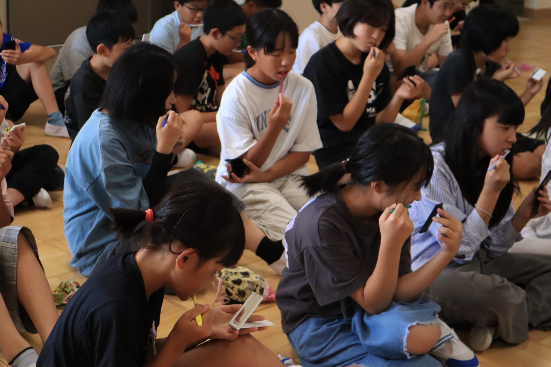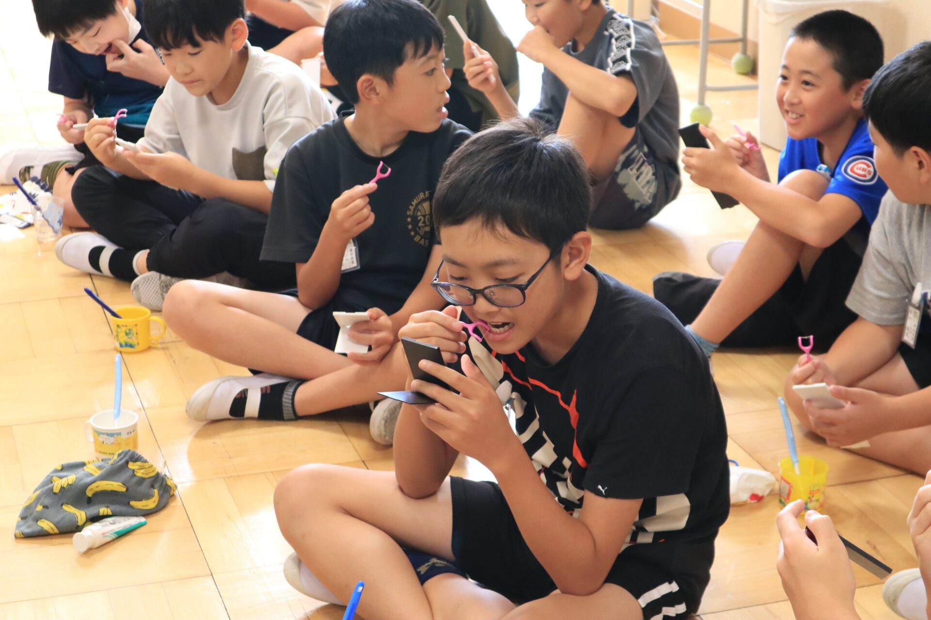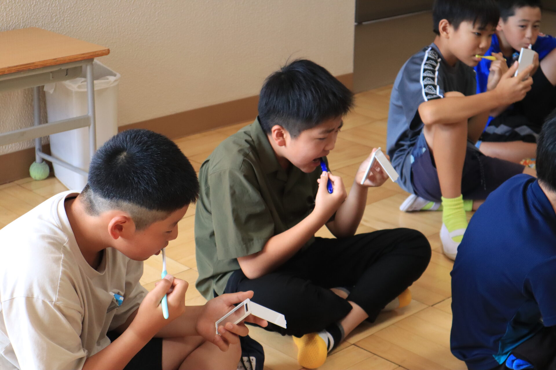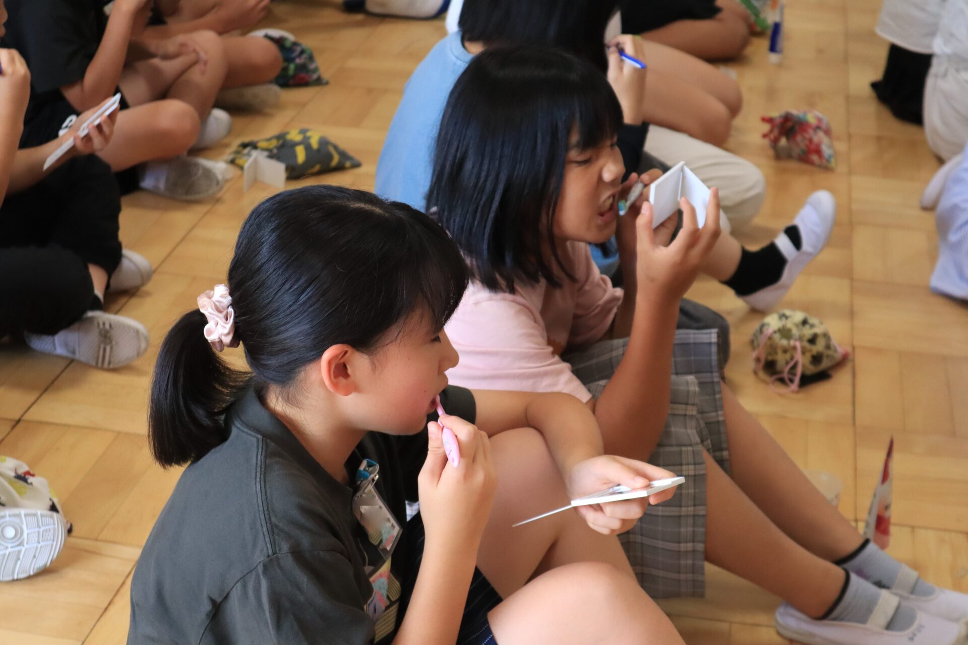2025.09.03 6年生 歯科指導 管理者学校 今日は5・6年生で、歯について勉強しました。「歯は大切」と分かっていても、しっかり磨けていなかったり、歯周病を予防できていなかったりすることに気付くことができました。鏡で歯を見ながら歯茎を確認したり、フロスを使って歯と歯の間をきれいにしたりしました。これからも歯を大切にするためには、今まで以上に丁寧に歯を磨く必要があります。家でもしっかり磨き、フロスも使いましょう! #6年生