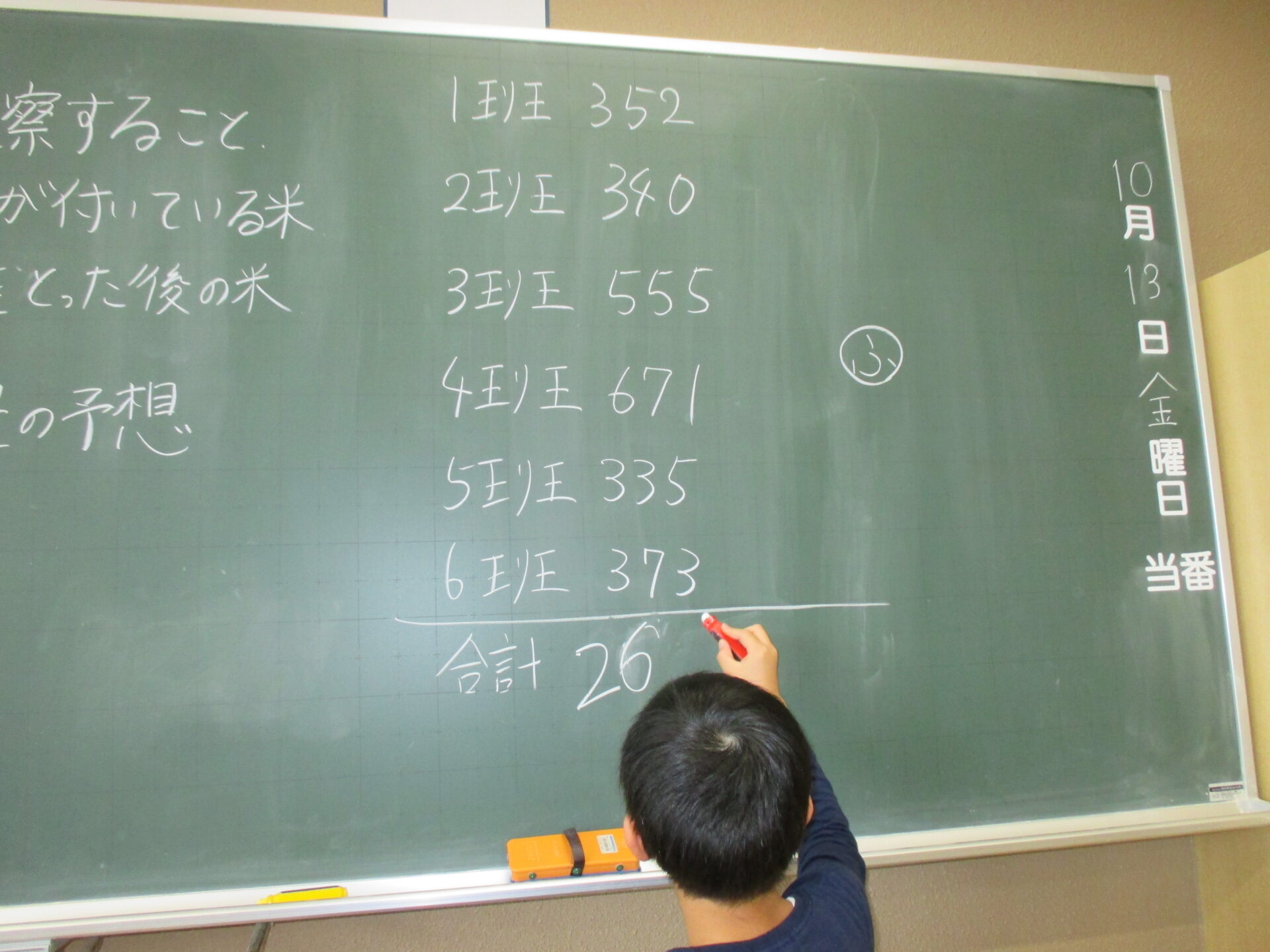 大きく育った稲に米は何粒できているのでしょうか。子供たちと一粒ずつ数えてみました。