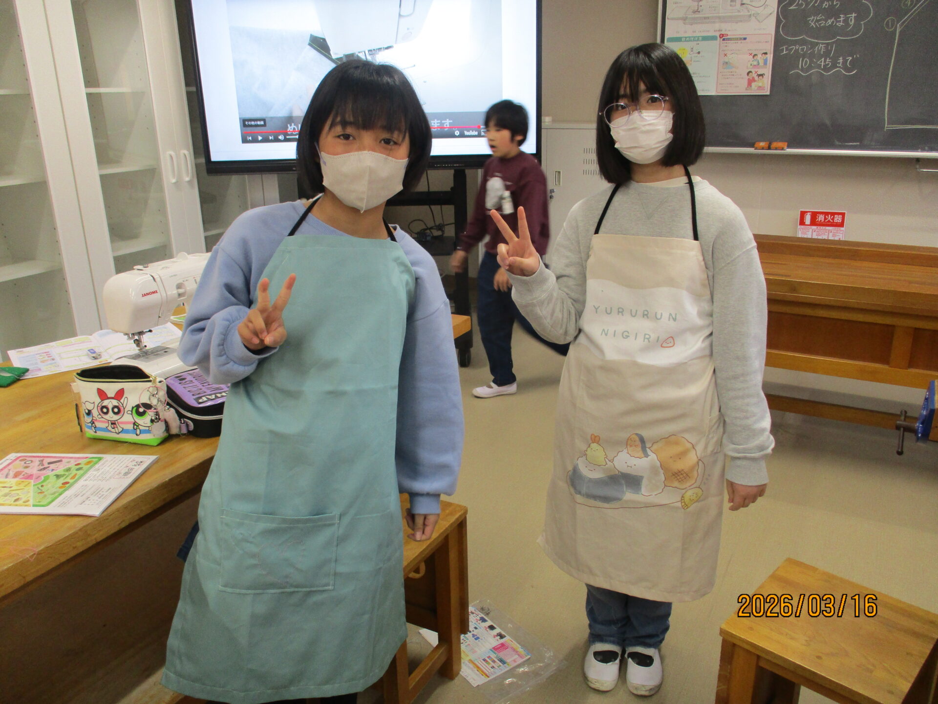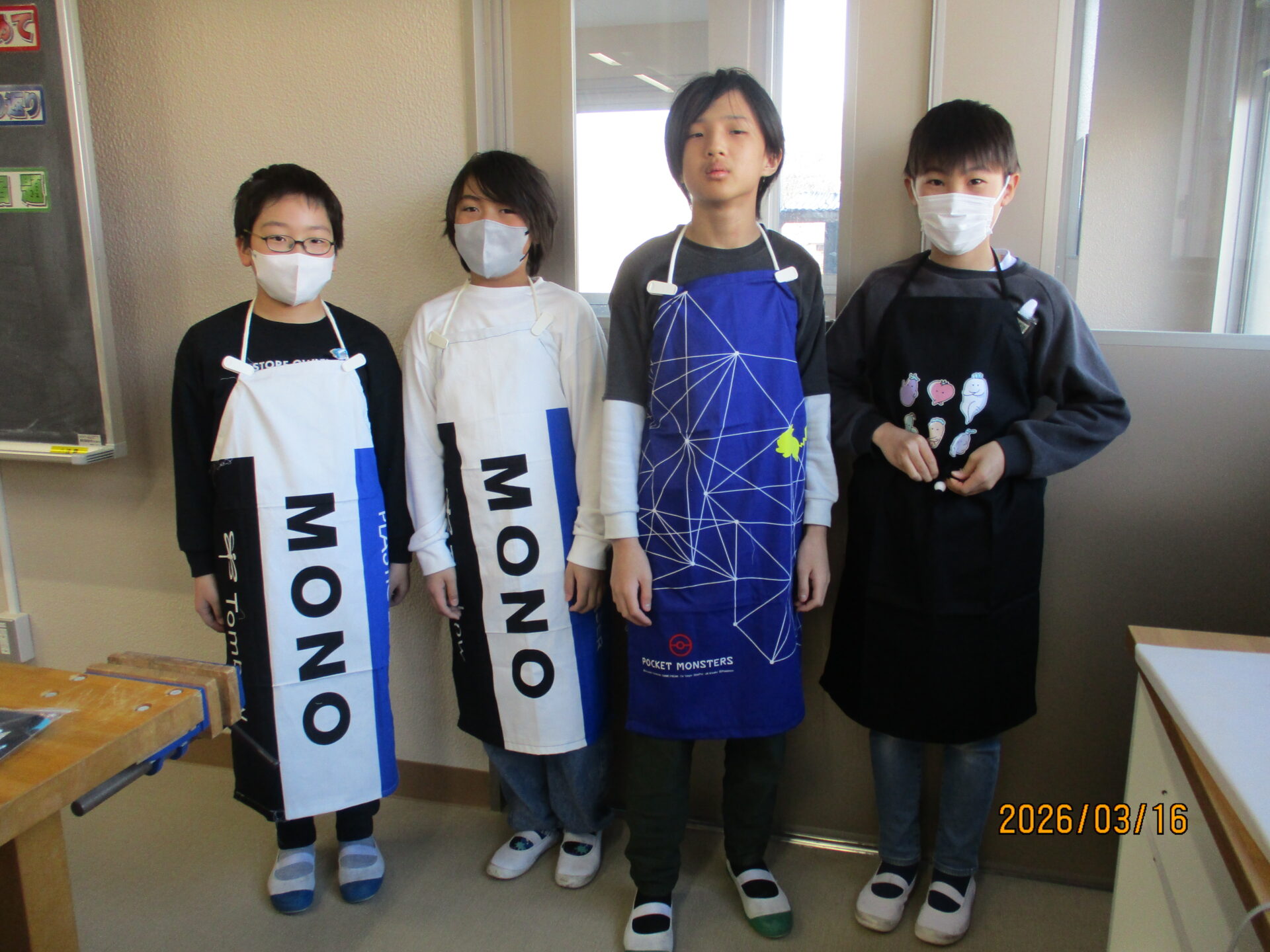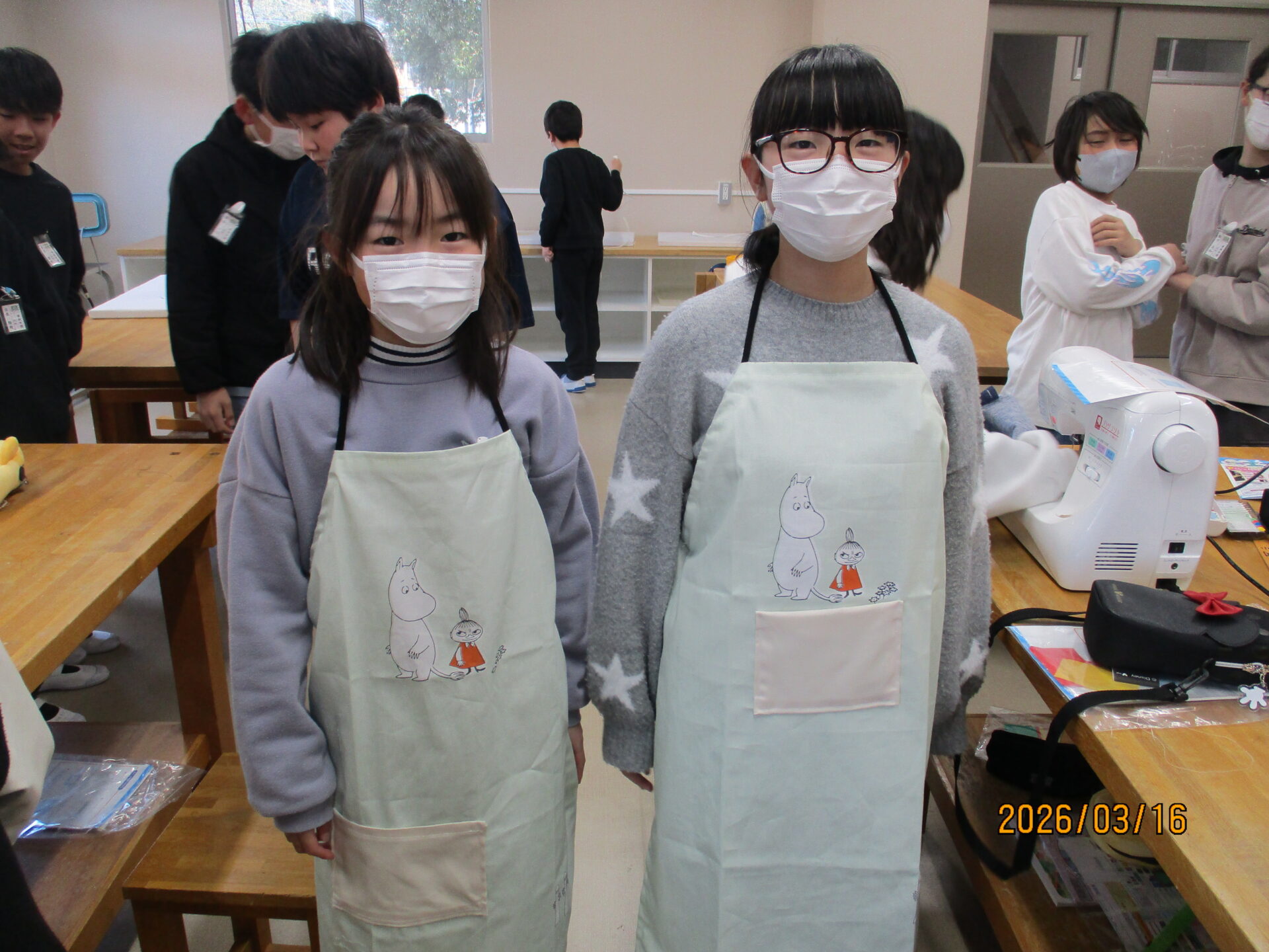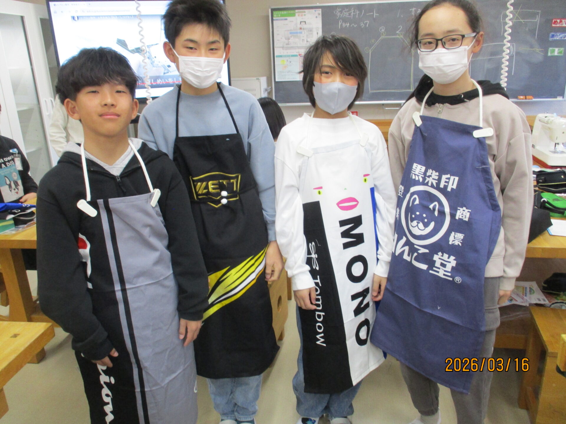 今日ついにエプロンが完成しました。ポケットをつけたり、模様をつけたりと一人一人が工夫して作りました。明日、エプロンを持ち帰りますのでぜひ、ご覧になってください。