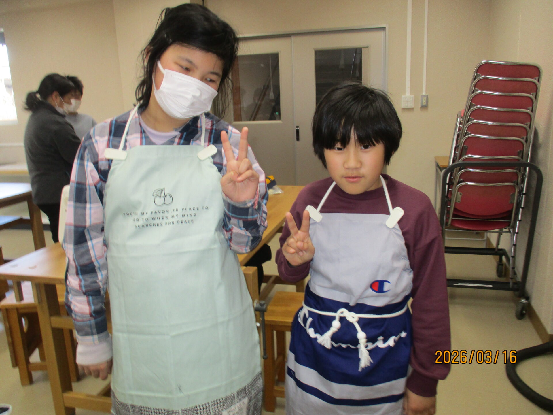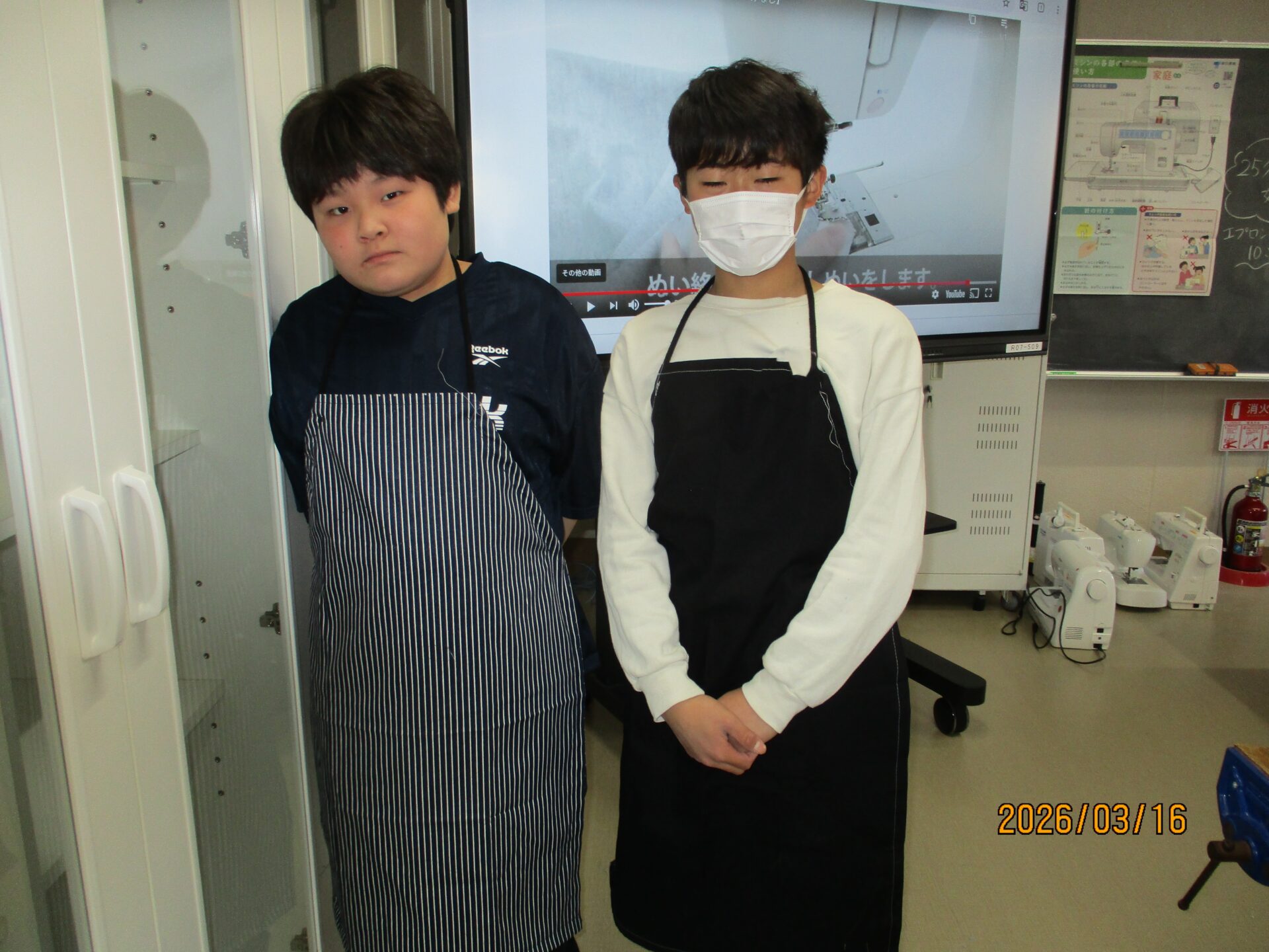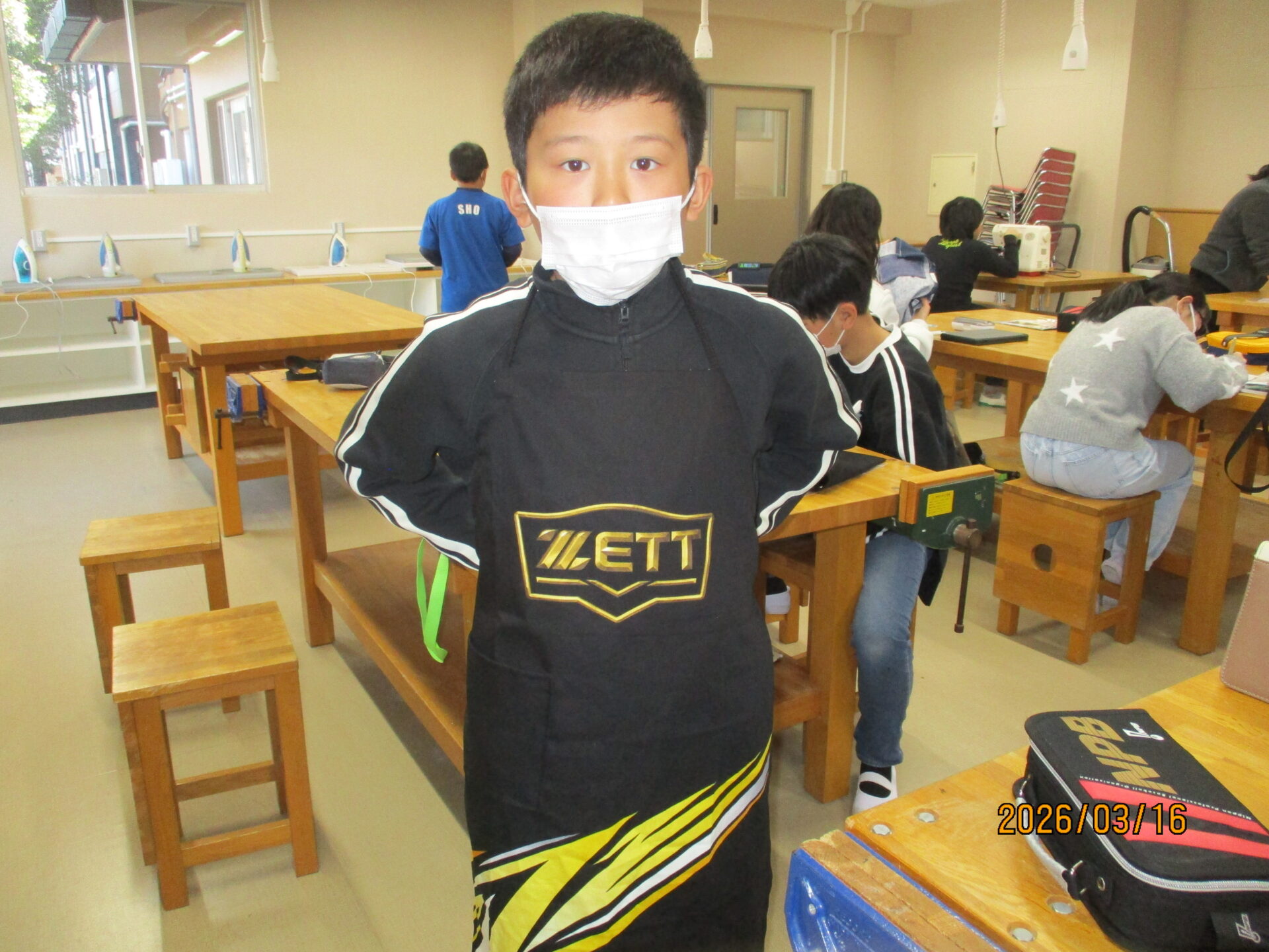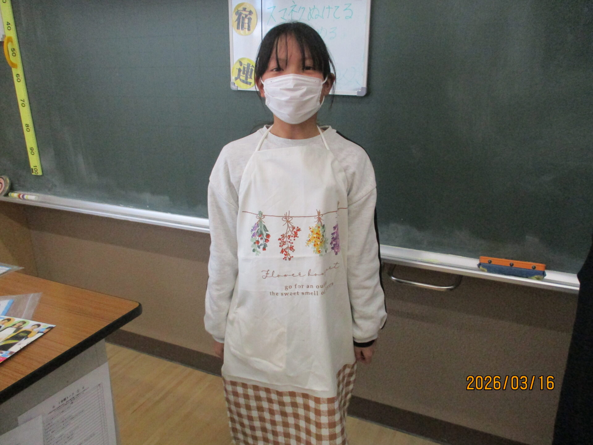 今日ついにエプロンが完成しました。ポケットをつけたり、模様をつけたりと一人一人が工夫して作りました。明日、エプロンを持ち帰りますのでぜひ、ご覧になってください。