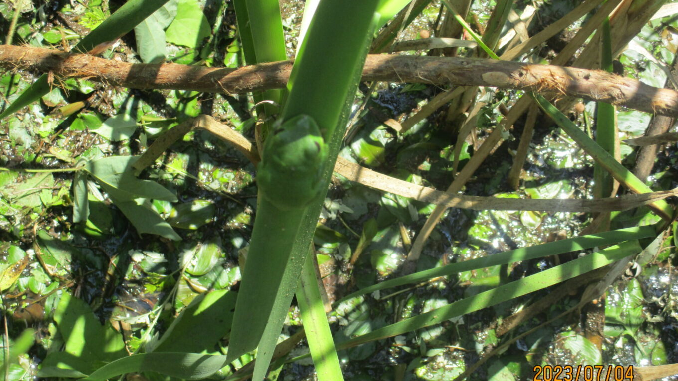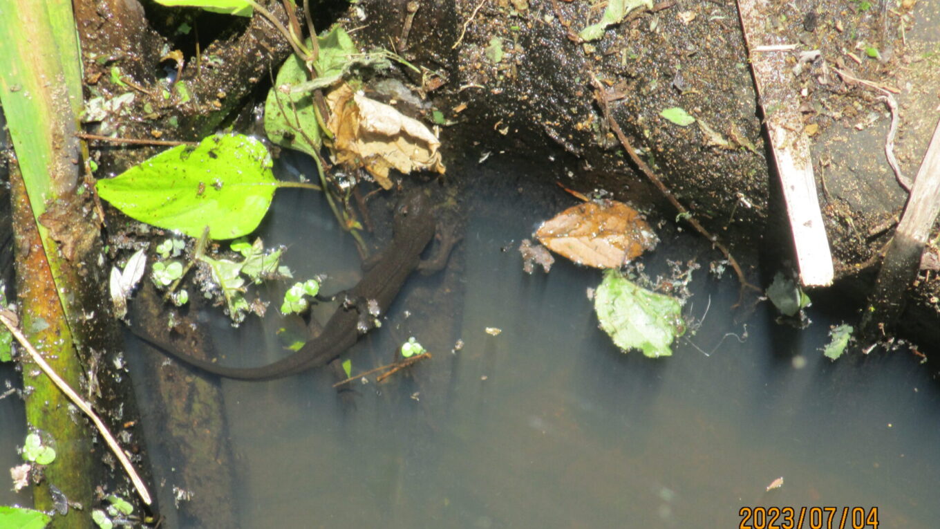 さらに周りを見ると成体もいました。モリヤマガエルの成体をこのビオトープで見つけるのは初めての事だそうです。
