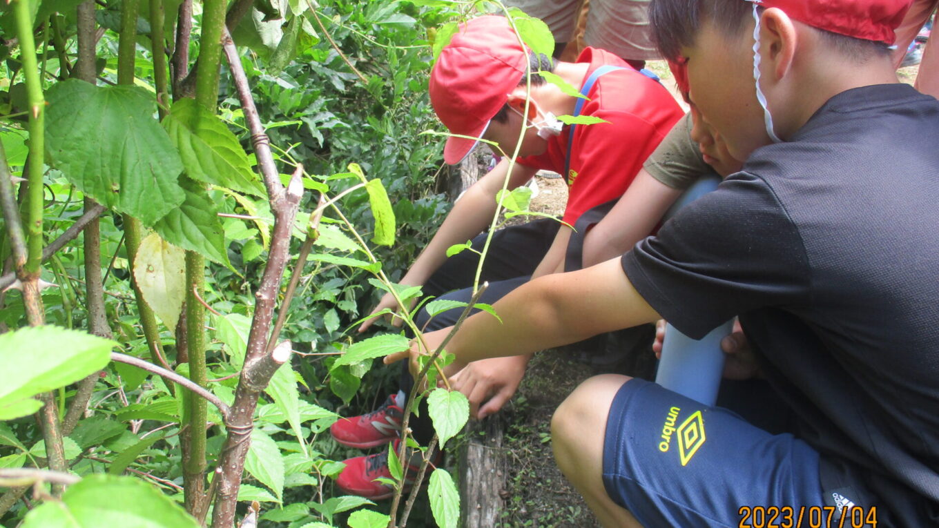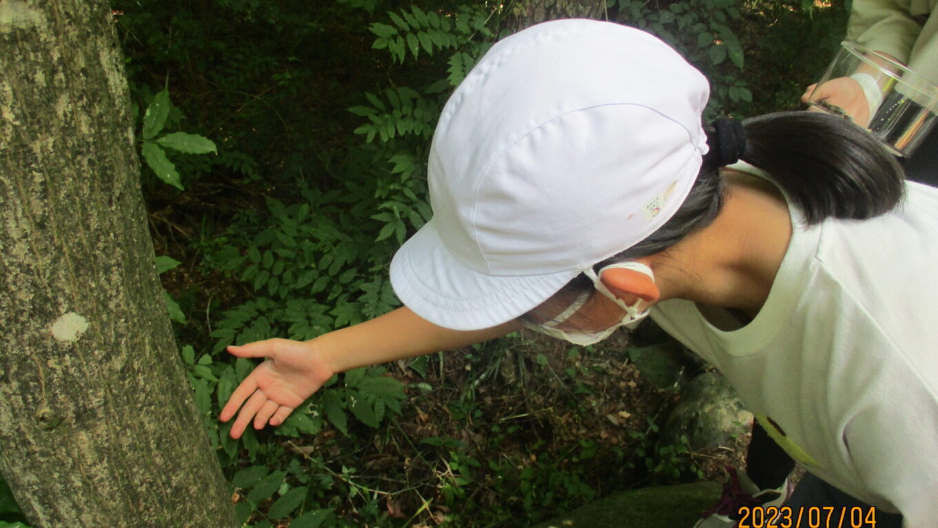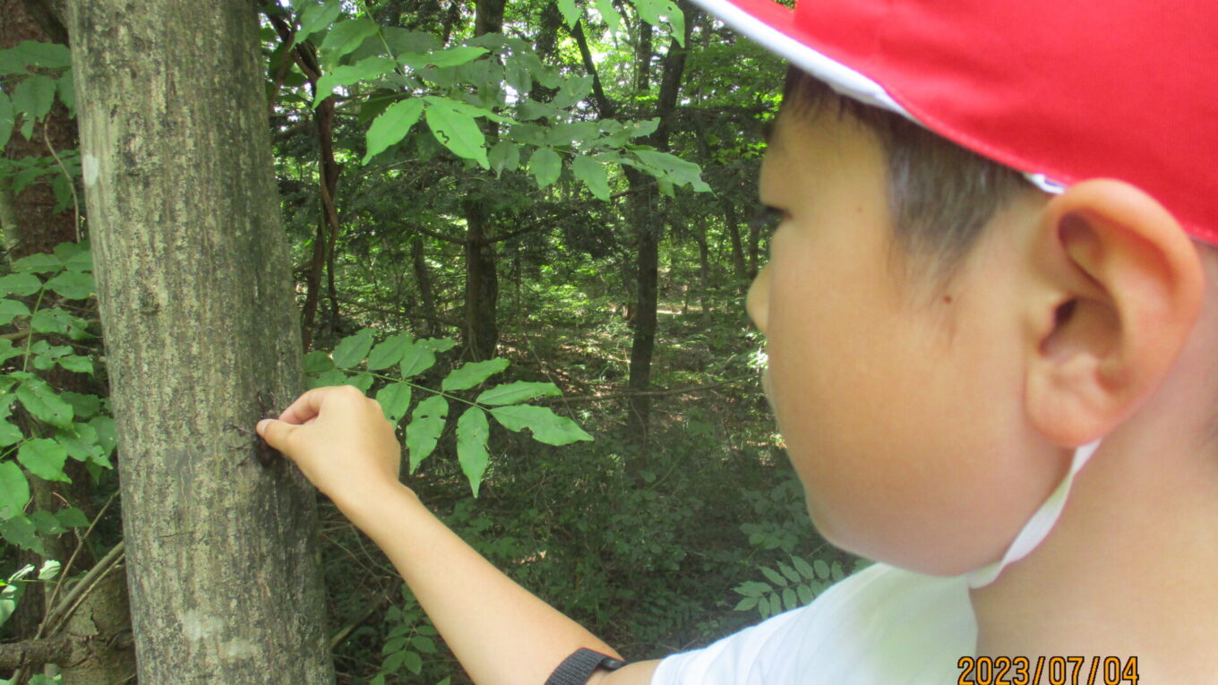 その後はクワガタを森に放しました。放虫会は、クリーンセンターを作るために森を切り開いたことで減ってしまった生き物を再び増やすことを目的として行われています。