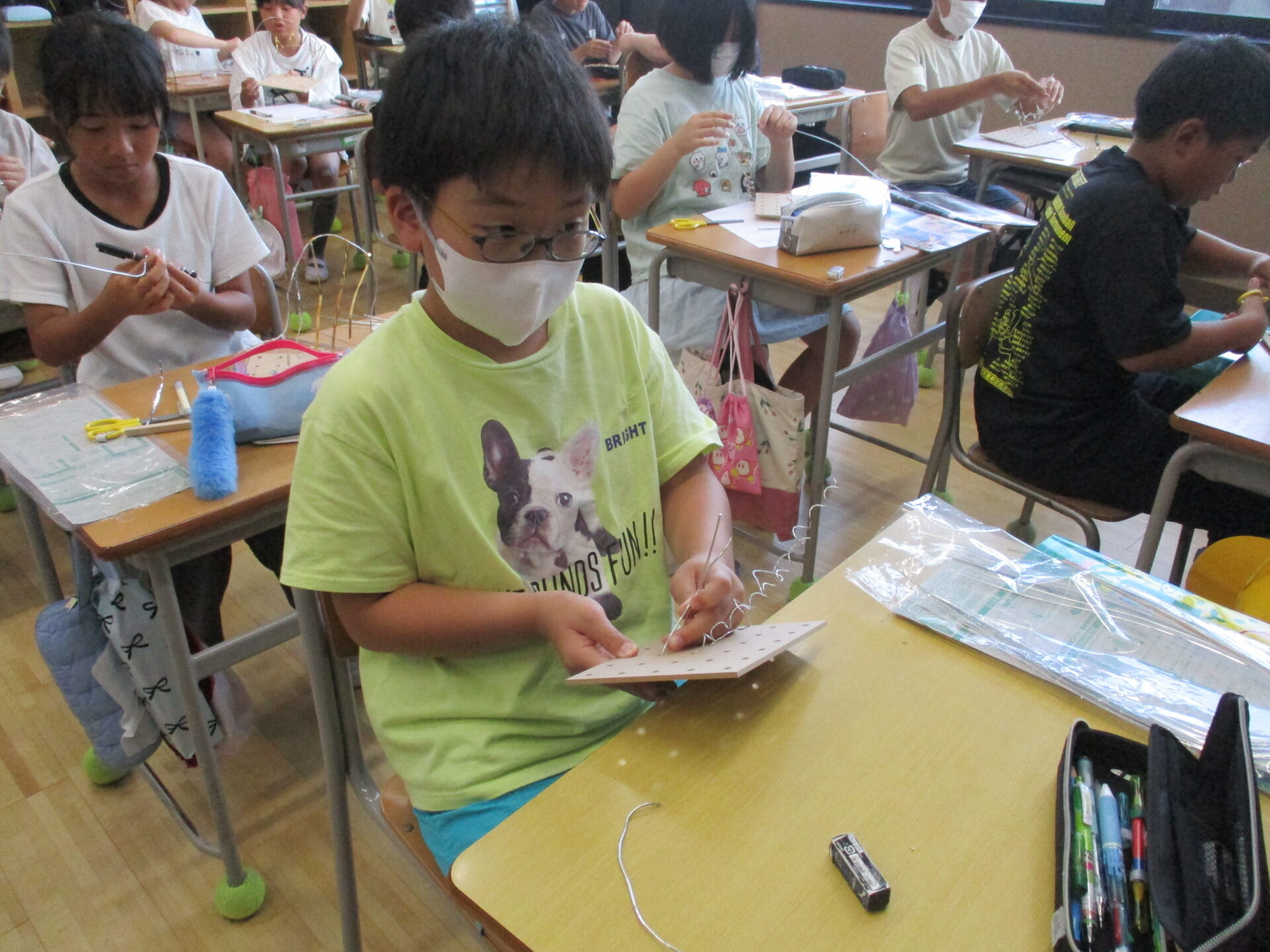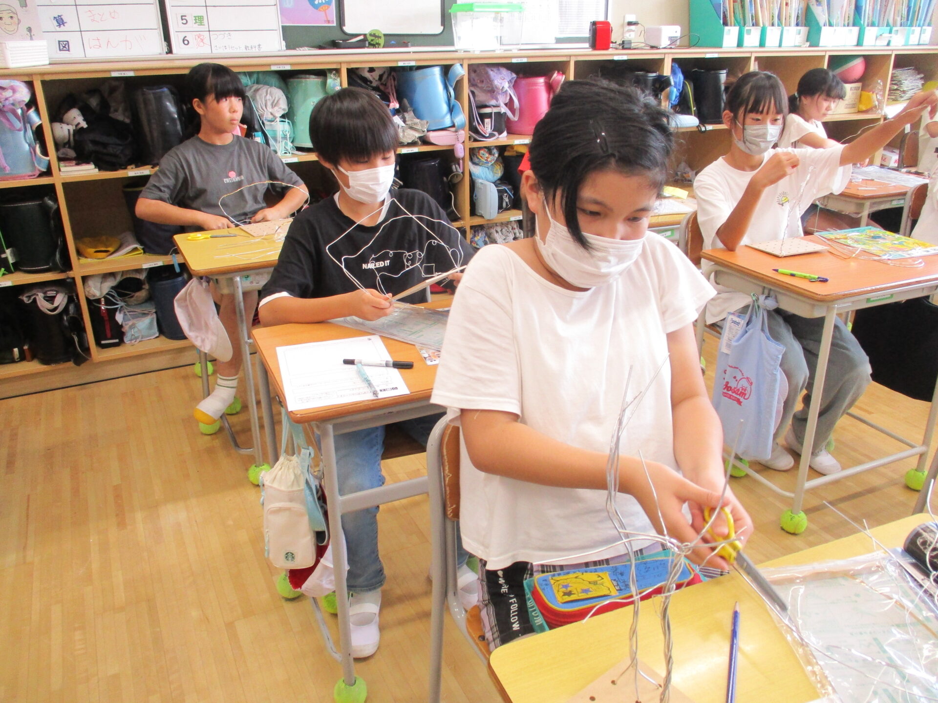 2025.09.01 5年生 学校公開&図工新単元「ワイヤーアート」 管理者学校 本日は、学校公開があり、5年生は、家庭科と書写の授業を公開しました。家庭科では、本日から小物作りに入りました。子どもたちの作品作りの協力をしてくださった保護者の皆様ありがとうございました。これから完成を目指して頑張りたいと思います。 また、図工の時間では新しい単元の「ワイヤーアート作り」に取り組みました。針金を思うがままに曲げたり、くっつけたりしながら作品作りを始めました。 家庭科も図工も作品が完成しましたらまたホームページにてお知らせしたいと思います。 #5年生