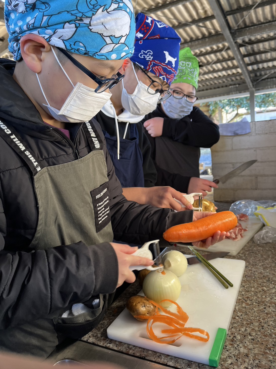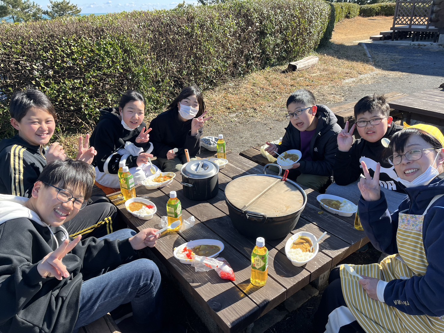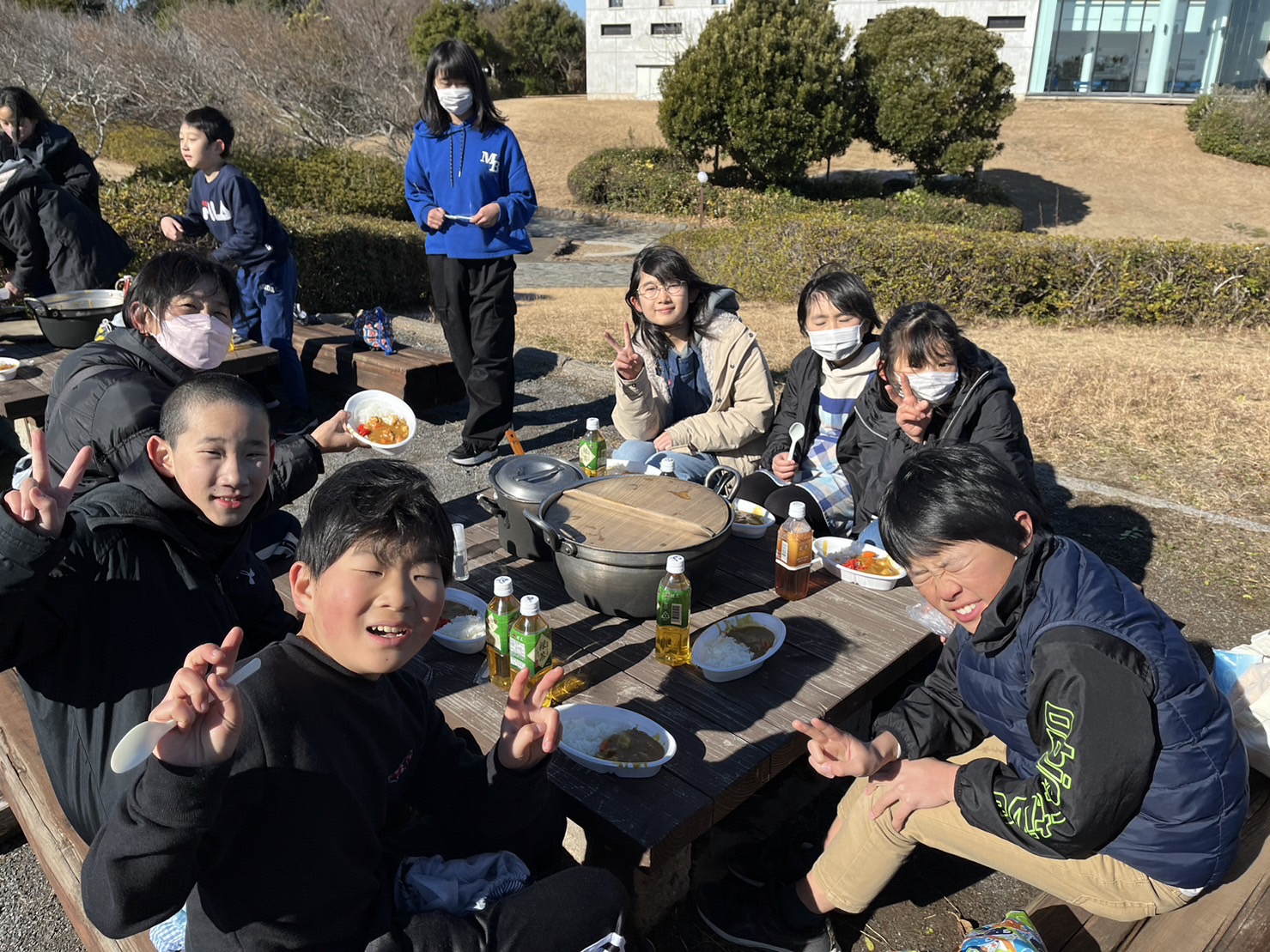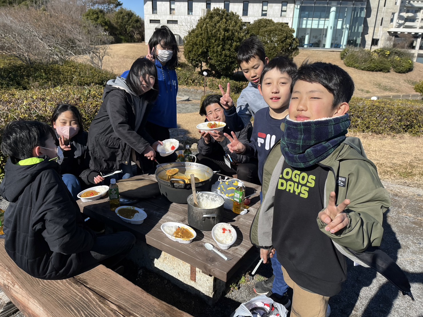 2024.01.24 5年生 臨海自然教室④ 管理者学校 9:00から、楽しみにしていた野外調理にトライしました。メニューは【ポークカレー】です。 極寒の中での野外調理。準備や後片付けは大変でしたが、カレーの味は、頑張った分最高でした! 写真を見ると本当に寒そうですが、5年生の顔は満足感や達成感で輝いています。残り一日半、頑張れ! ちなみに箒根学園付近は、雪が降っていて校庭が白くなってきました。明日は雪だるまがあちこちで作れそう? #5年生