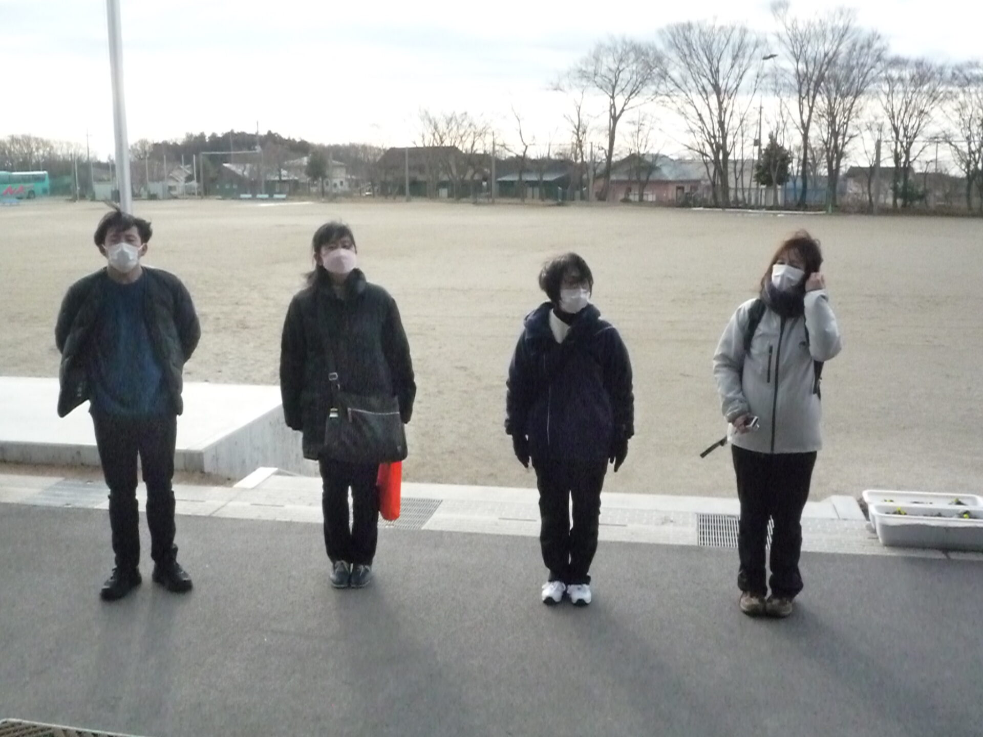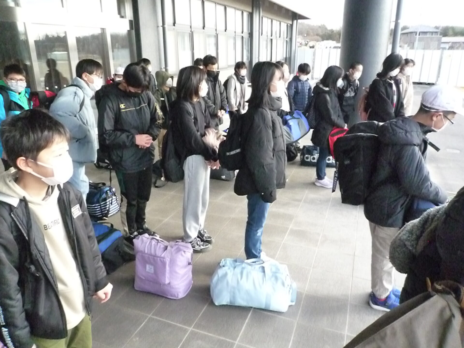 8:40 出発式です。司会者がてきぱきと進行していきます。学園の昇降口付近は、風の通り道なのか、強い風が吹き抜けていきます。