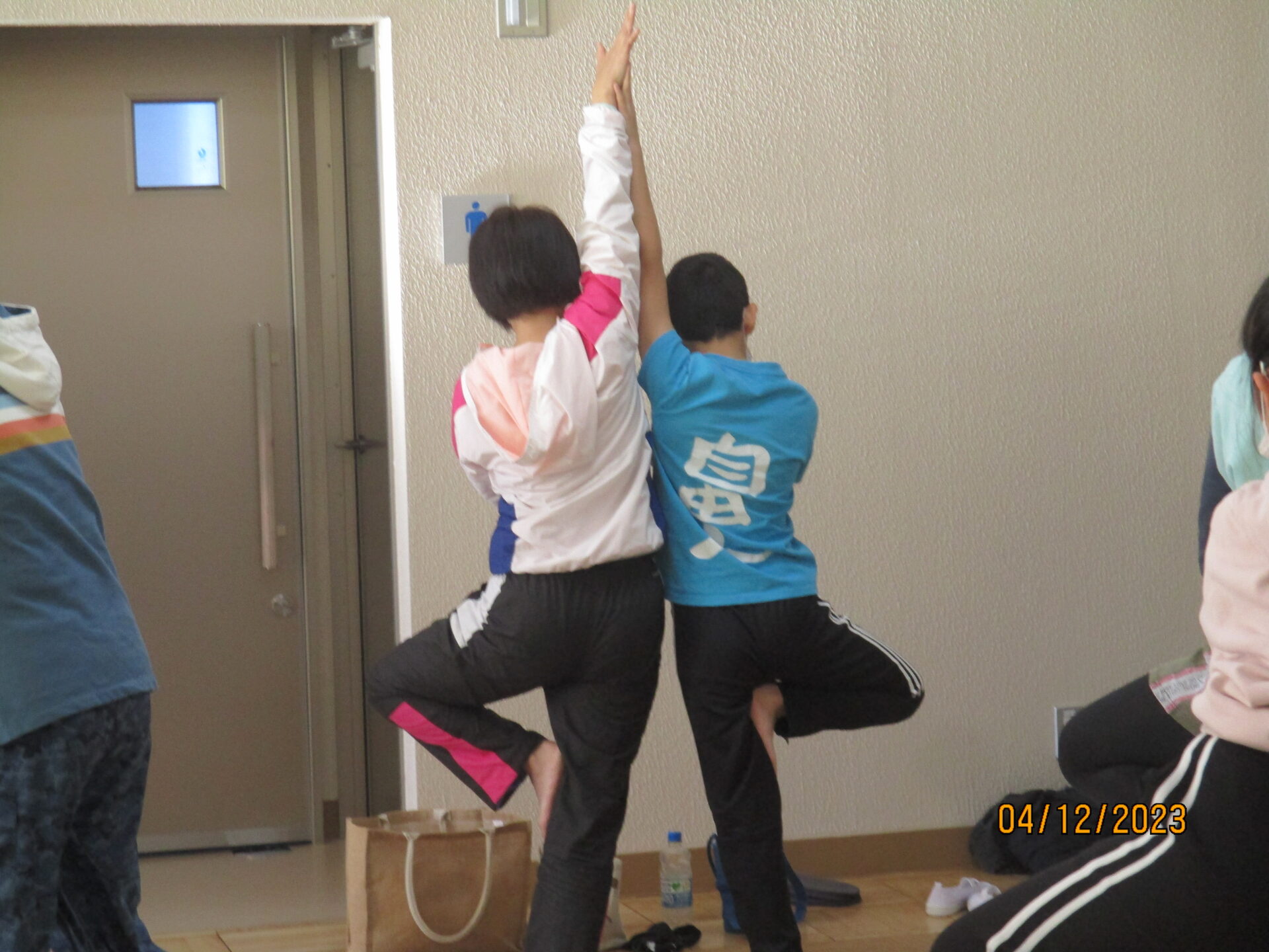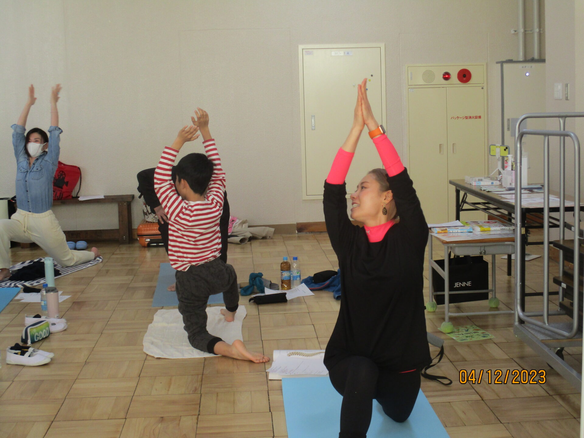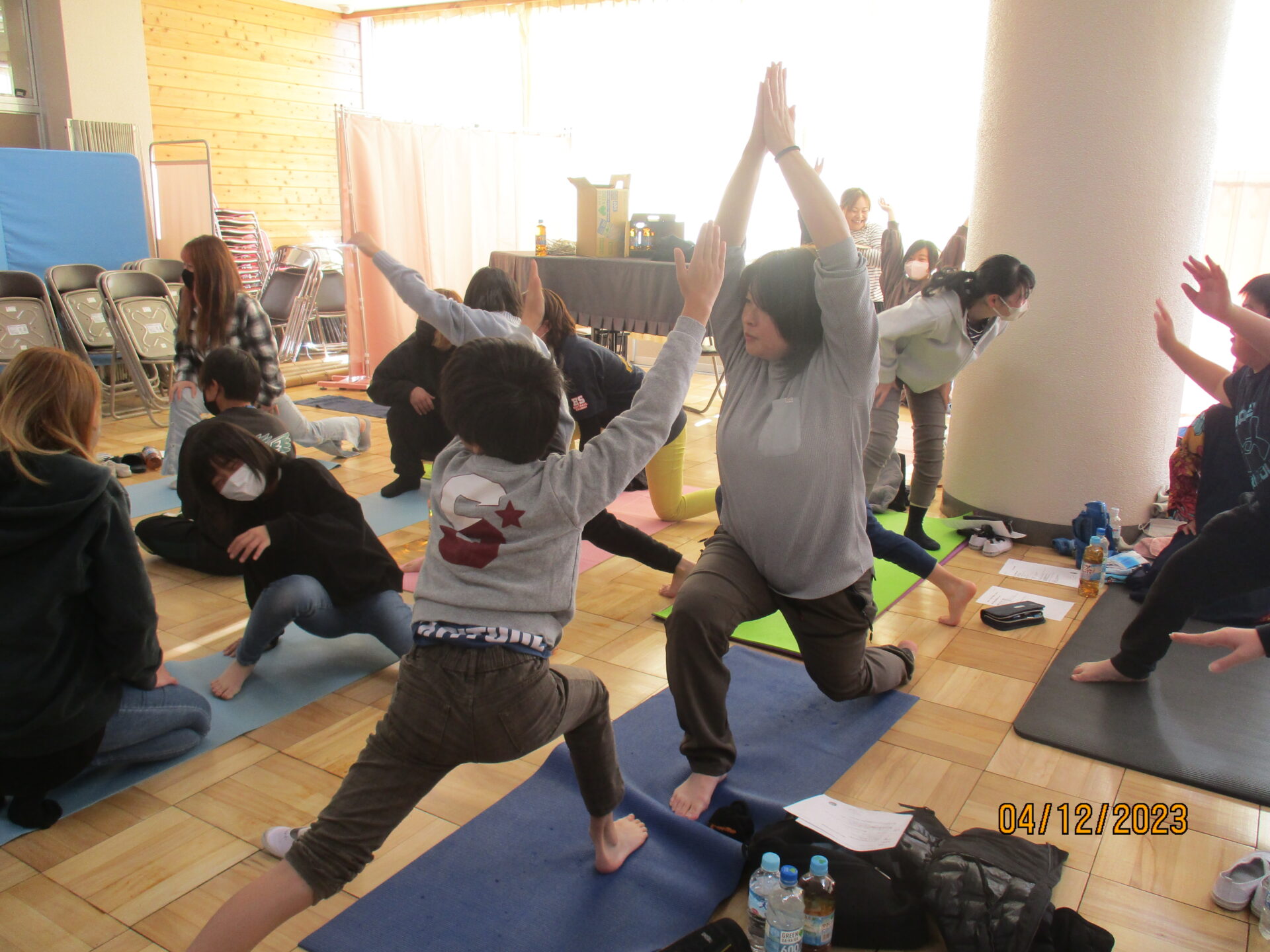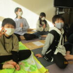 親子学習会で教えていただいたポーズは、キャットアンドカウ、ダウンドッグ、三日月のポーズ、ローランジ、チェアポーズ、立木のポーズ、シャバーサナです。