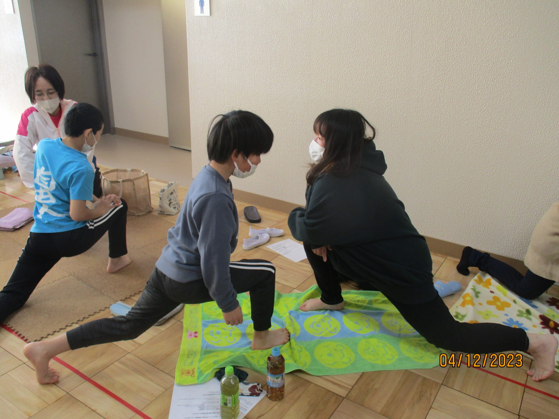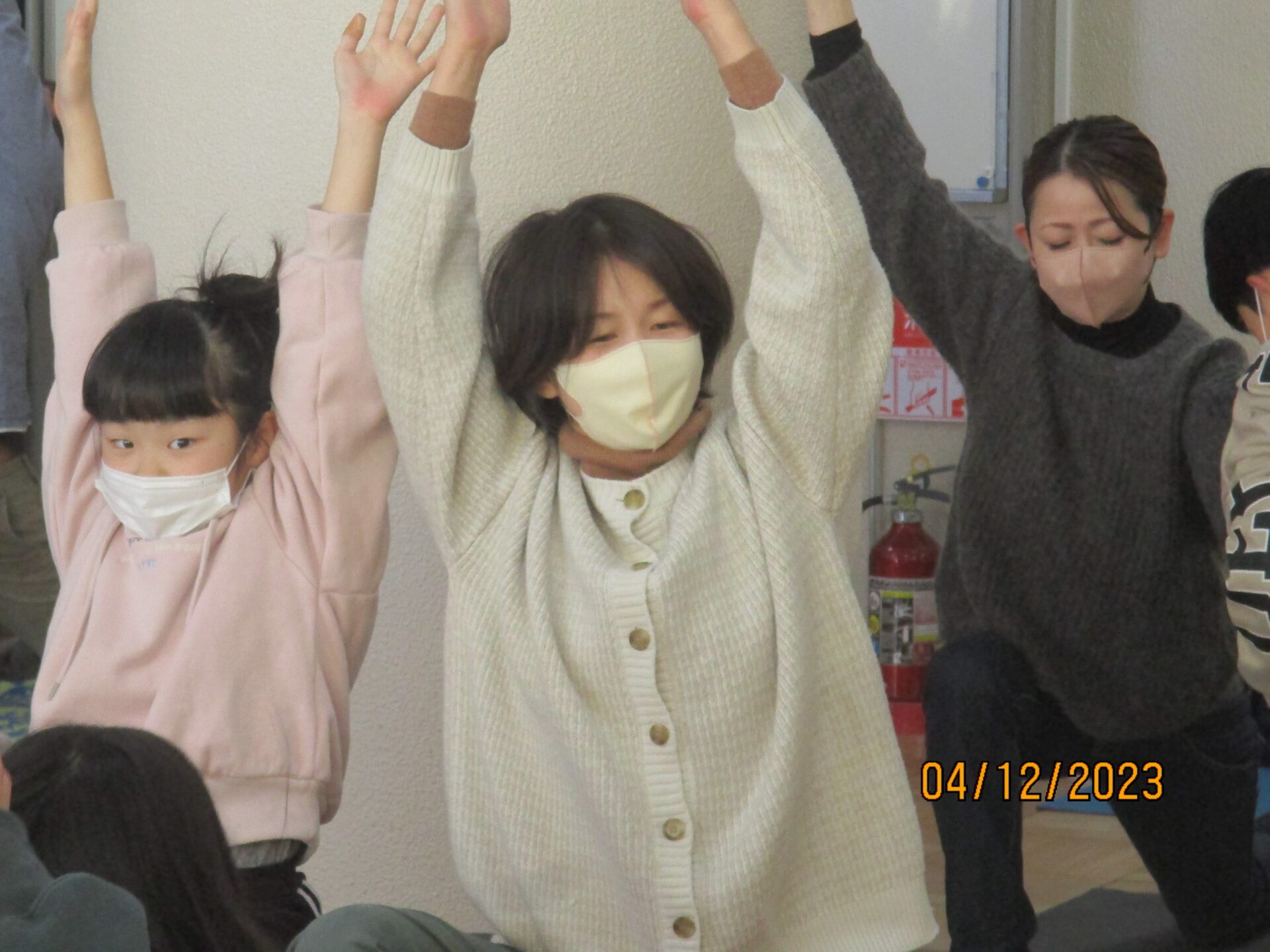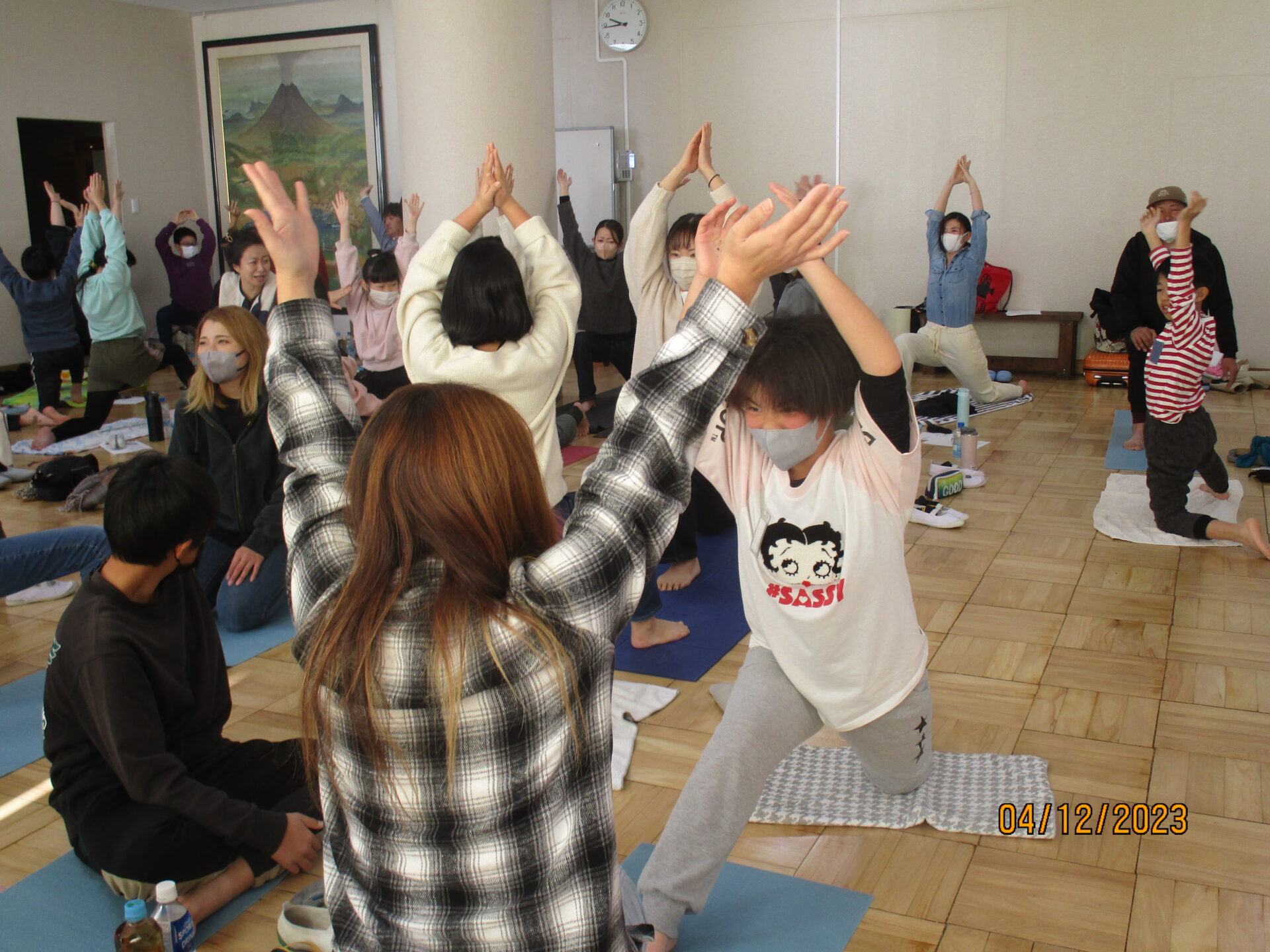 親子学習会で教えていただいたポーズは、キャットアンドカウ、ダウンドッグ、三日月のポーズ、ローランジ、チェアポーズ、立木のポーズ、シャバーサナです。