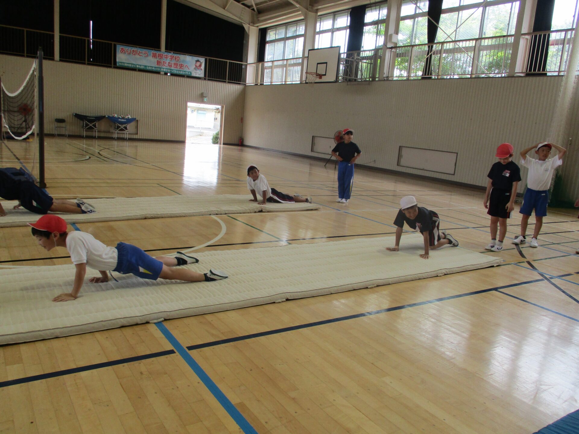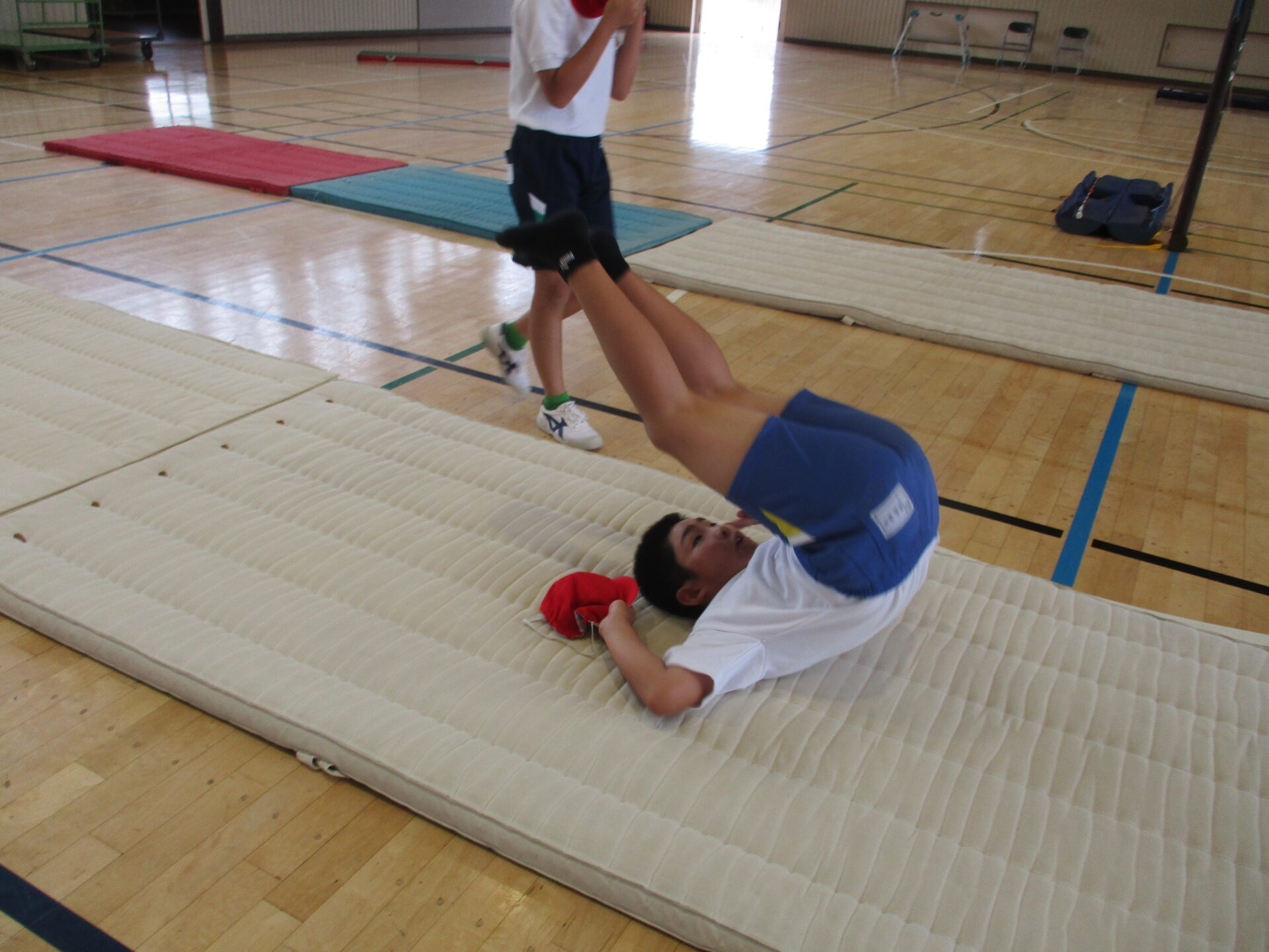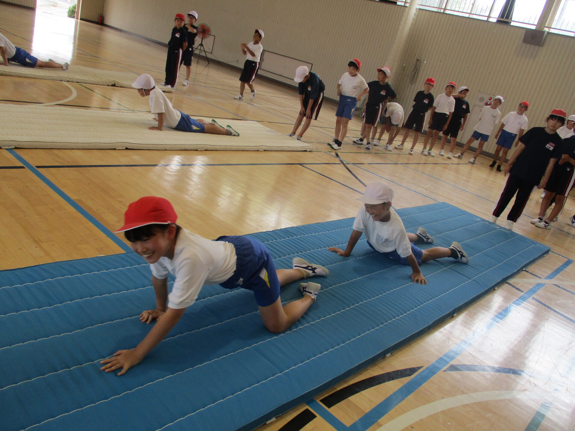 夏休みが明け、久しぶりの体育館での授業です。今回からは3年生と合同でマット運動を行っていきます。