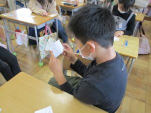 学活の時間に自己紹介カードを作り、友達に渡しました。自分の好きな色、スポーツなどを書いたり、4年生みんなへのメッセージを書いたりしていました。もらった自己紹介カードを何度も読み返している姿も見られました。