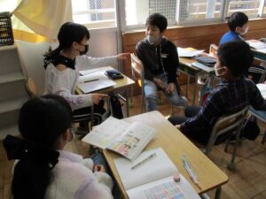 国語の授業では、友達との共通点探しで盛り上がりました。ペアの友達がどんなものが好きなのか、得意なのかを考えながら話し合っていました。どのグループも伝えたり、聞いたりすることができていて、さすが4年生!と思いました。これからの授業が楽しみです。