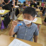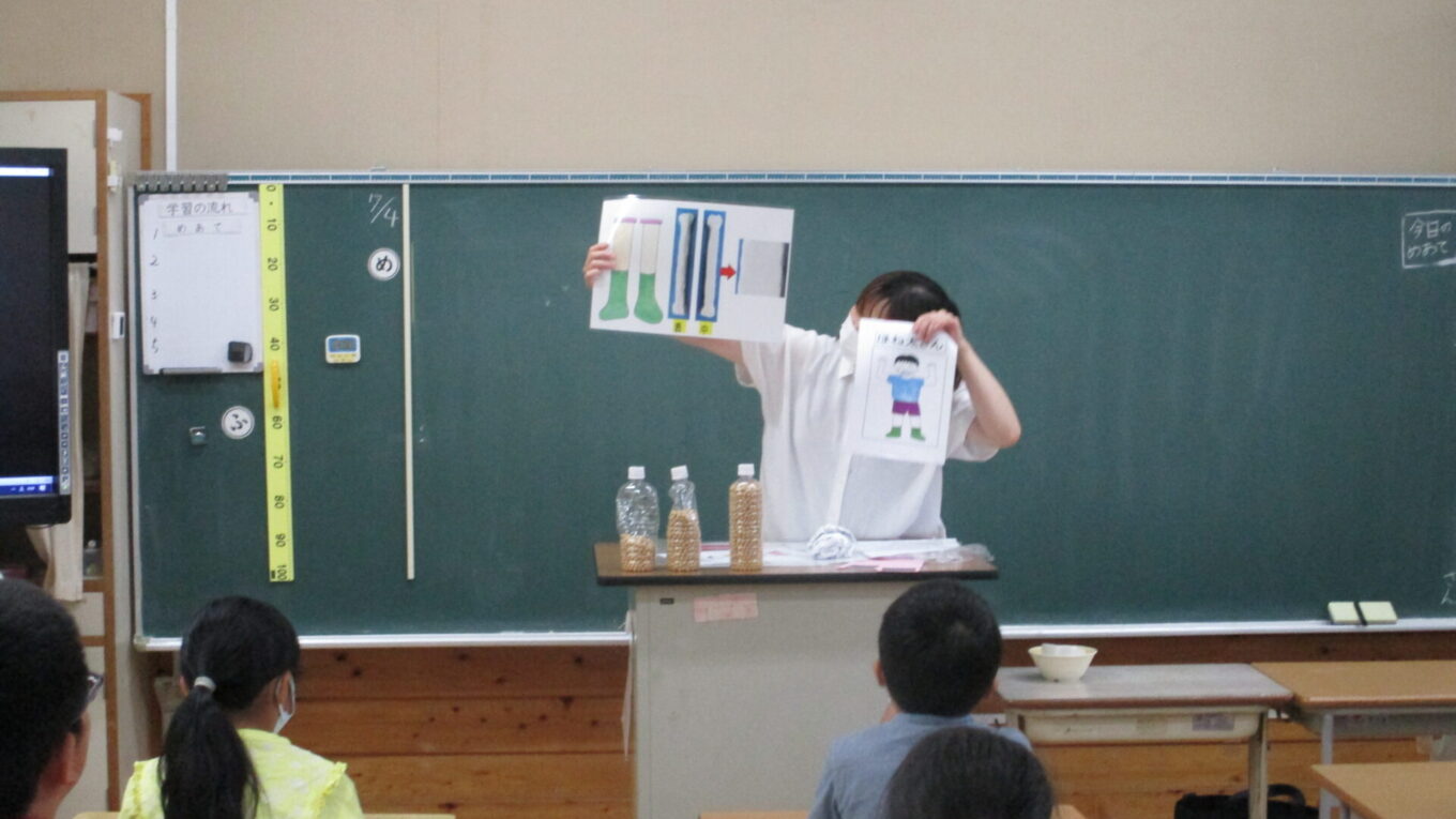 2023.07.05 4年生 丈夫な骨にするためには・・・ 管理者学校 今日は塩原小中学校の学校栄養士の先生に来ていただき、丈夫な骨にするためにはどうすればいいのかを教えていただきました。 ペットボトルを骨に見立てて考えたり、カルシウムが含まれている食品をクイズ形式で答えたりなど楽しみながら学習しました。 最後は正しいお箸の持ち方を教えていただきました。今日の給食で正しいお箸の持ち方を意識しながら食べている児童もいました。 #4年生