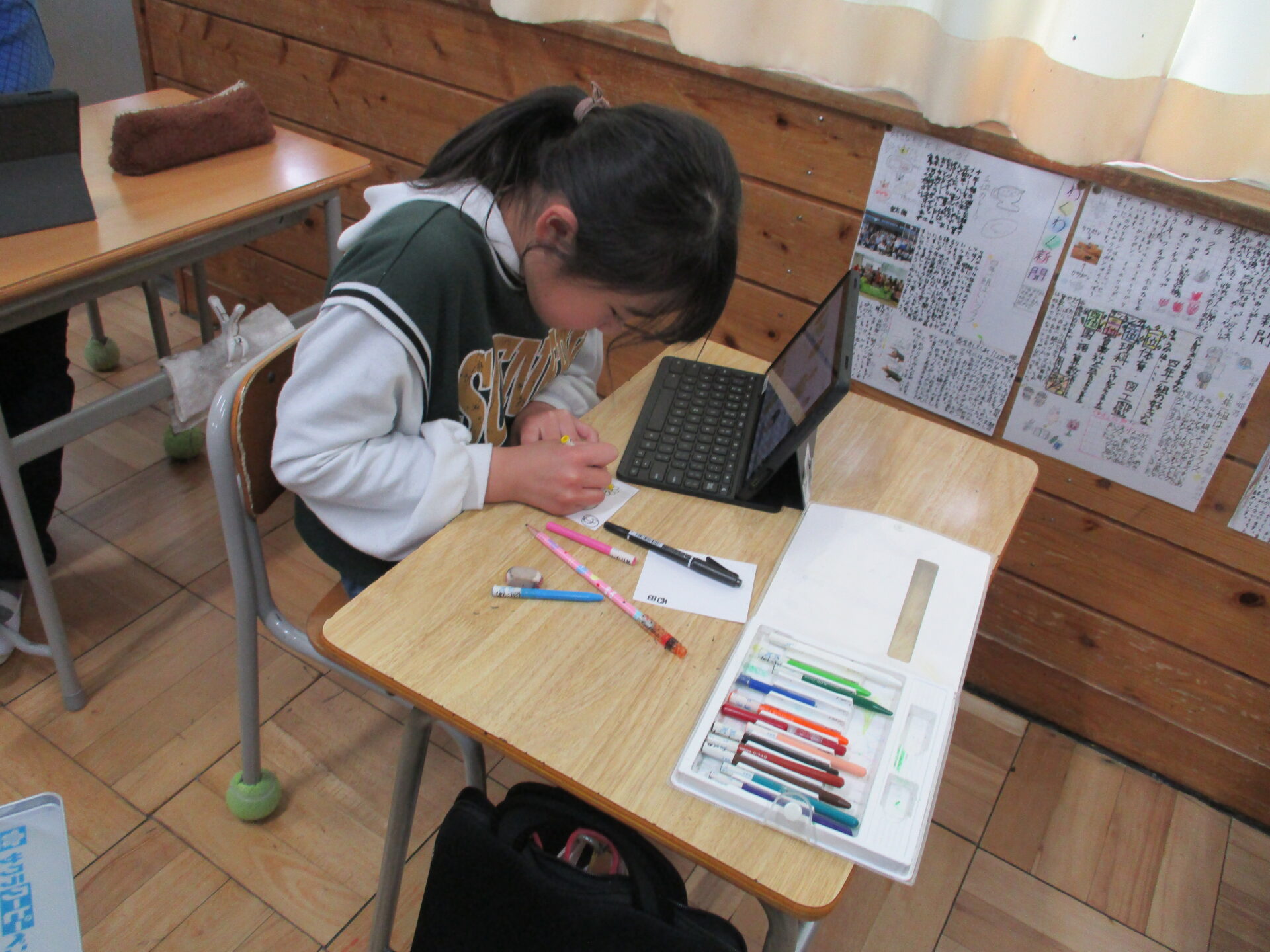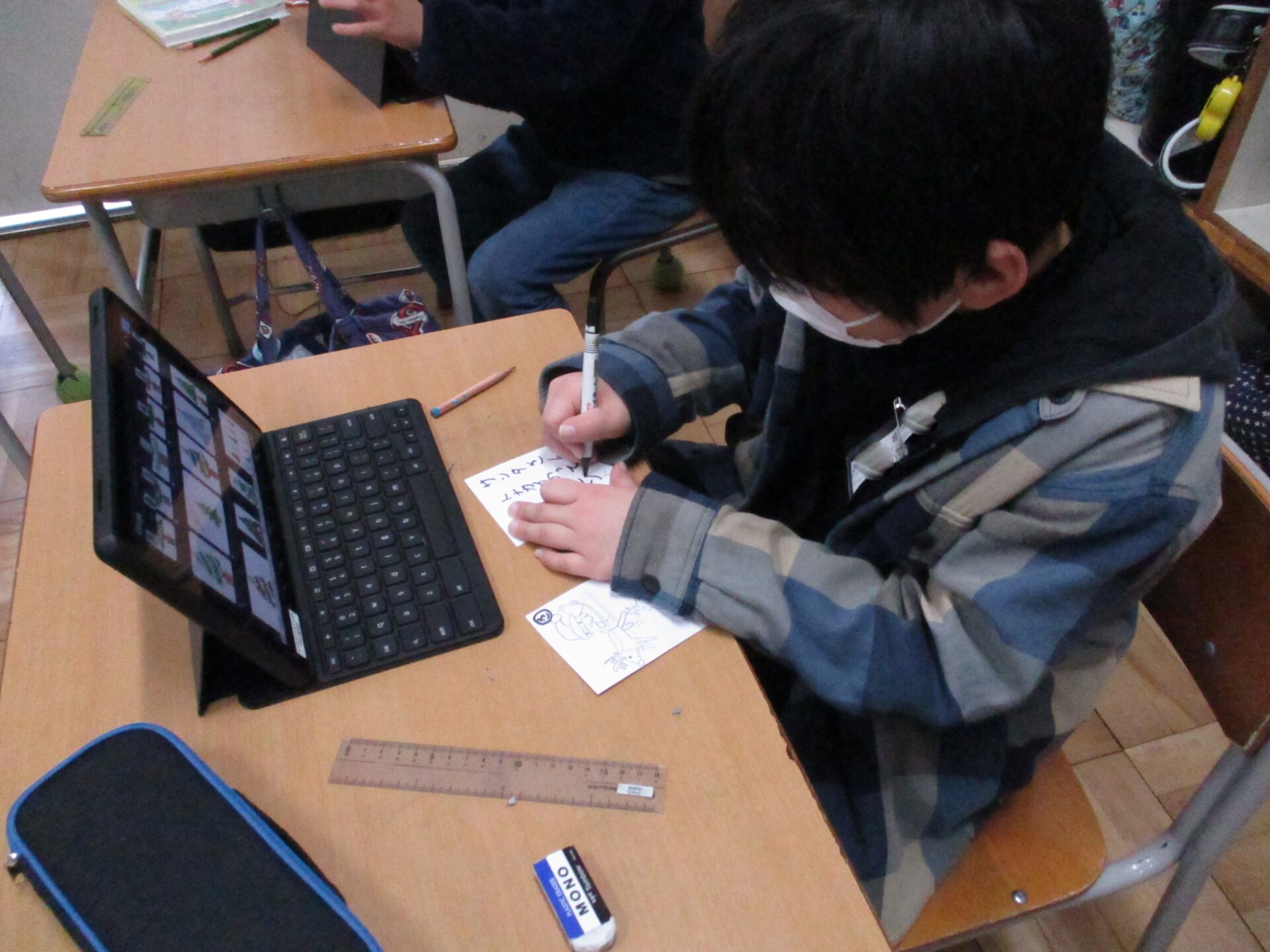 国語の「冬の楽しみ」では、かるた作りをしました。冬の行事に関する言葉を集め、その言葉を使って読み札と絵札を完成させました。言葉集めをしたものを使いながら、読み札を作ったところ、言葉選びが上手なものやおもしろいものがたくさん出てきました。このかるたで遊ぶのがとても楽しみです。