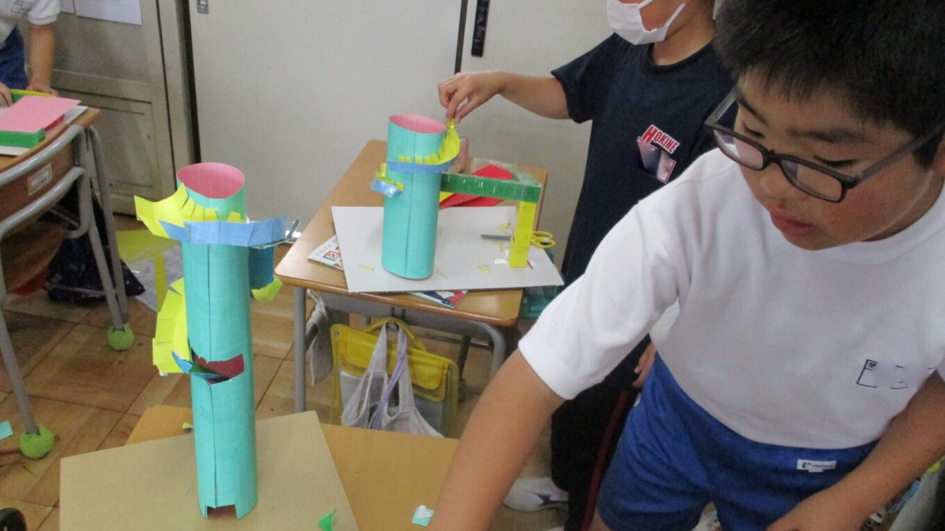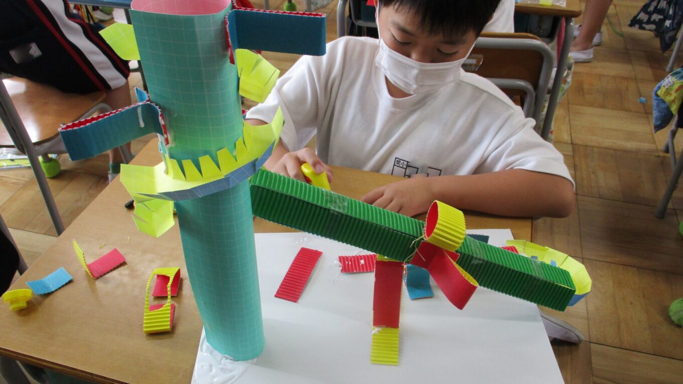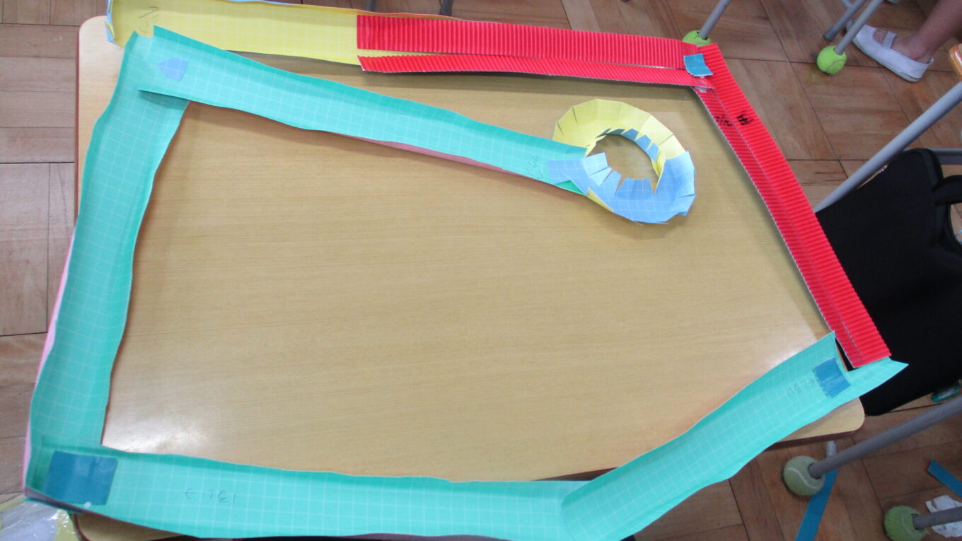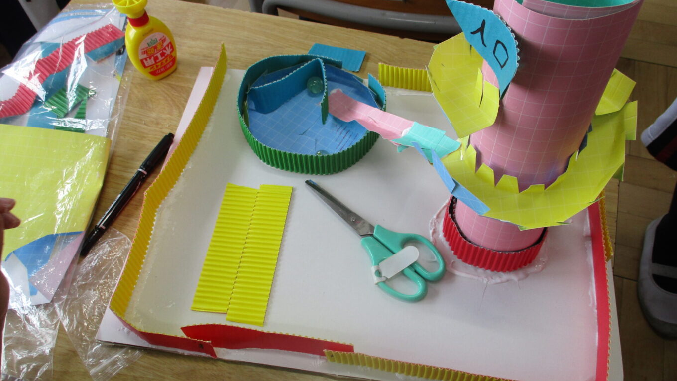 先週から作り始めた「コロコロガーレ」を完成させるために、黙々と作業をしていました。立体的な作品や平面的な作品もあり、個性豊かな作品が完成に近づいてきました。ビー玉が転がるかどうかを確かめながら試行錯誤して作っていました。完成した作品で遊べるのがたのしみです。