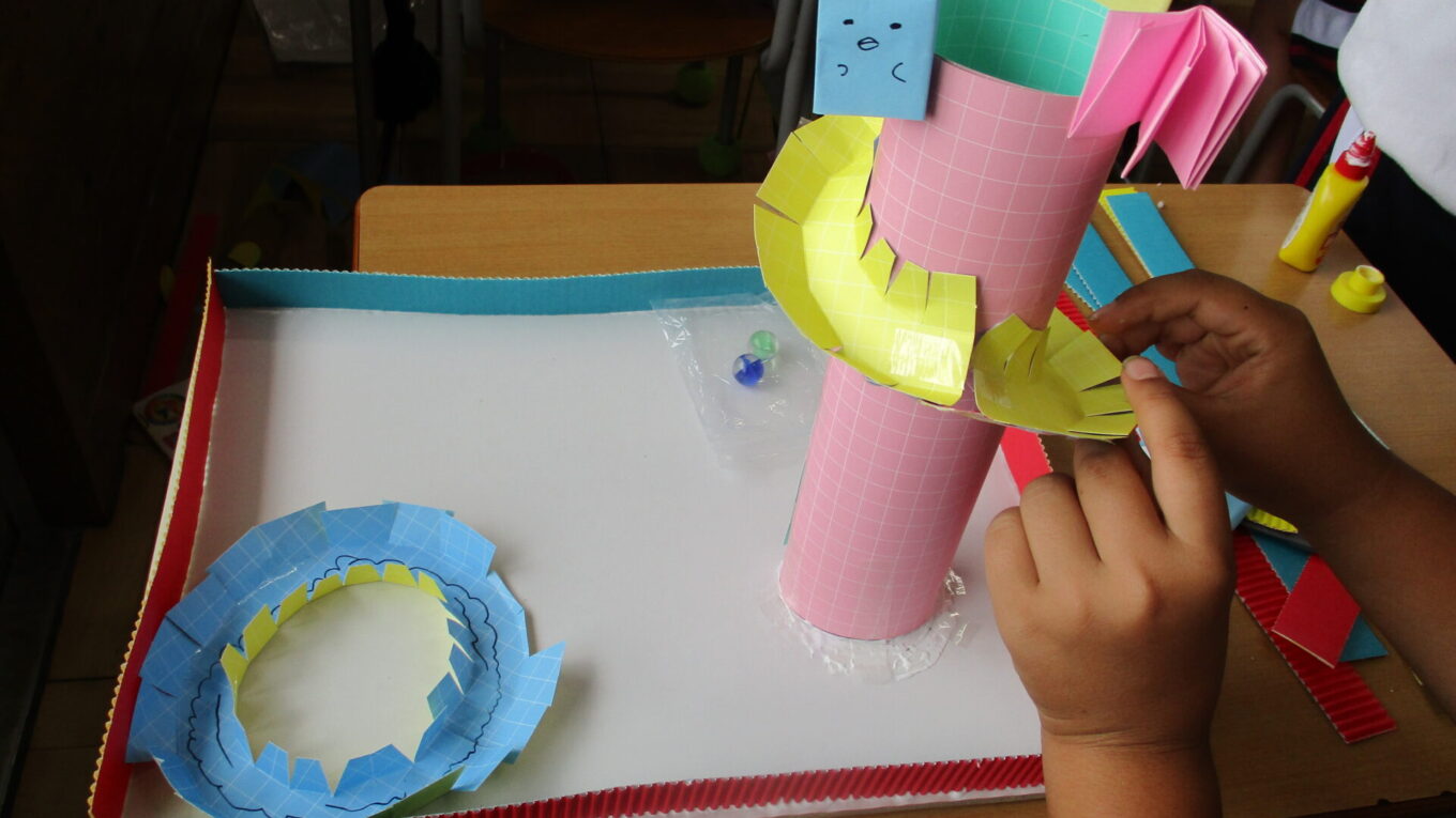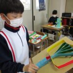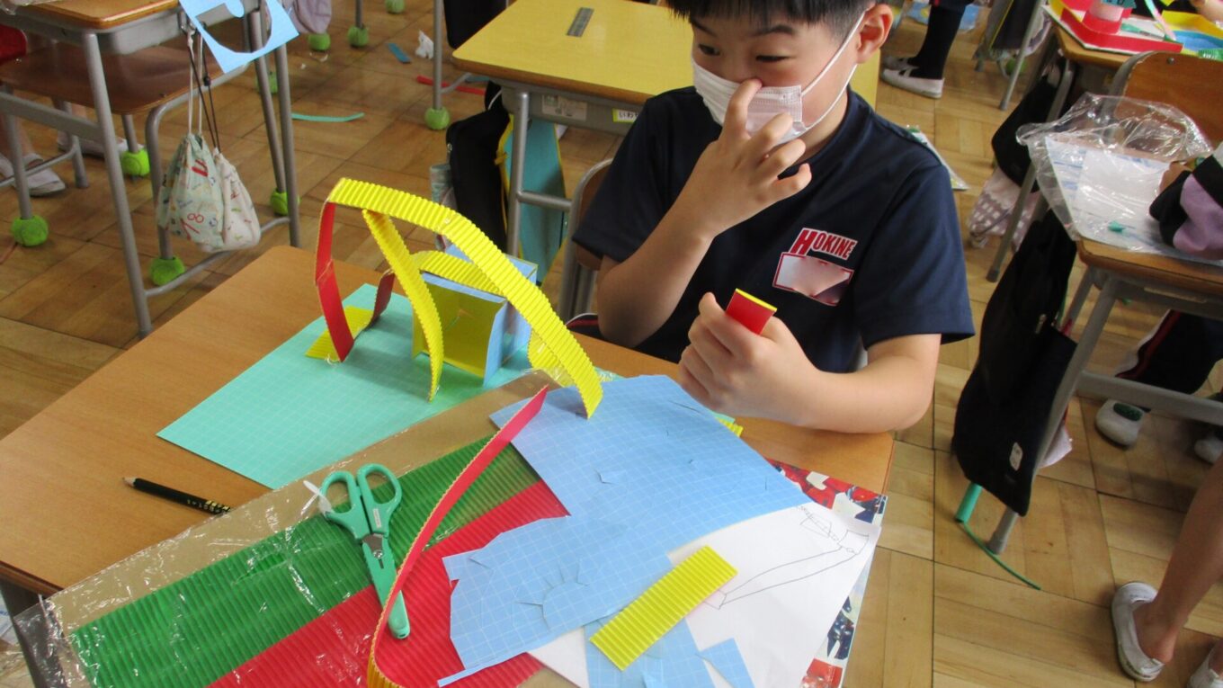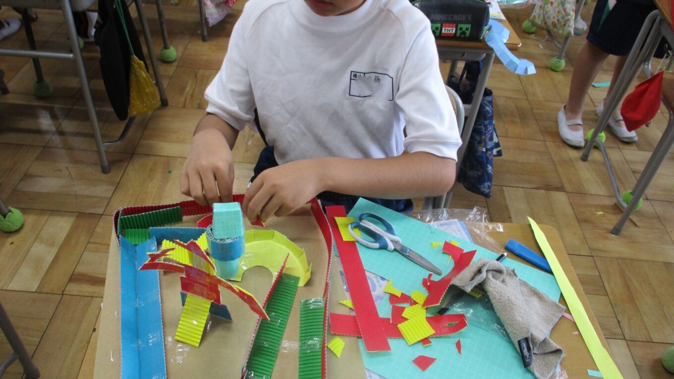 先週から作り始めた「コロコロガーレ」を完成させるために、黙々と作業をしていました。立体的な作品や平面的な作品もあり、個性豊かな作品が完成に近づいてきました。ビー玉が転がるかどうかを確かめながら試行錯誤して作っていました。完成した作品で遊べるのがたのしみです。