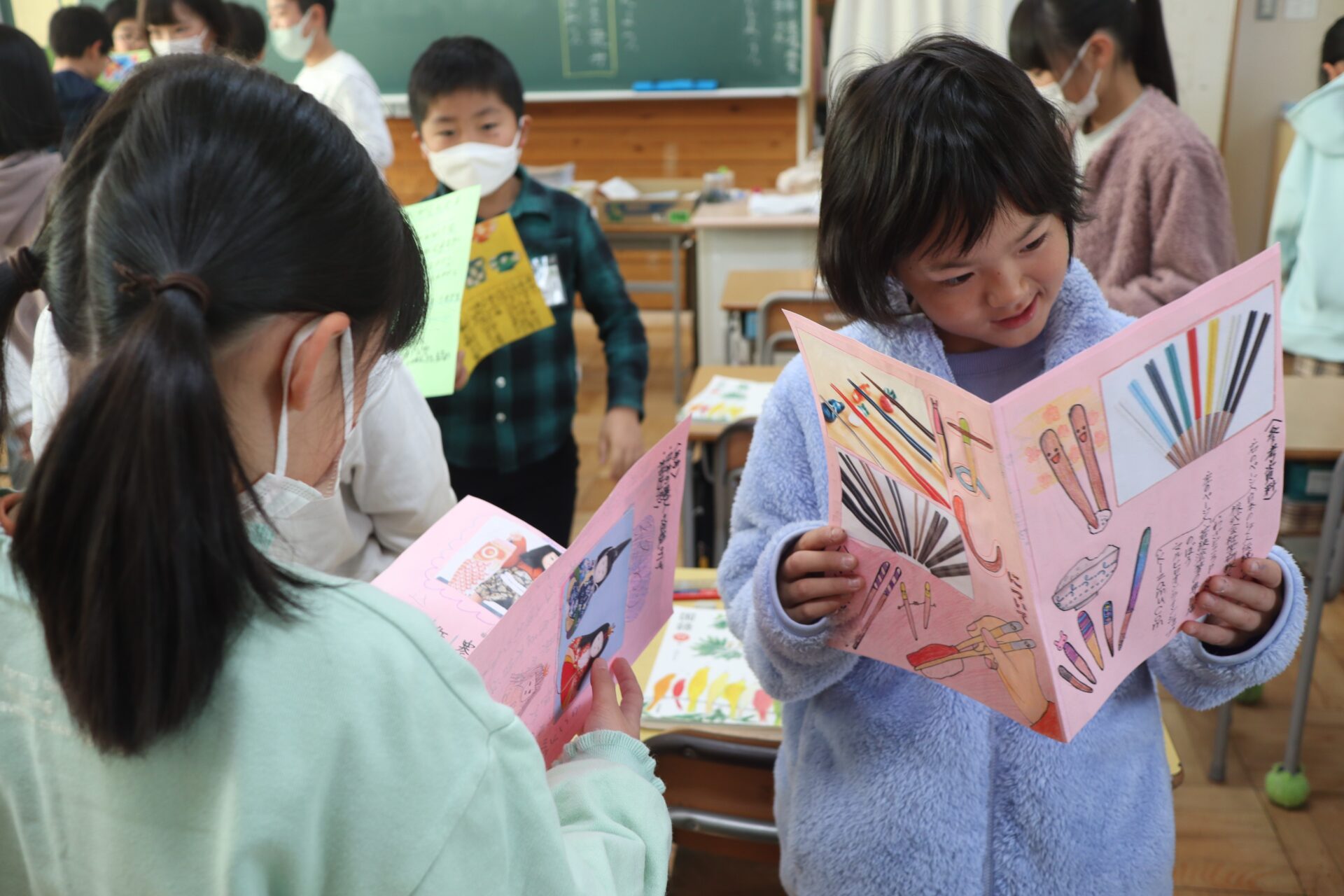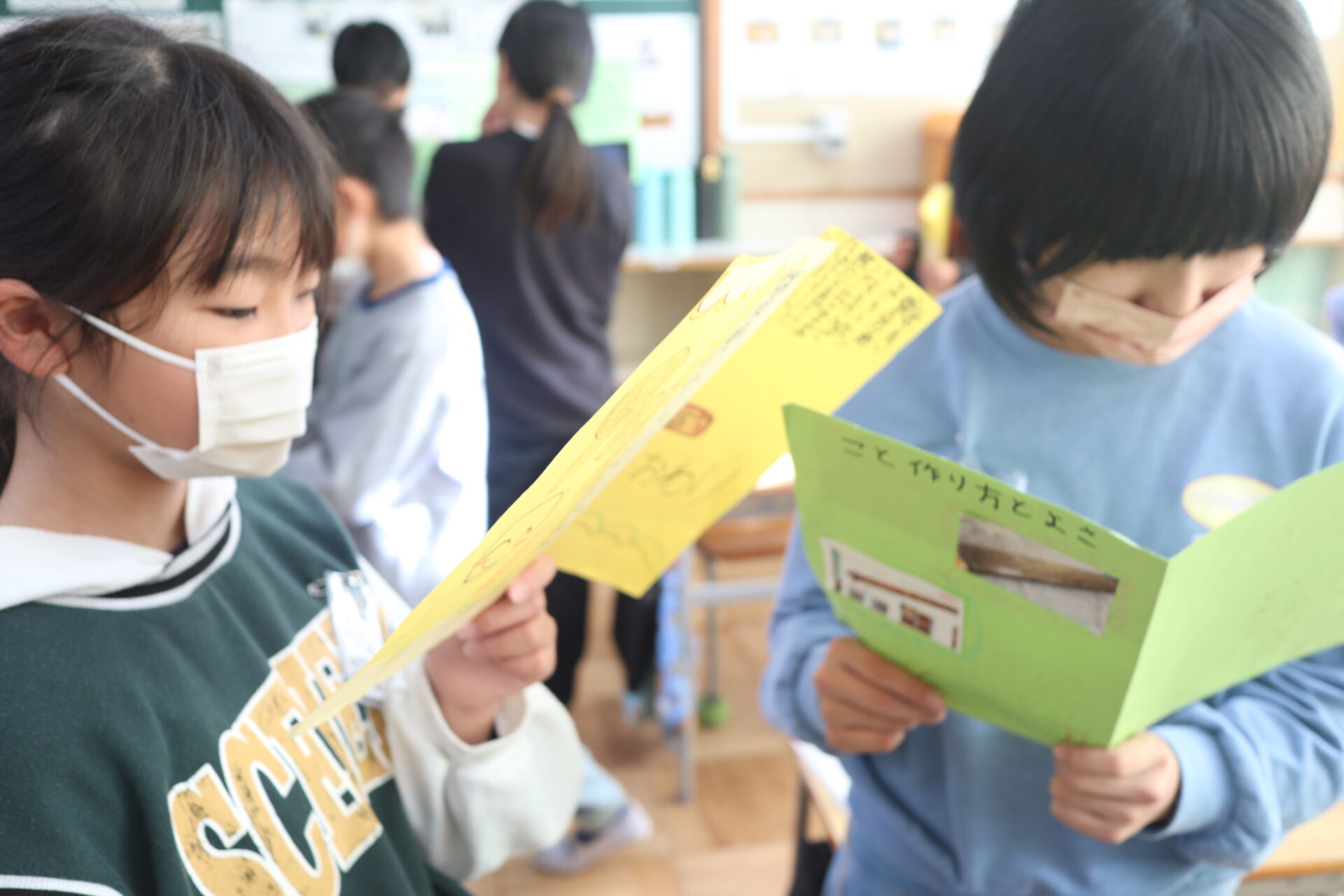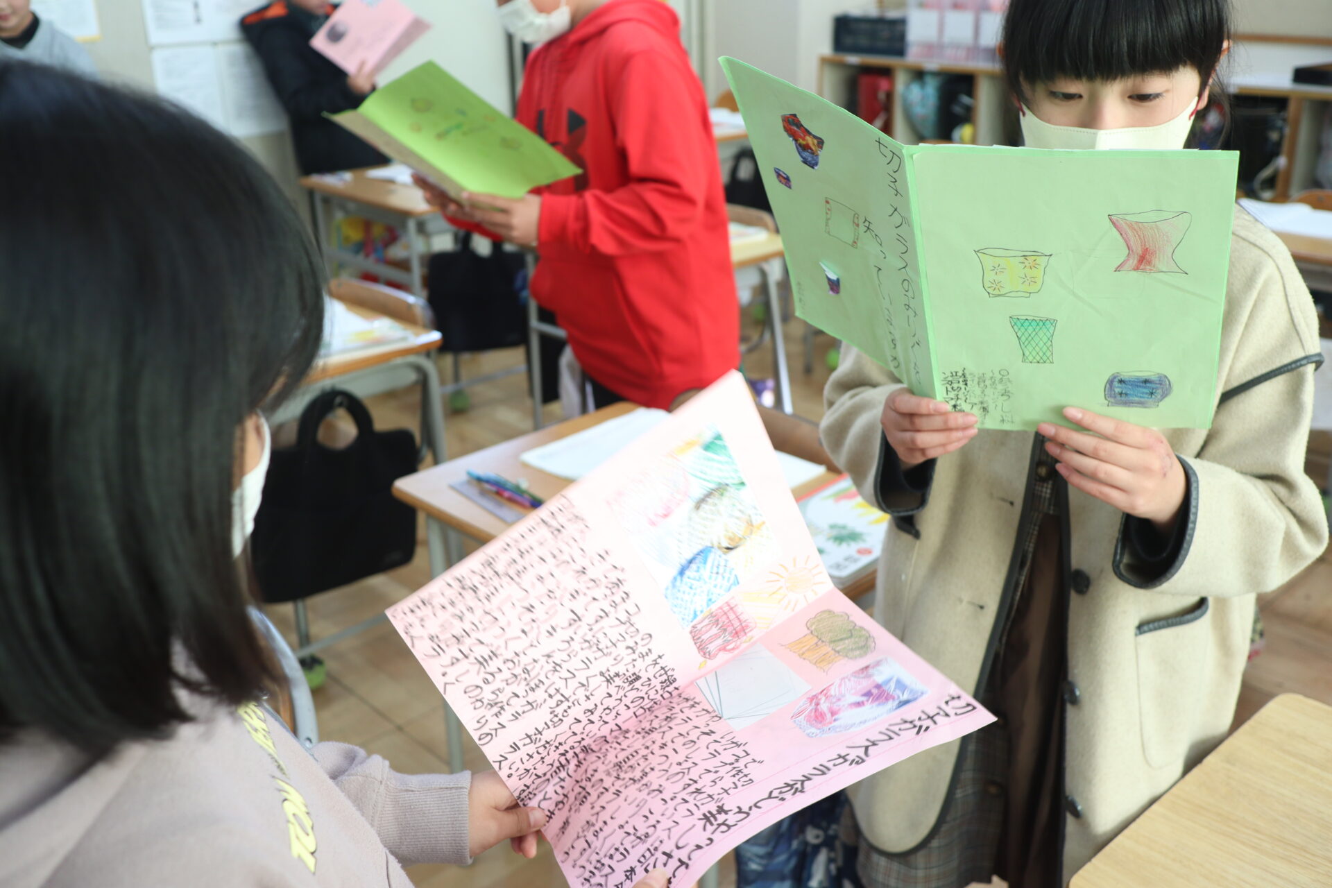 実際に読み始めると、友達のリーフレットには何が書いてあるのか、どんなところが良いのか、考えながら読んでいる姿が見られました。良いところを見つけると、「写真が分かりやすくなっているね」「文章が短く分かりやすい」など、友達に伝えることができました。