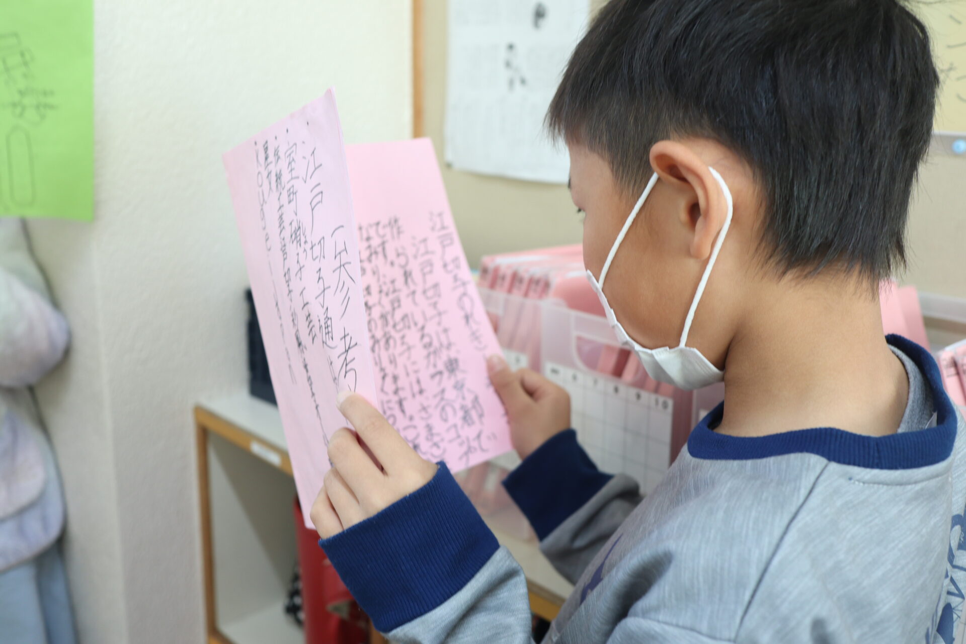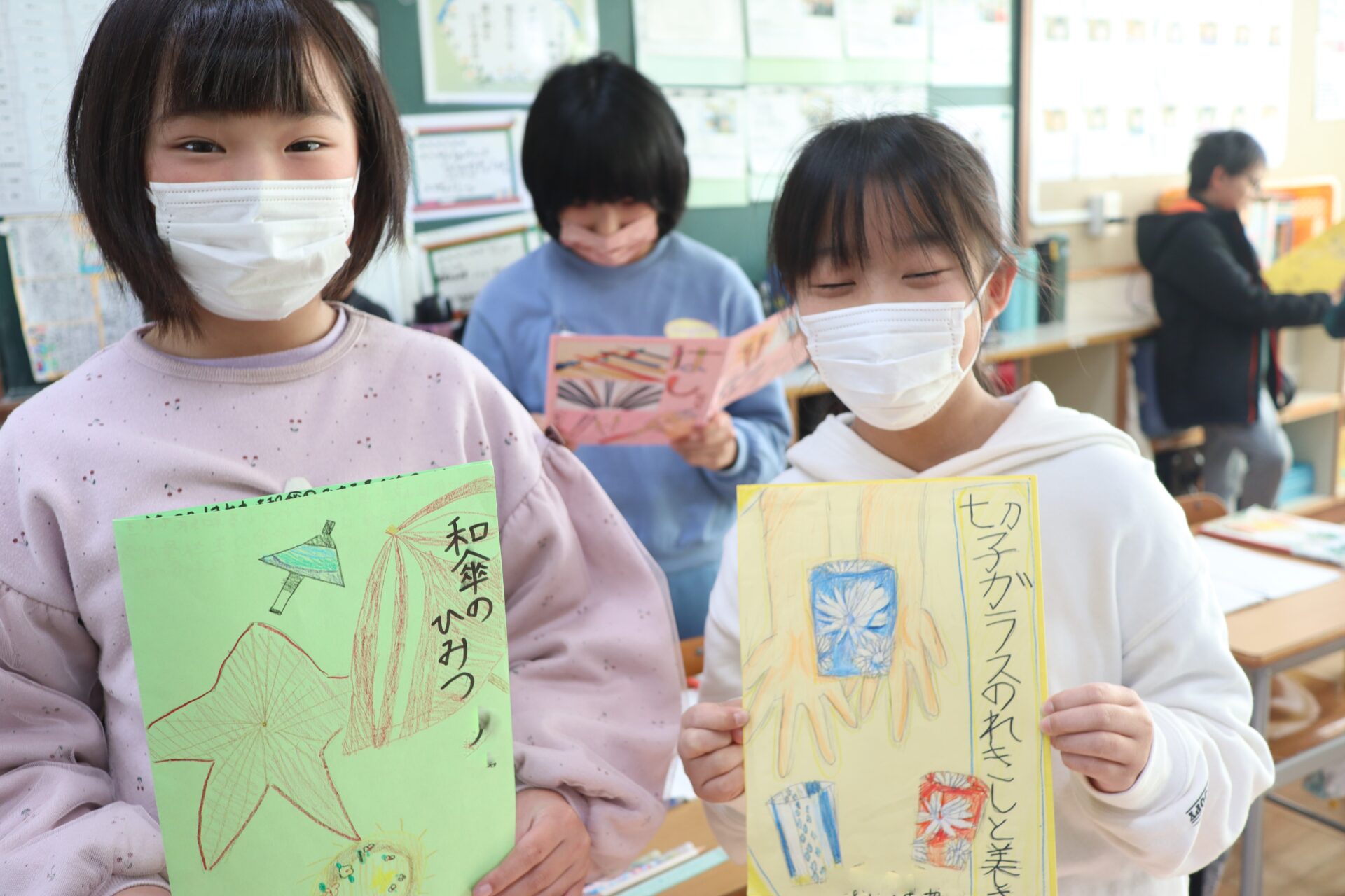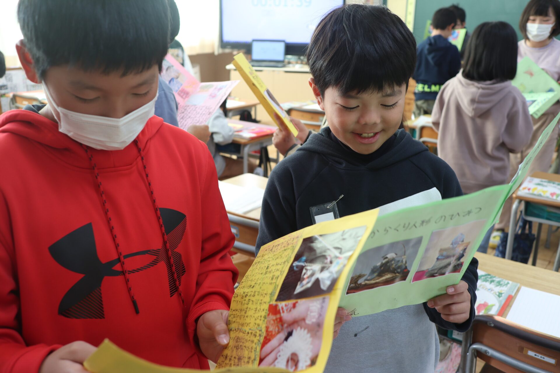 今日は完成したリーフレットを友達同士で読み合い、感想を伝え合いました。子供たちは、友達のリーフレットを読むのが楽しみだったようで、「先生まだみんなの読めないの?」と何回も聞いてくるほどでした。