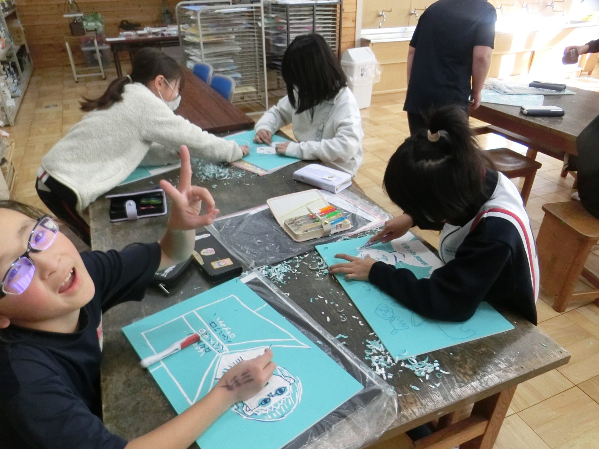 2024.12.04 4年生 彫刻刀の授業が始まりました!! 管理者学校 4年生になり、版画の授業で初めて彫刻刀を使っています。絵と違い、彫刻刀は一度彫ってしまうと修正が難しいのでいつも以上に慎重に取り組んでいます。三角刀、丸刀、平刀を使い分けながら作品作りに励んでいます。完成まで、あともう少しです。保護者の皆様も完成を楽しみにしていてください。 #4年生