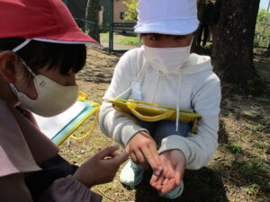 2023.04.19 4年生 春の生き物 管理者学校 最初の理科の授業では、生き物の観察を行いました。校庭の南側にある和香園に行って、花や木、虫などを観察しました。春になると植物が花を咲かせたり、生き物が活動し始めることに気付きました。 「先生、ダンゴムシ見つけたよ。」「この花なんて言うのかな?調べてみたいな。」など、生き物探しや観察を意欲的に行っていました。
