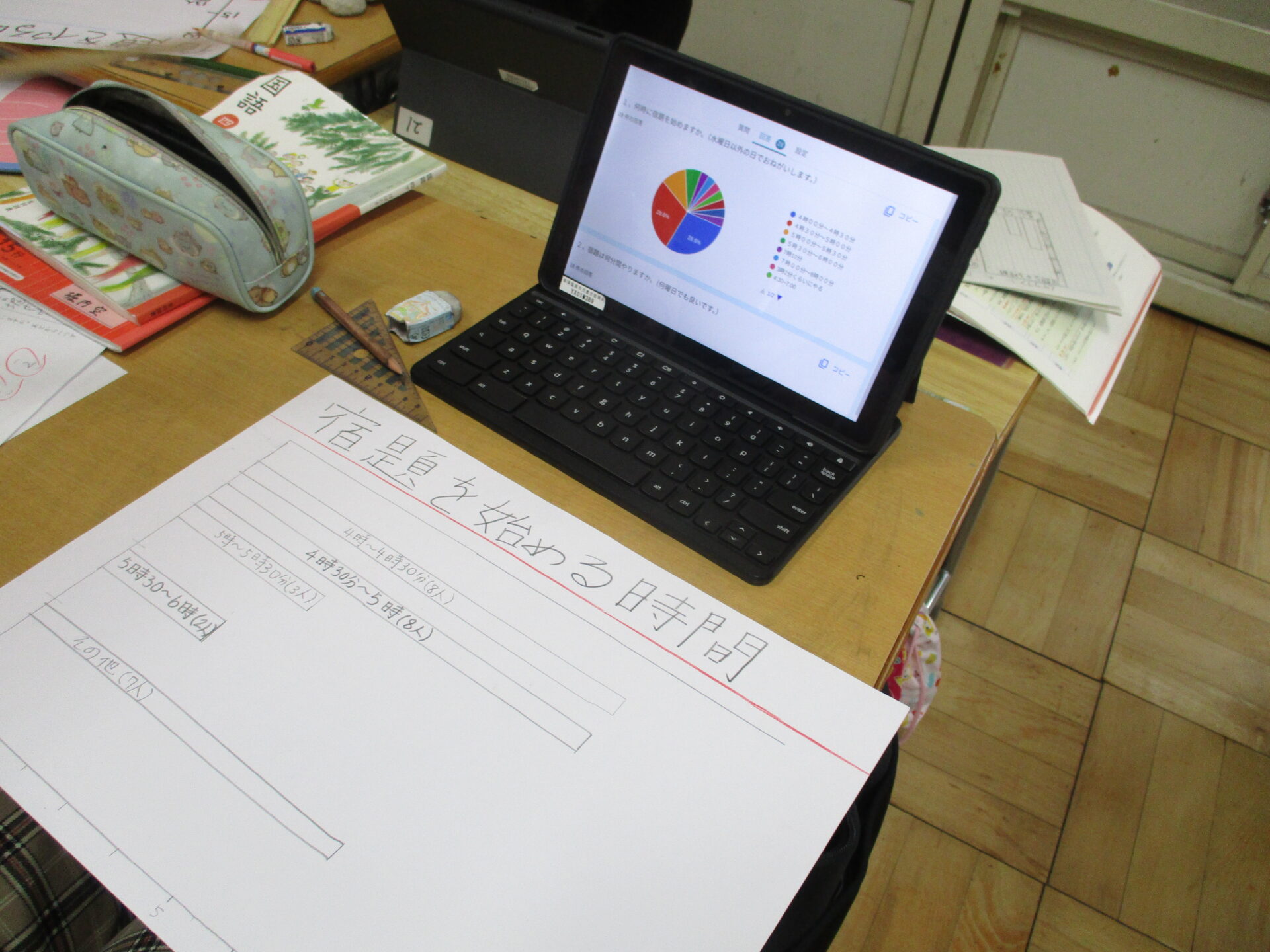2024.03.04 4年生 生活調査隊! 管理者学校 国語の学習では、生活の気になることを「生活調査隊」となって調べてきました。タブレットを使って、休みの日の過ごし方や睡眠時間、宿題についてなど生活に関わることをアンケートしました。 今日はアンケート結果から分かったことをまとめたり、グラフに表したりしました。当たり前のように役割を決めたり、分からないことを友達と相談し合ったりするなど協力して行うことができているのは、4年生の素晴らしいところです。 4年生終了まで、あと13日!今日の担当はこの2人です! #4年生