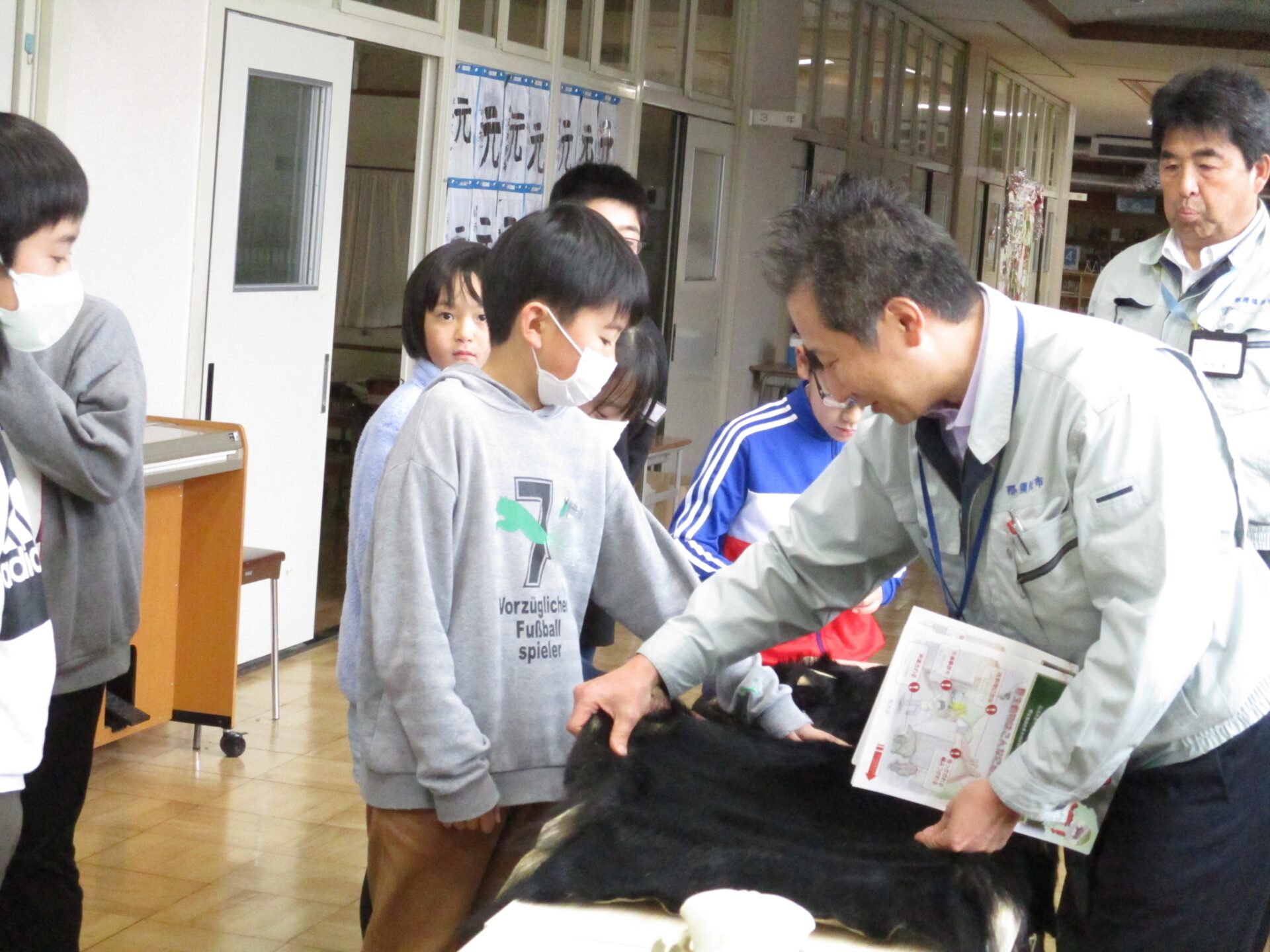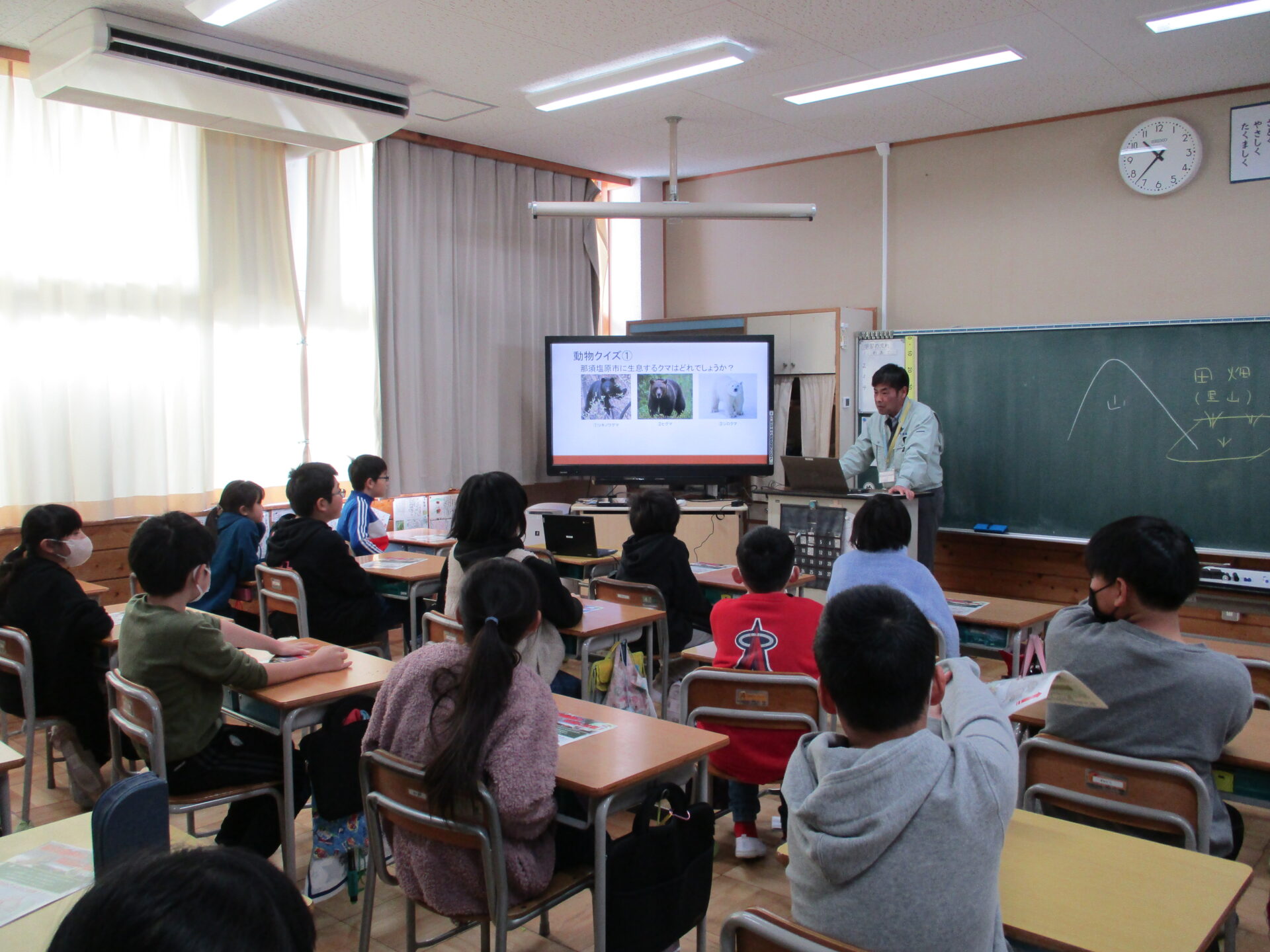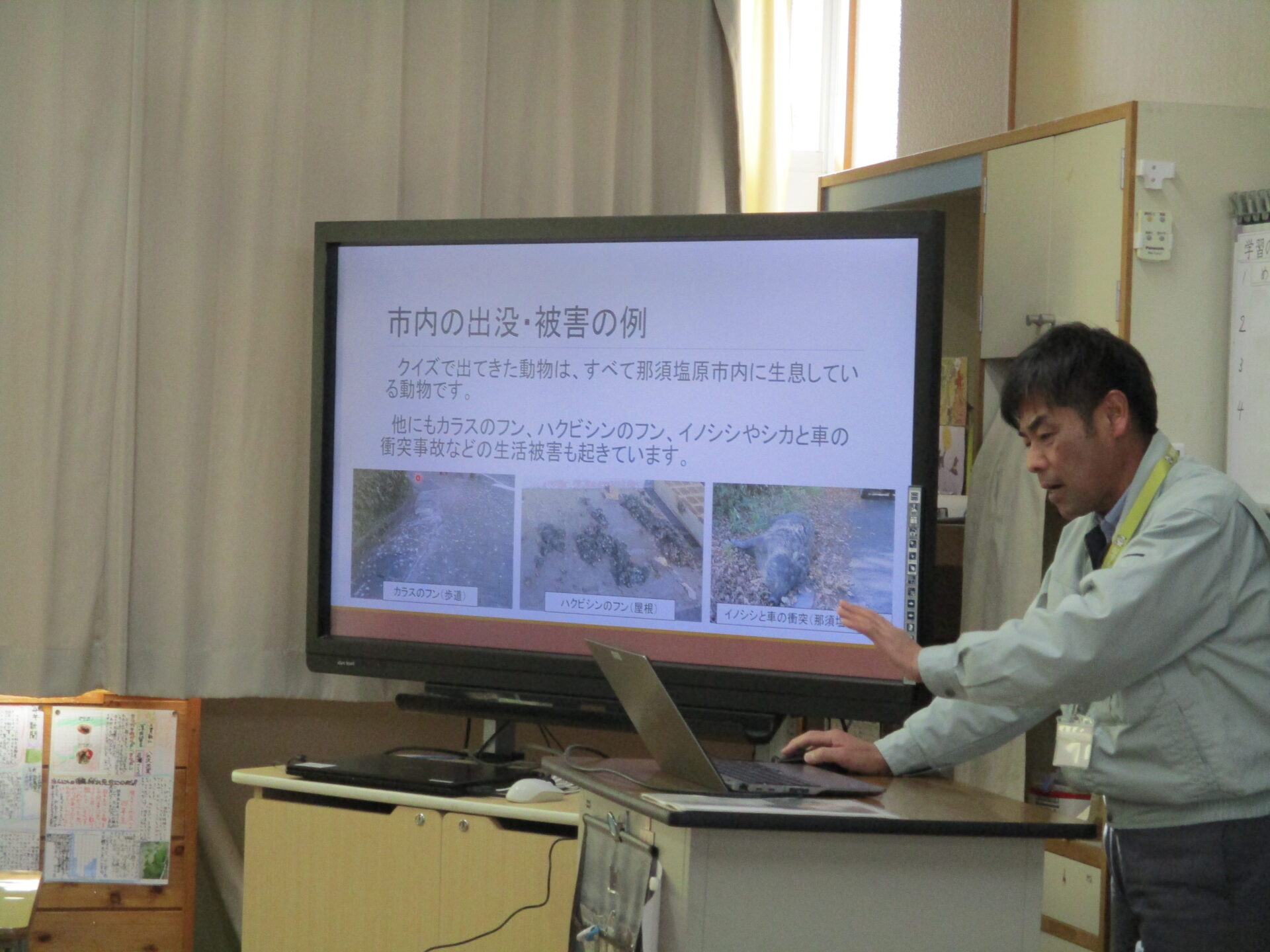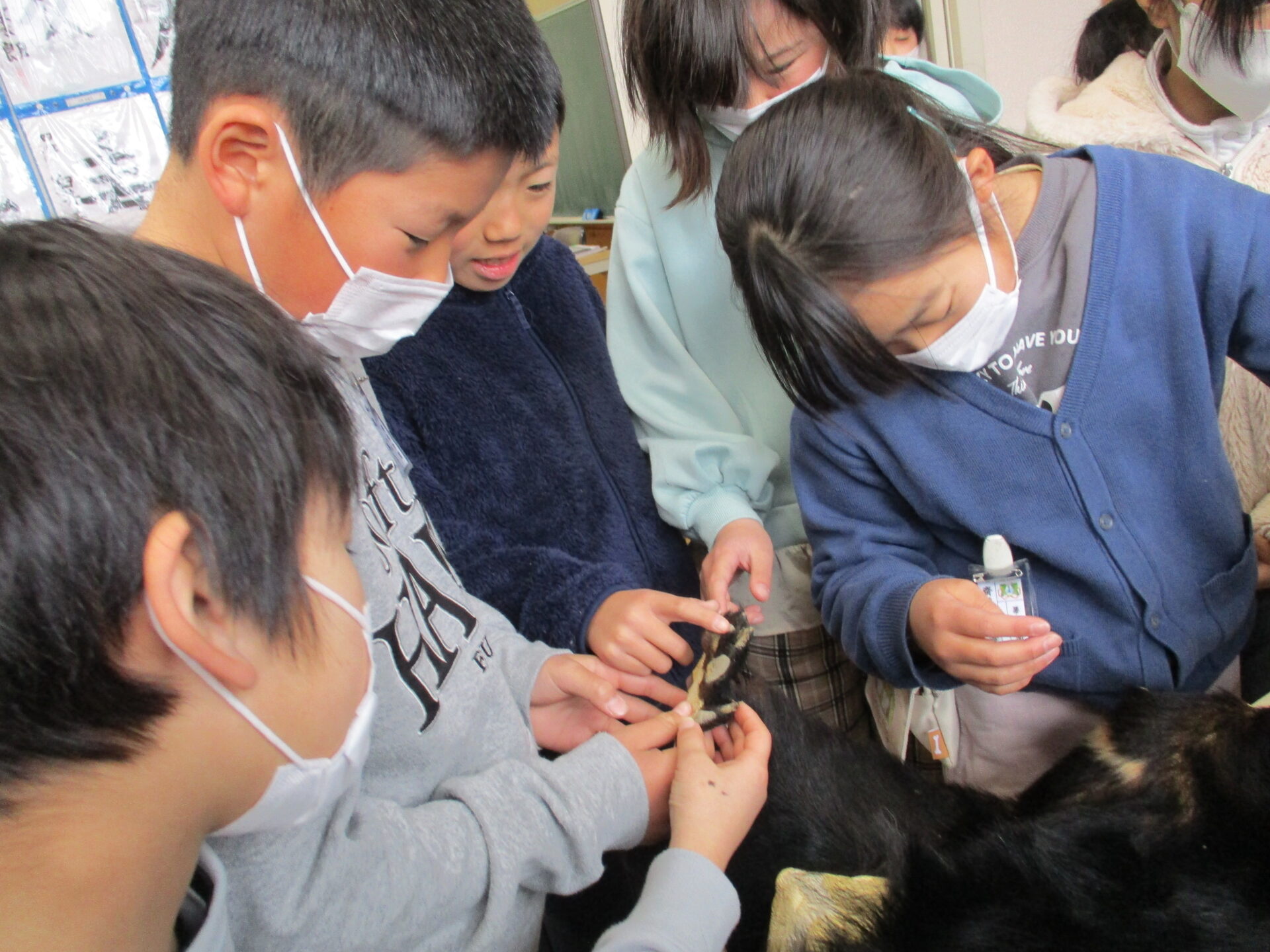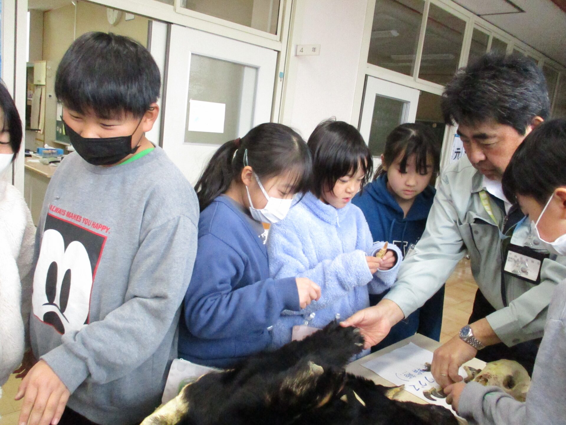 2024.01.16 4年生 野生動物について学習しました 管理者学校 今日は那須塩原市役所農林整備課の職員の方々に「野生動物との関わり方」について教えていただきました。 最初は、職員の方々が持って来てくださった、クマの毛皮や骨、爪、シカの角などを触らせていただきました。子供たちは初めて見るものばかりでしたので興味津々でした。 触らせていただいた後は、動物のクイズや那須塩原市周辺の野生動物についての話をしていただきました。野生動物が私たちの暮らしに影響を及ぼしてる理由は、私たち人間側にもあることを知りました。野生動物の出没や被害を減らすためにはどうすればよいかをグループで話し、発表しました。 #4年生