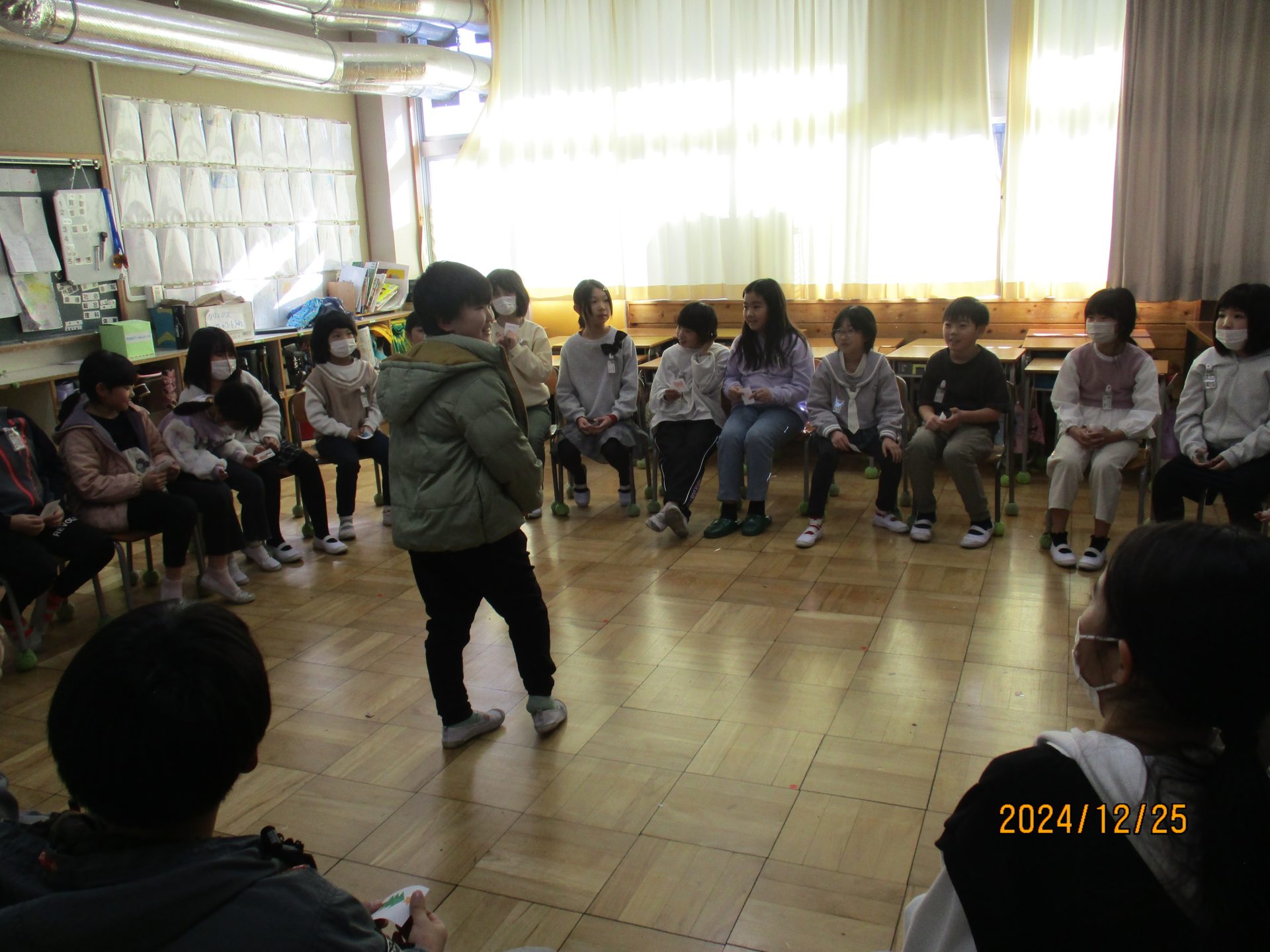 2024.12.25 3年生 クリスマス会をしました。 管理者学校 今日は、学級会で話し合って決めた「クリスマス会」をしました。 内容はクリスマスバスケットとプレゼント交換です。 プレゼントの中には、みんなが作った折り紙がたくさん入っていました。(何が入ってるかはお楽しみ・・・) とても楽しい会になりました。 #3年生