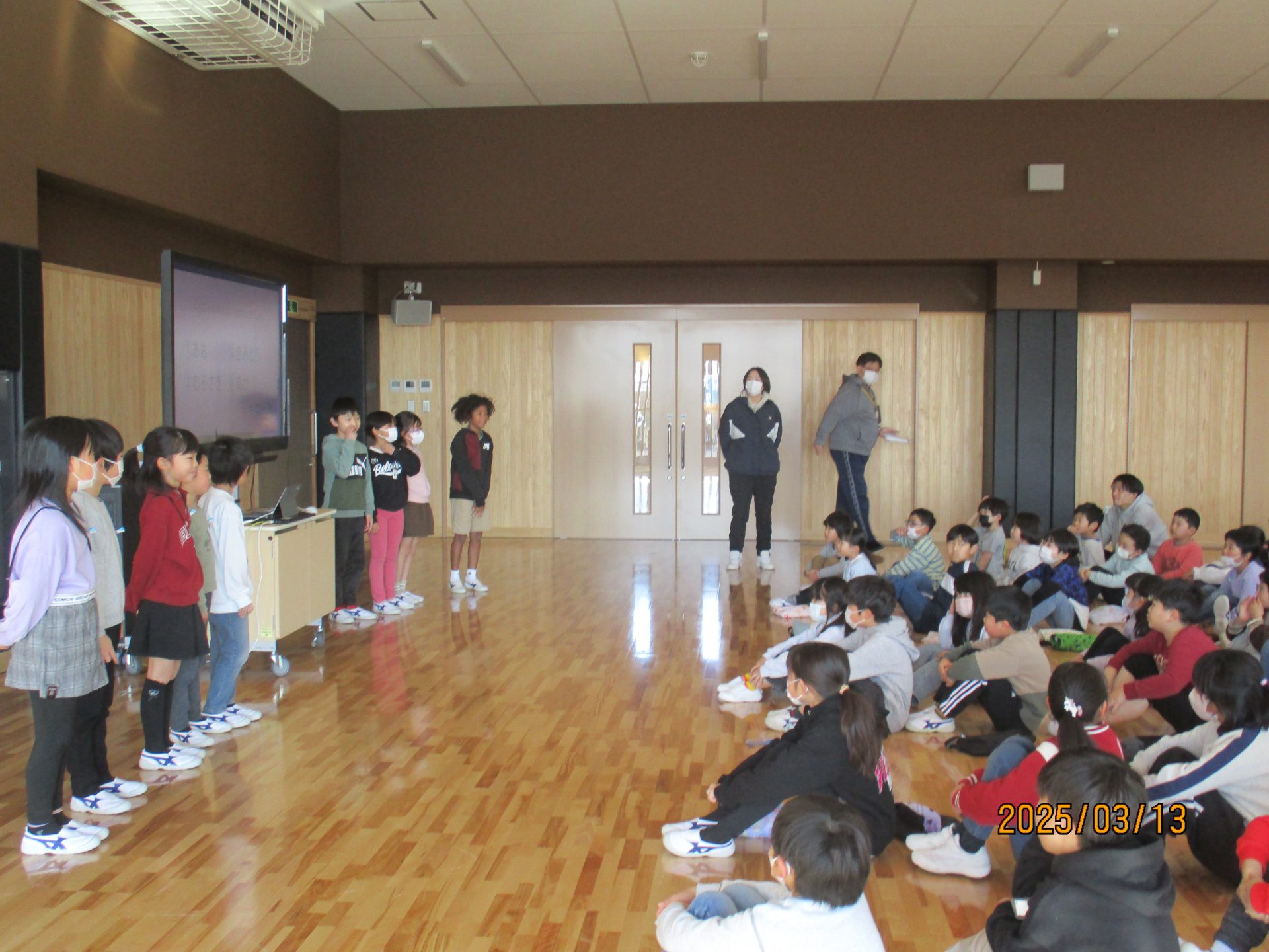 今日は一年生から四年生までで今年度最後の集会を行いました。