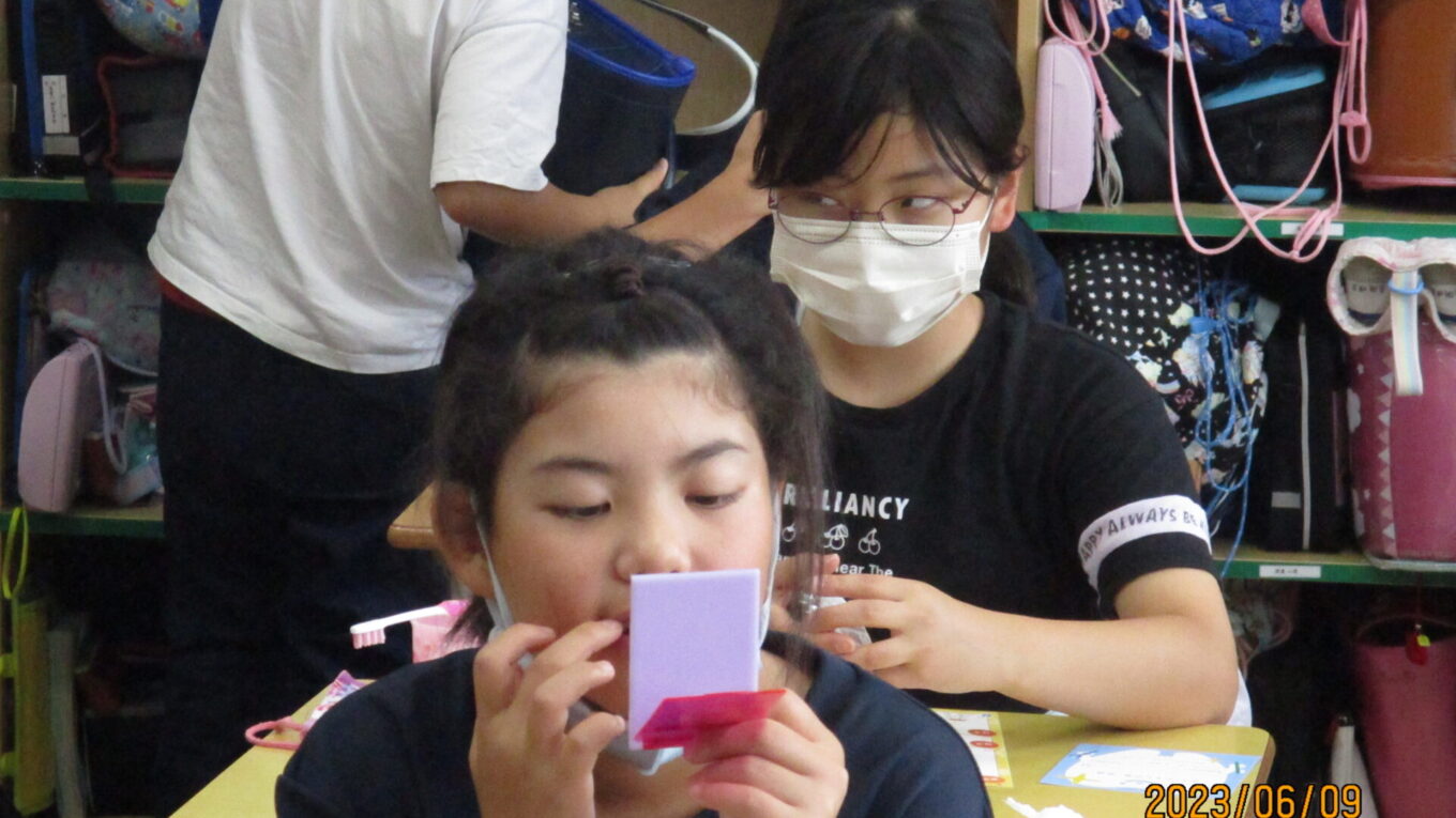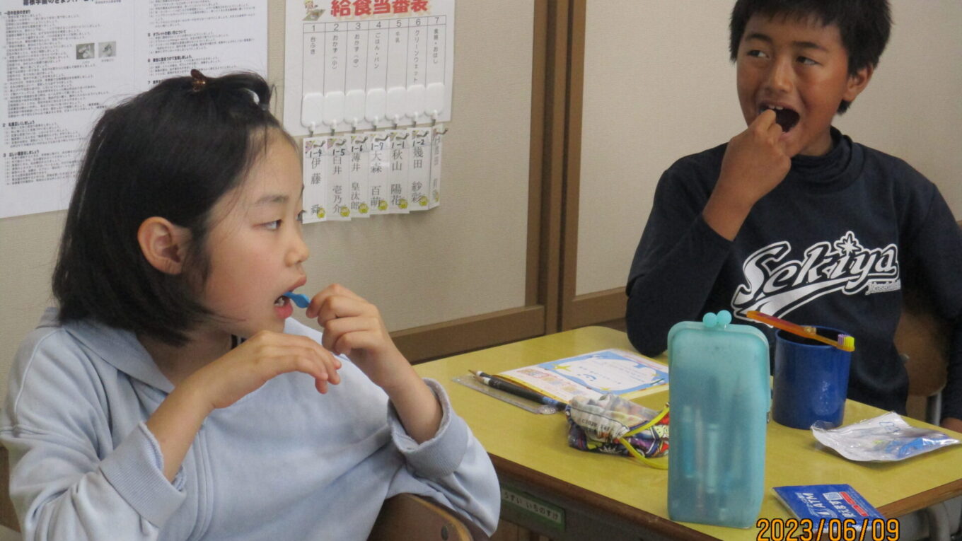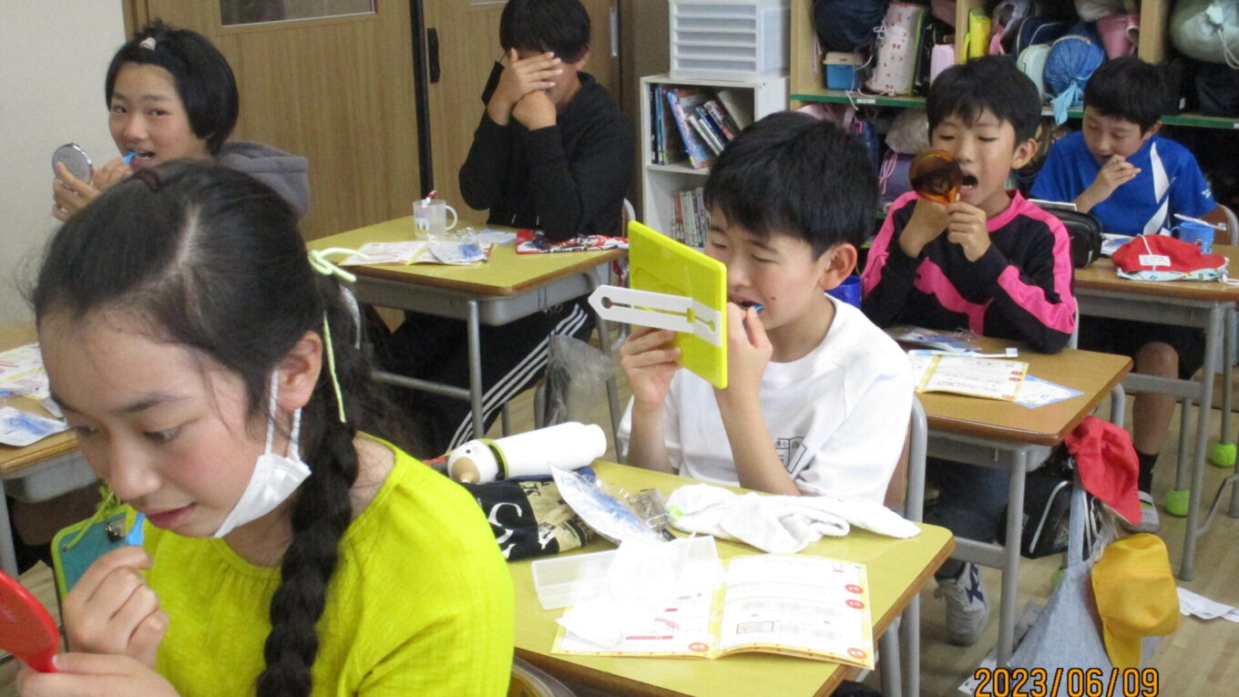 子供たちは、歯垢に含まれる菌や歯肉炎になっている歯茎の様子を見ると、自分の歯を確認し熱心に歯を磨いていました。