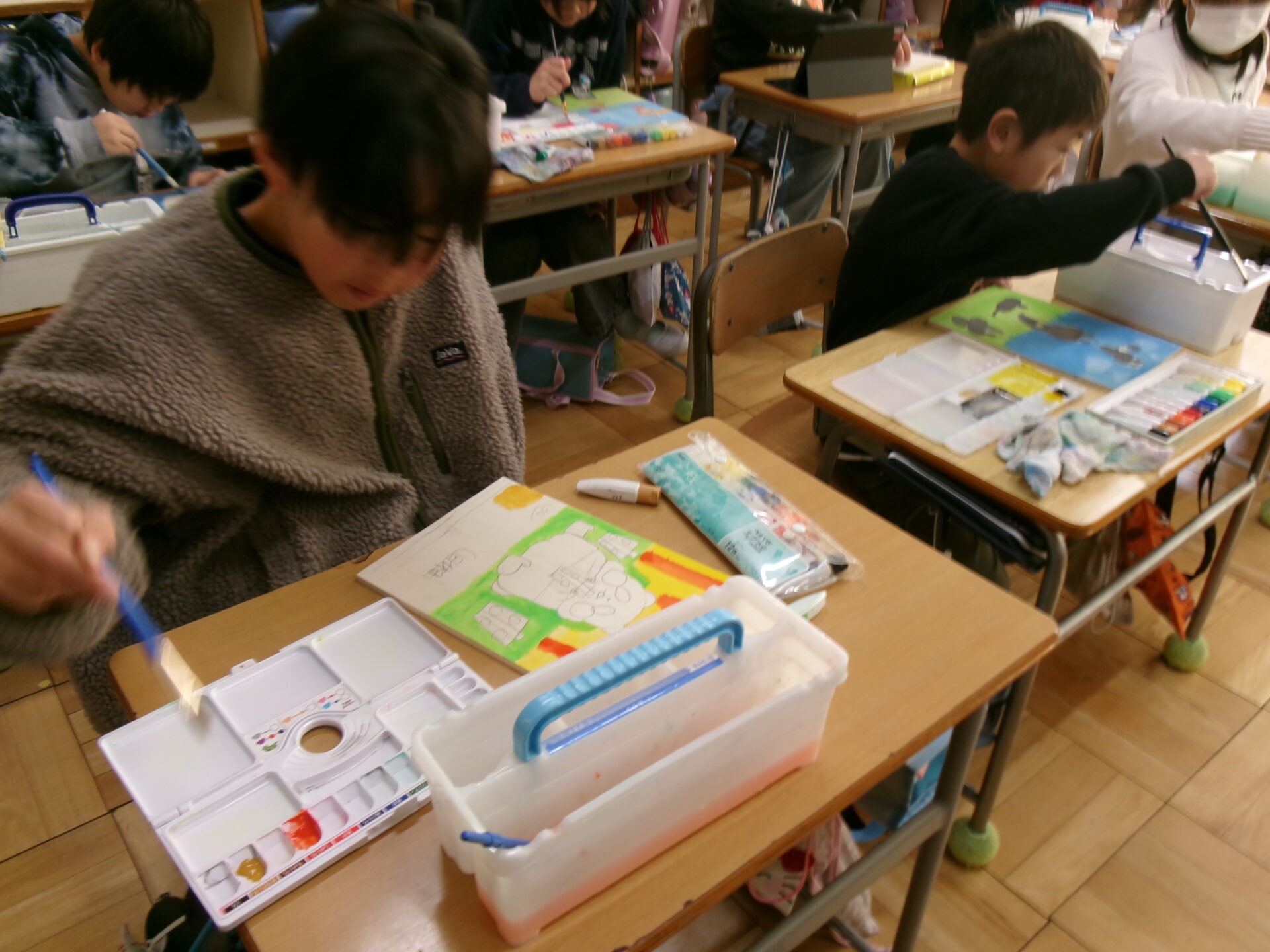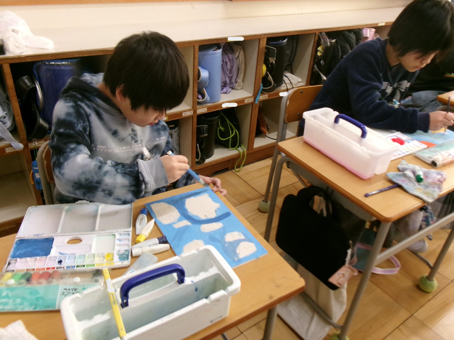図工の授業です。板に絵の具で思い思いの絵を描いています。