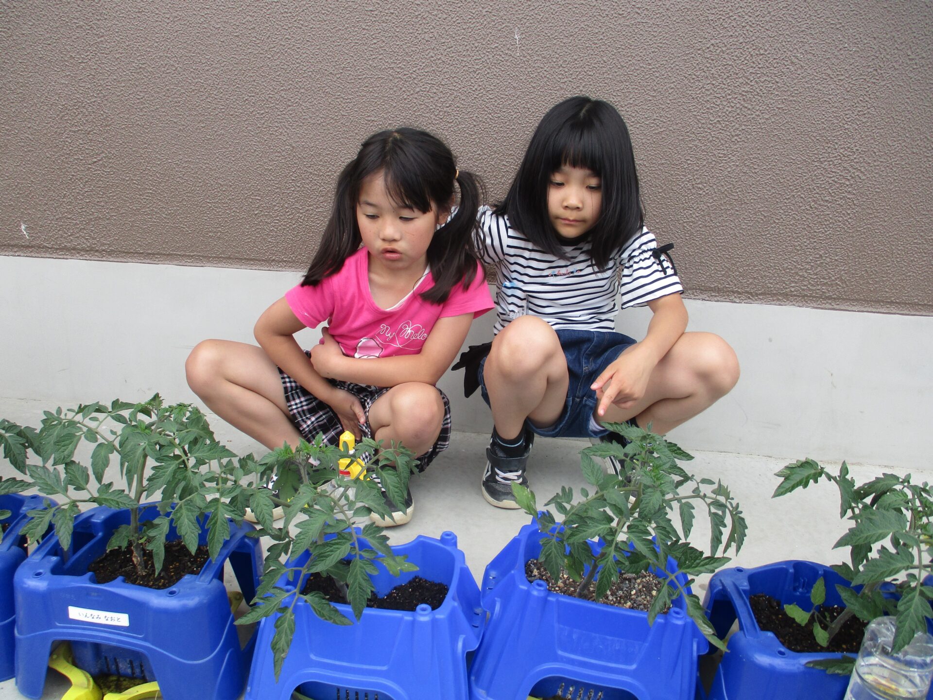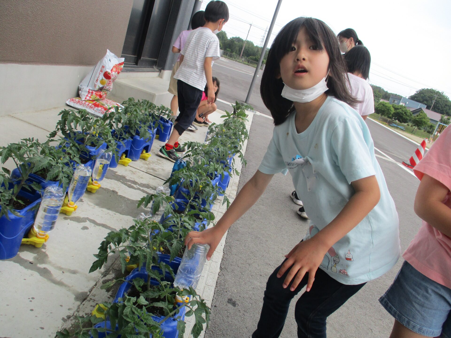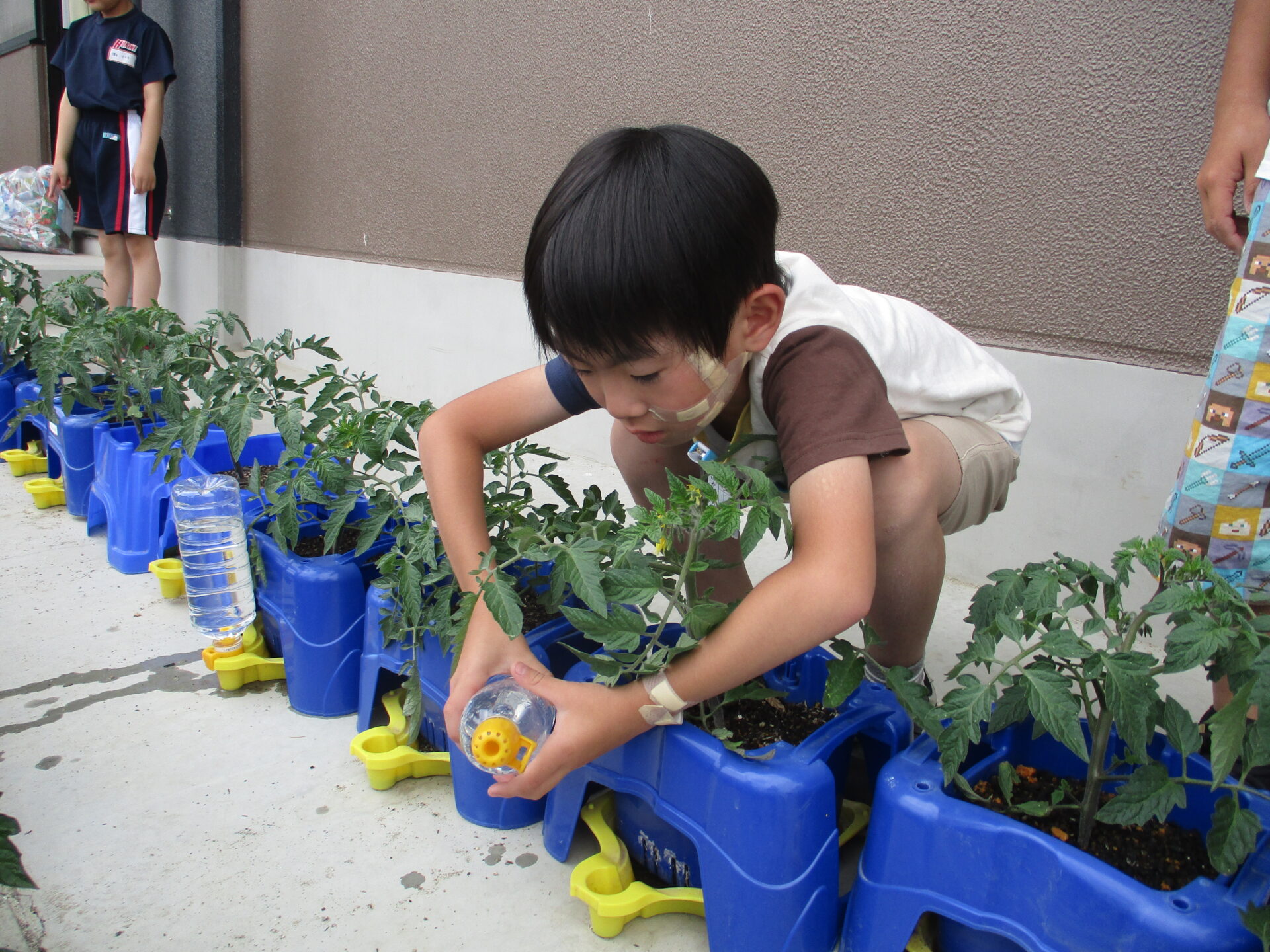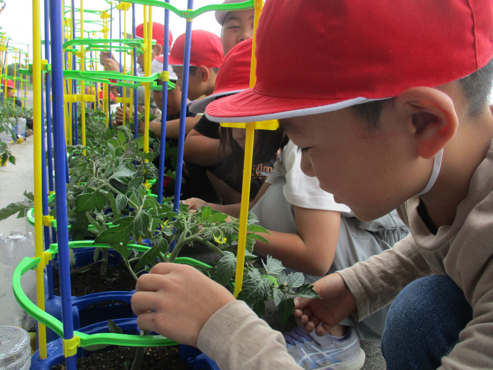 毎日の水やりを忘れず、大切に育てています。ミニトマトが少しずつ成長していることに気づき、とても嬉しいようです。「花が咲いたよ。」「葉っぱの数が増えた。」など、子供たち同士で話している姿が見られました。ミニトマトにも命があることを理解し、これからも大切に育ててほしいと思います。