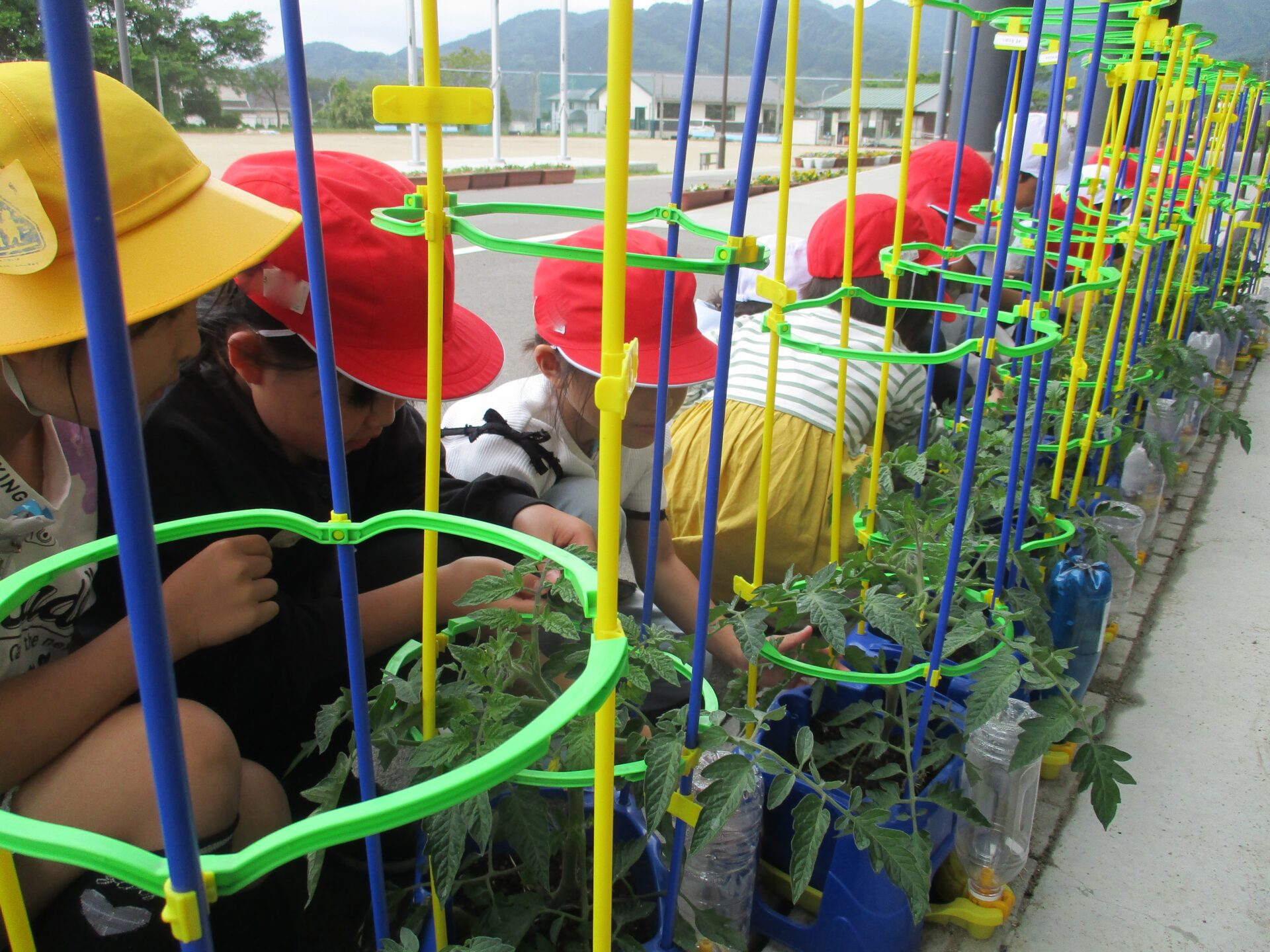 体育祭前に植えたミニトマトの苗がぐんぐん育っています。