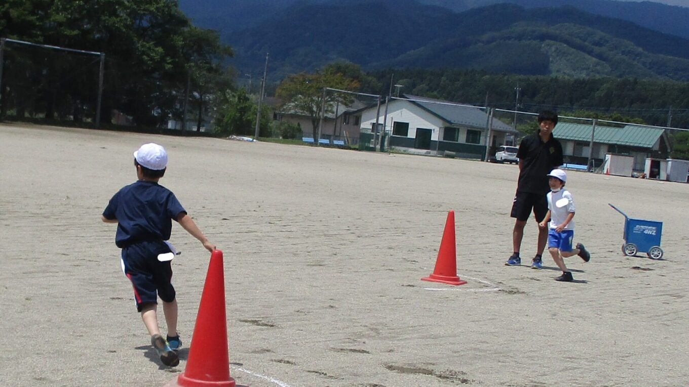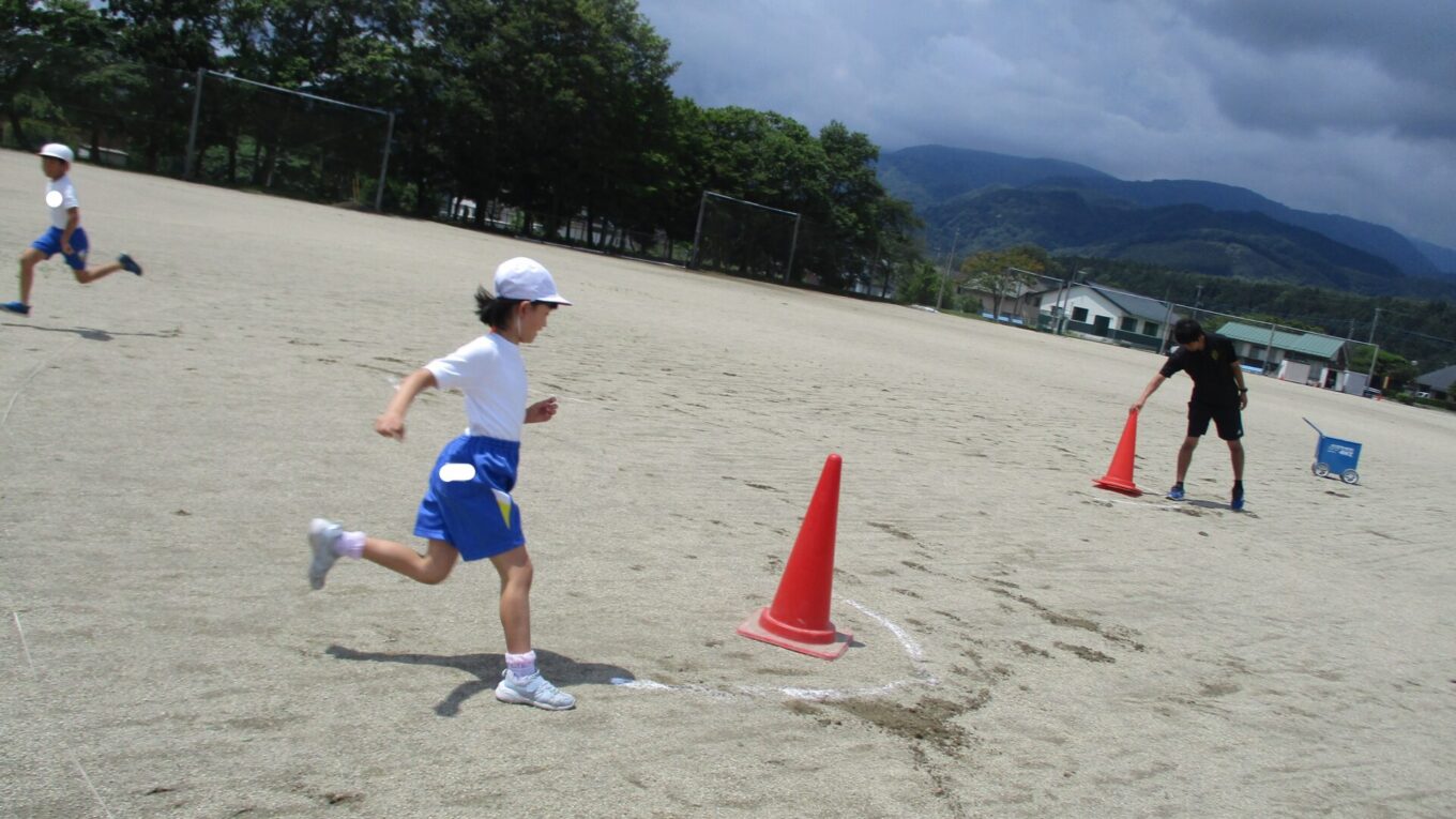 今日の体育はカラーコーンでジグザグコースを作って走ったりリレーをしたりしました。