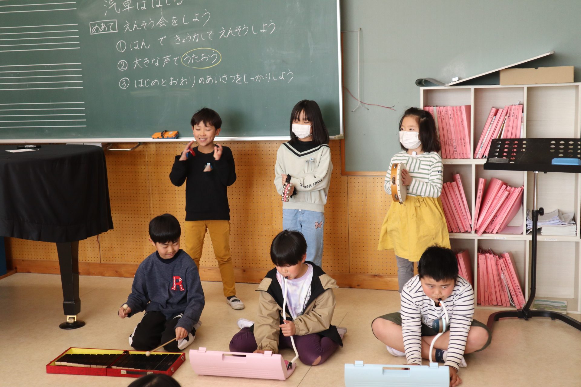 音楽の授業では班に分かれて「汽車は走る」を合奏の練習をしてきました。今日は担任に見せるために各班力を合わせて頑張っていました。始めから終わりまで、自分たちで決めていたようで「さんはい」や「おわり」などと声掛けをしながら発表していました。演奏中も目配せをしたり、友達の演奏に合わせたりするなどしていて、素敵な演奏でした。