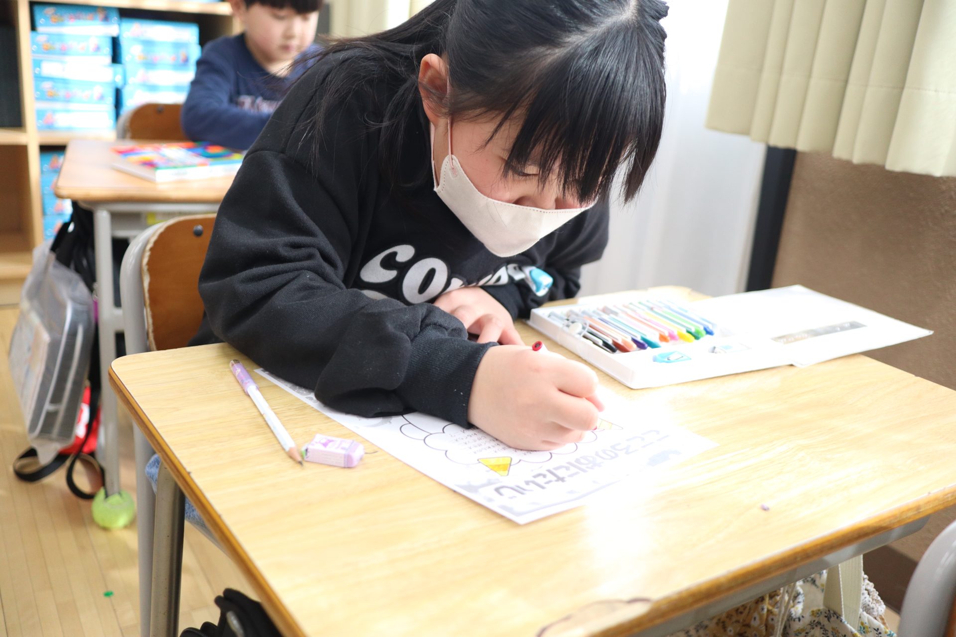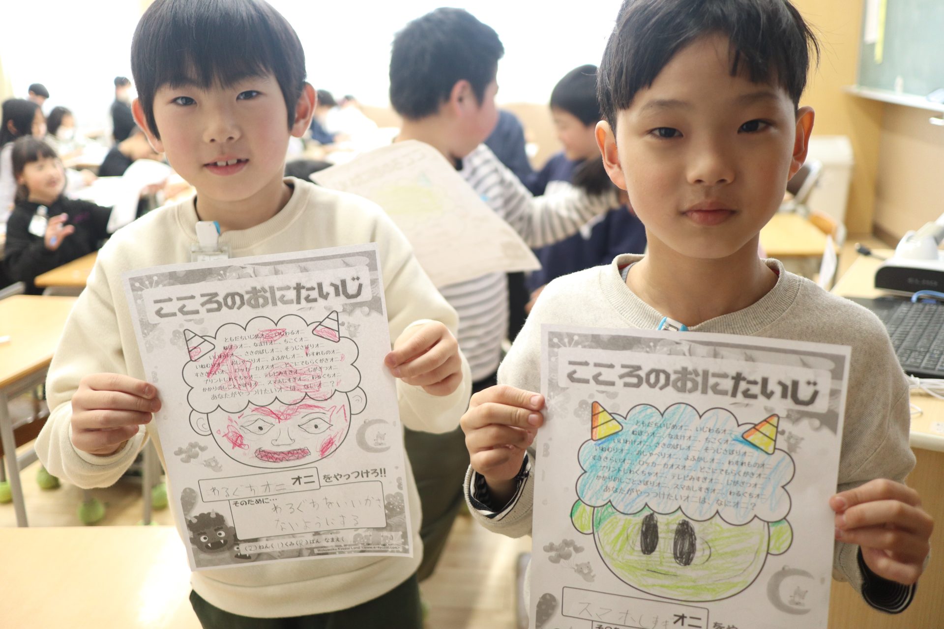 今日は節分について学習しました。節分では恵方巻きを食べたり、豆まきをしたりしますが、2年生は自分の弱い心をやっつける「こころのおにたいじ」をしました。自分の弱い心を「オニ」と称して、「わすれものオニ」「すききらいオニ」「スマホしすぎオニ」などから選び、そのオニをやっつけるために何をすればよいのかを考えました。楽しみながらも、自分の弱い心と向き合い改善していきたいという思いをもつことができました。