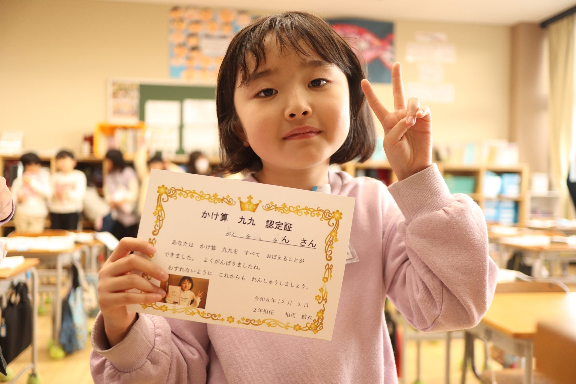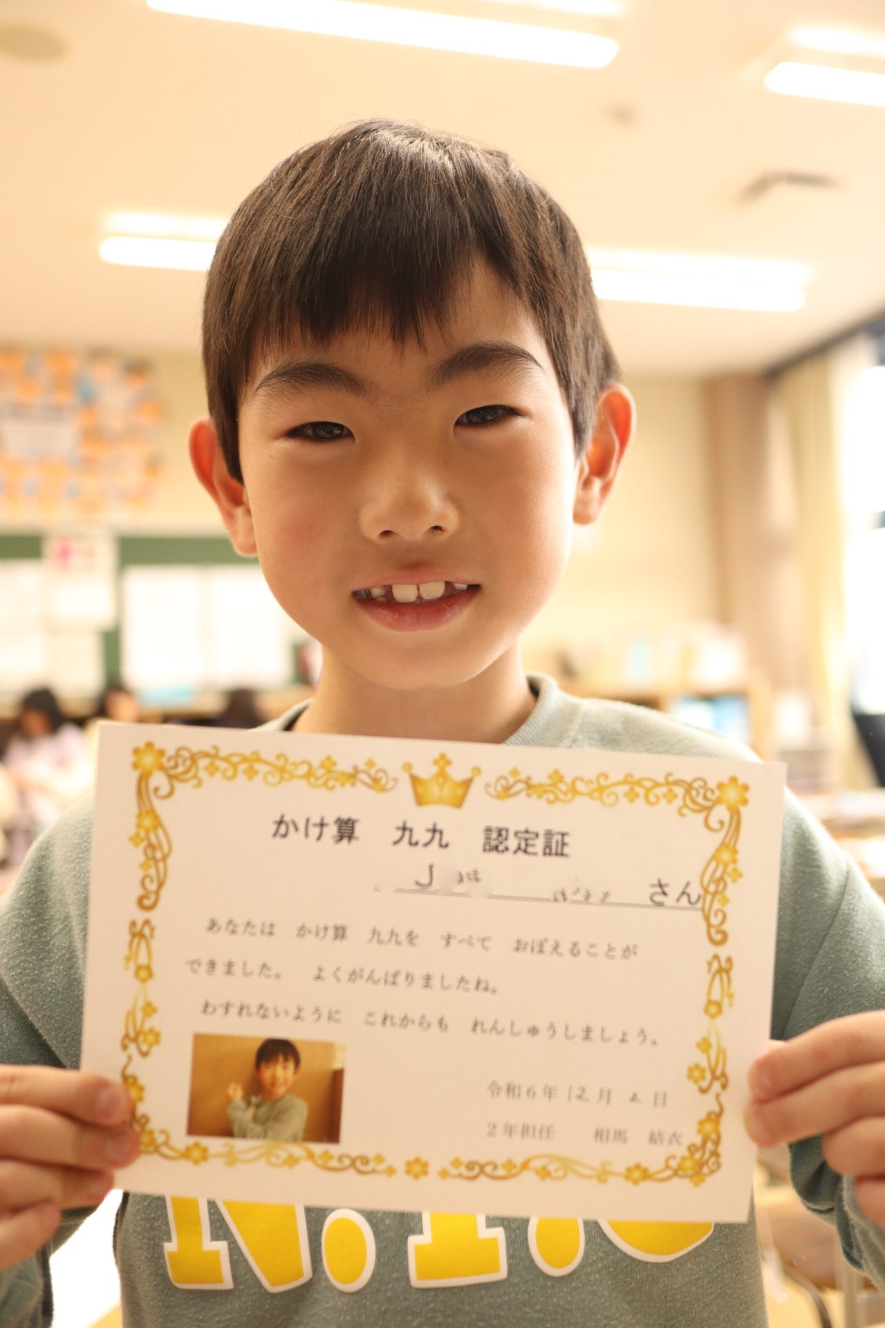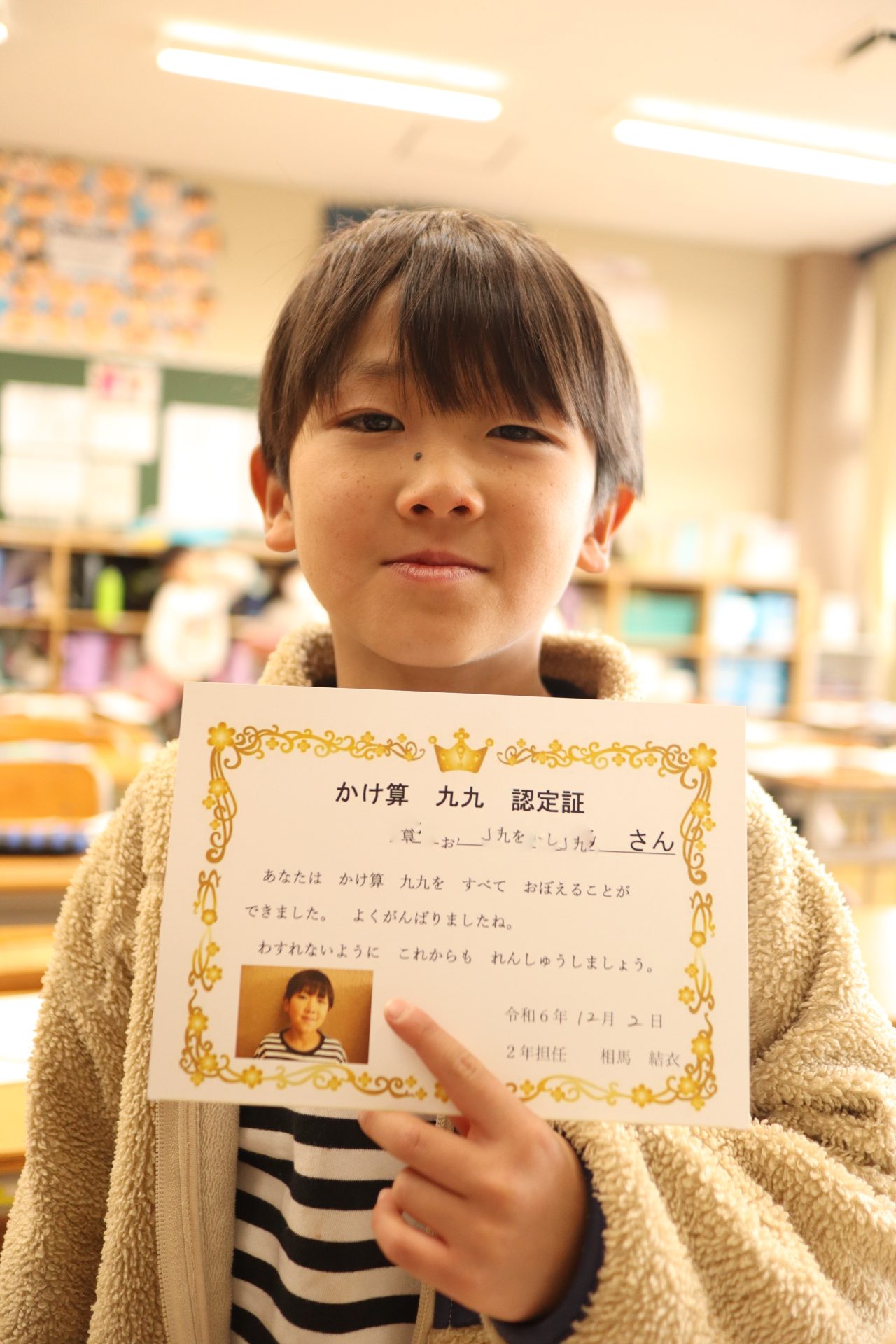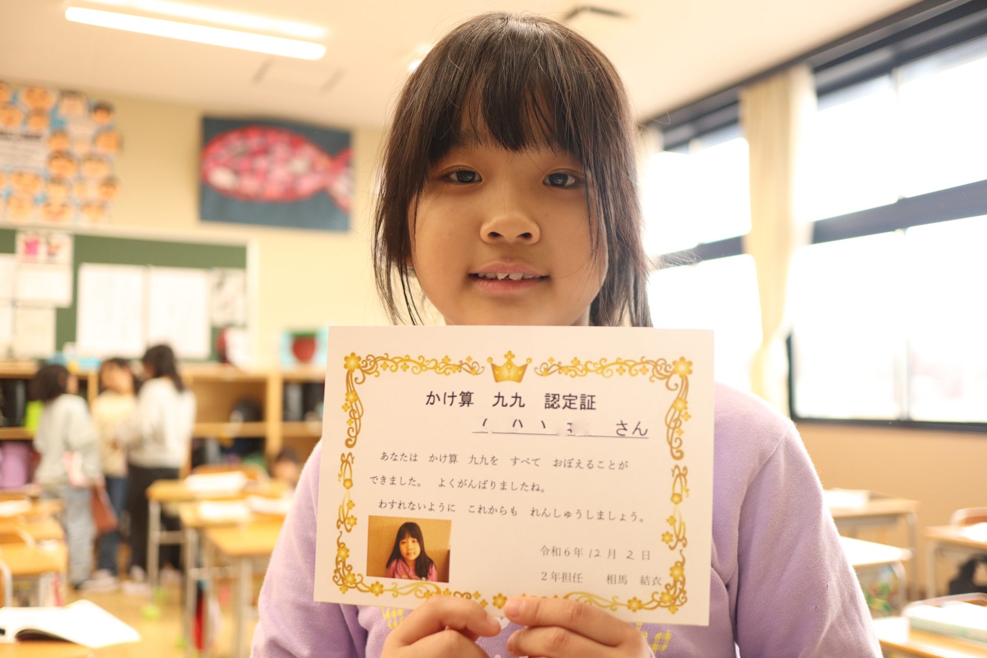 2024.12.02 2年生 今日の2年生 管理者学校 今年最後の1ヶ月が始まりました。よい締めくくりができるよう、残り1ヶ月も頑張っていきたいと思います。 今日でかけ算九九の最後の段が終わりました。授業中や休み時間等で練習したり、九九検定を受けたりして頑張ってきました。1~9の段全て合格した児童には、「かけ算九九認定証」が授与されます。今日、合格したのはこのメンバーです! 11月から取り組んできた、版画が完成しました。題材は「スイミー」のお気に入りのシーンです。様々な模様の紙を切って、貼り付け、作りました。 #2年生