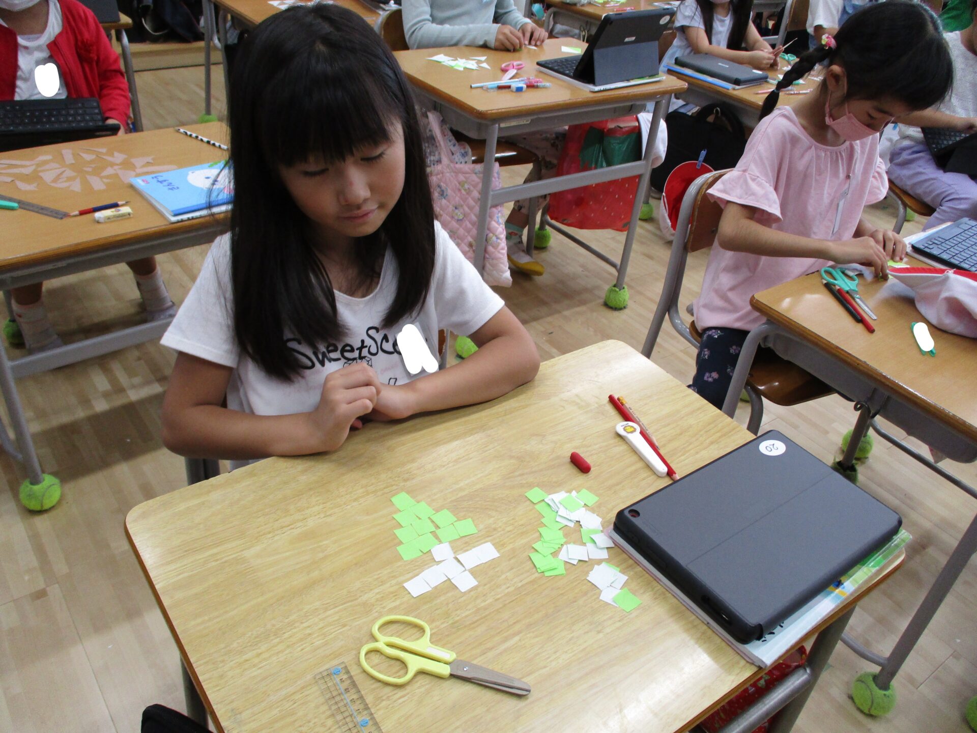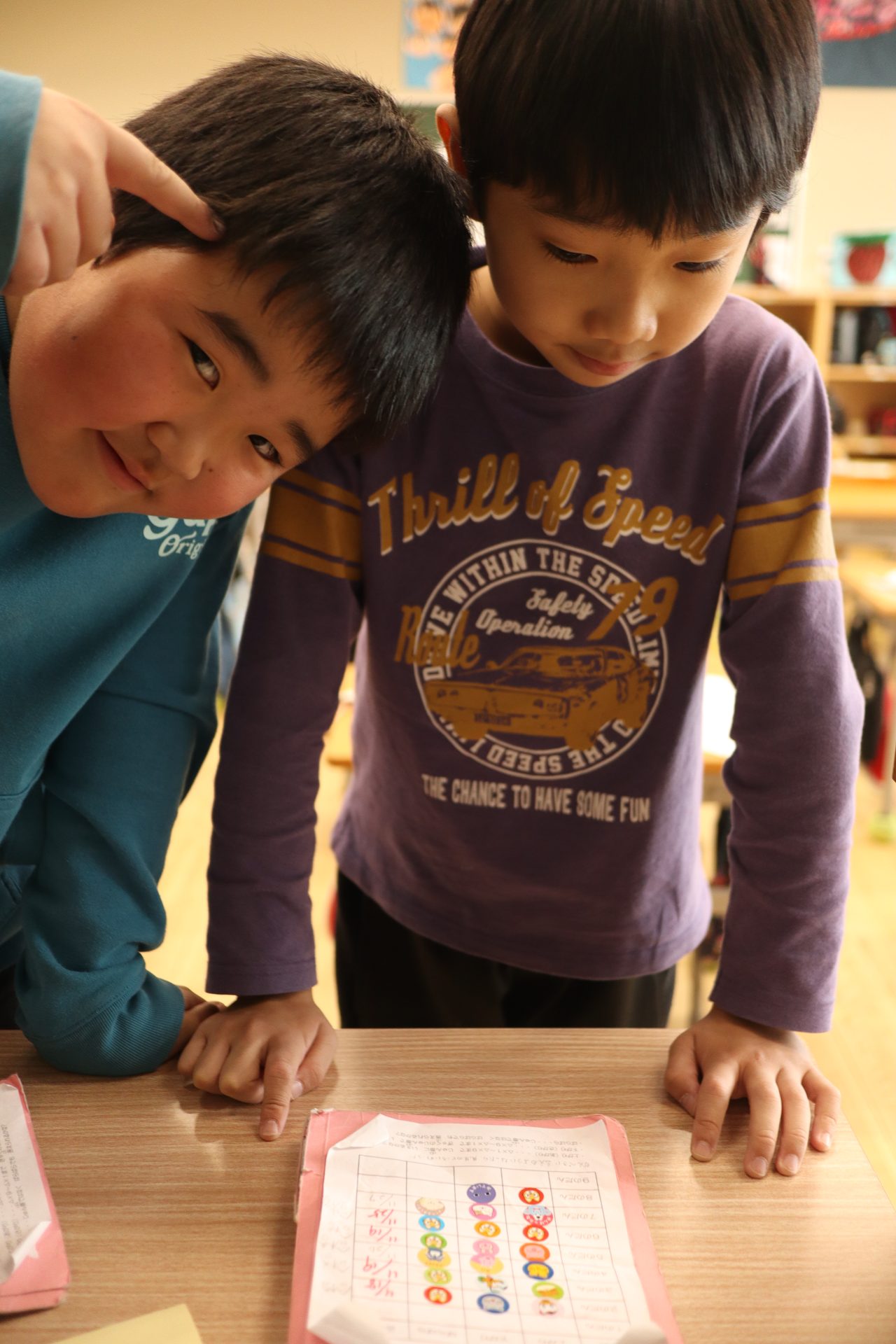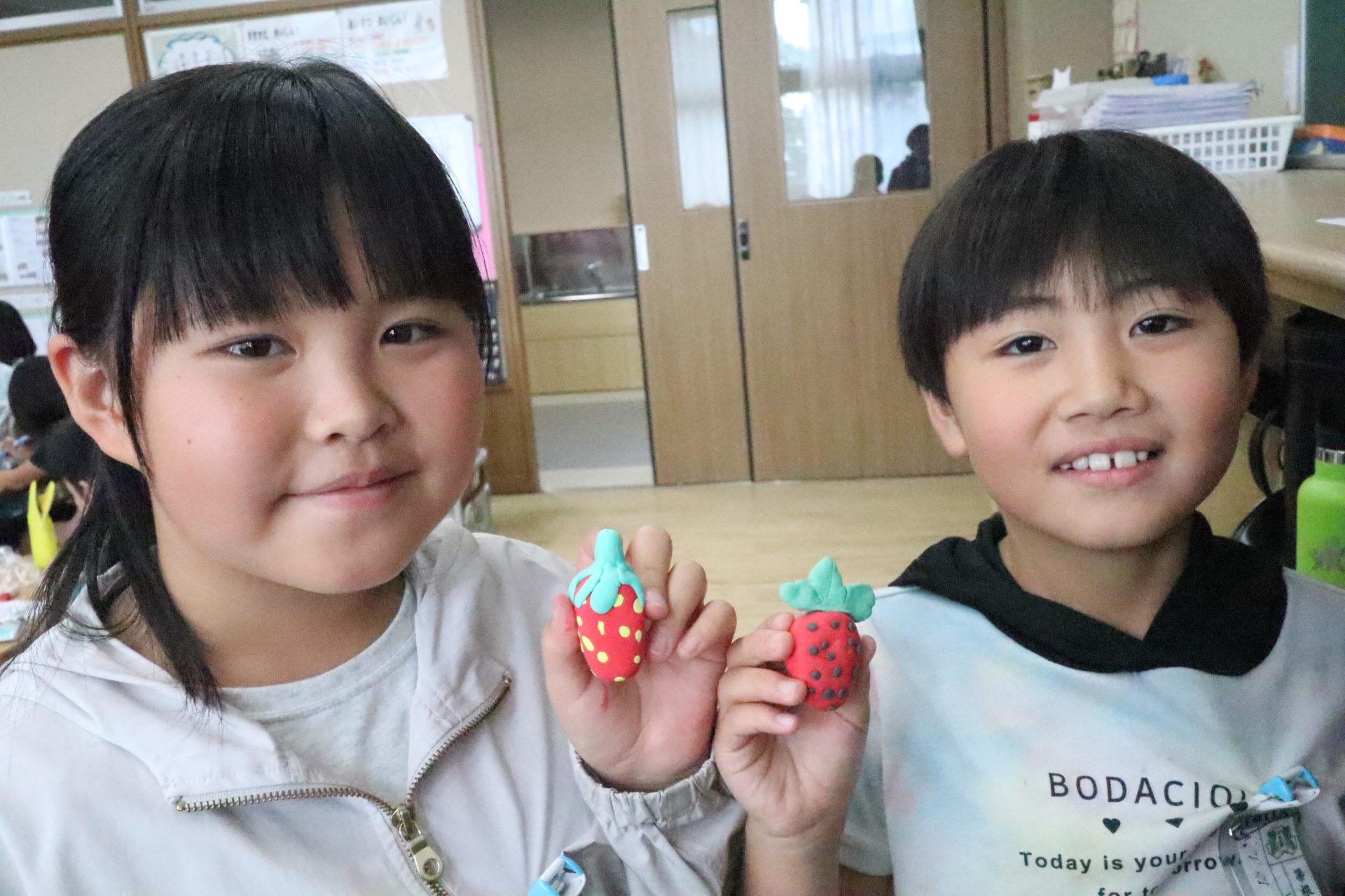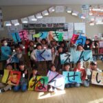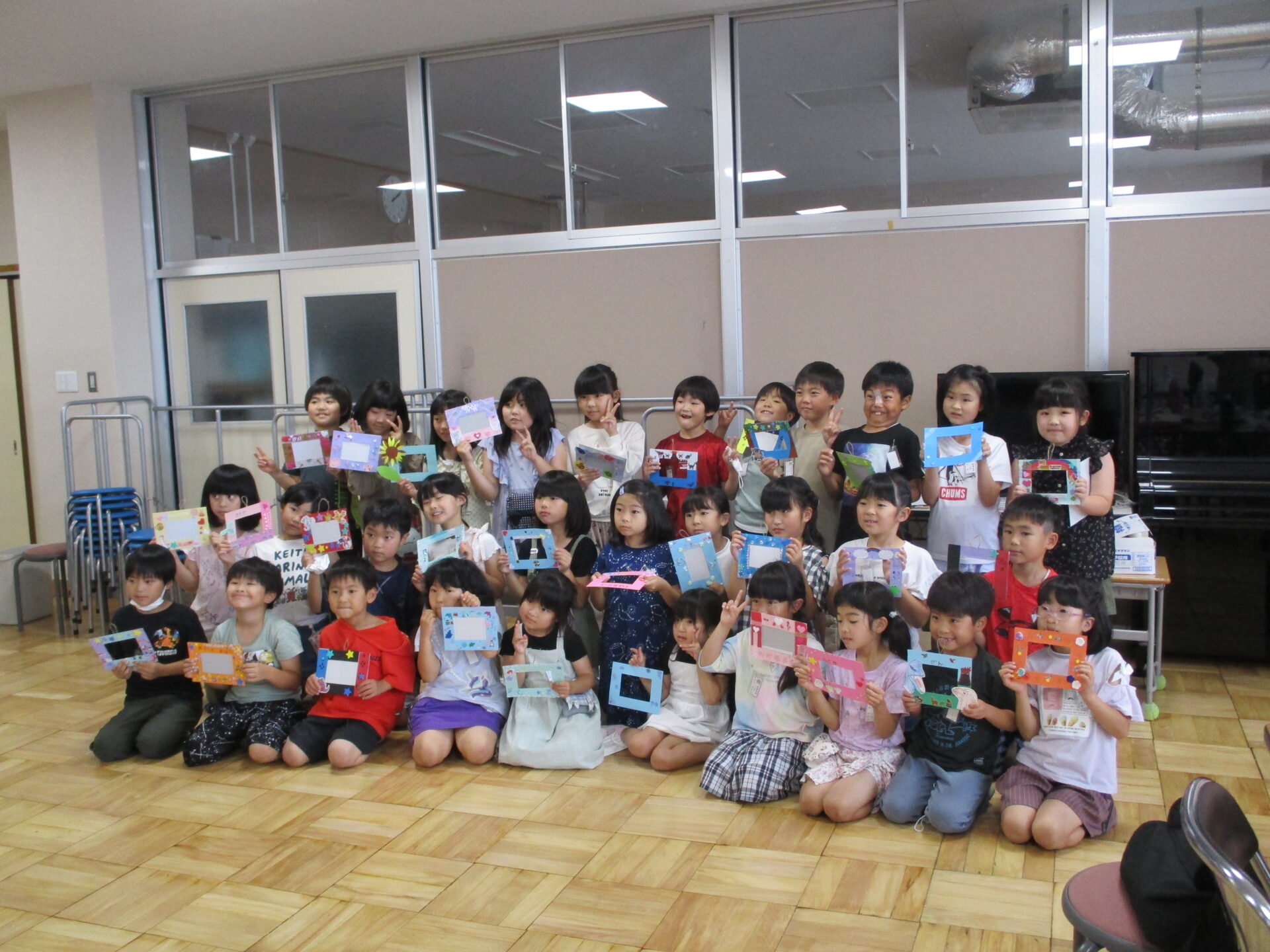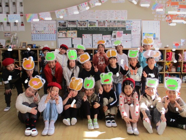 先週の学園祭、大変御世話になりました。自分たちで作ったお面やあいうえお作文を持って集合写真を撮りました。