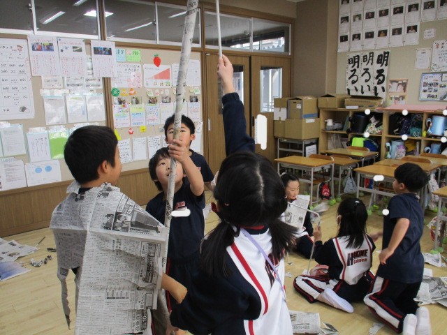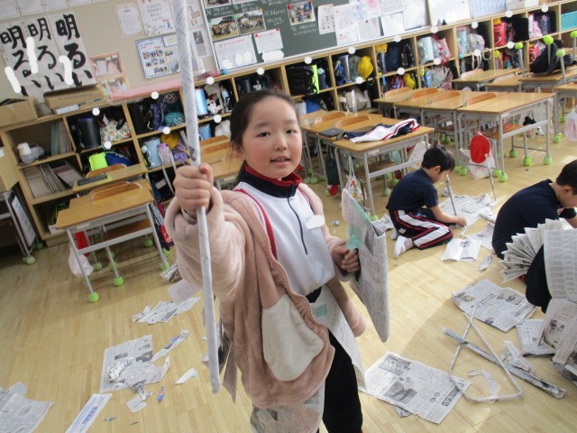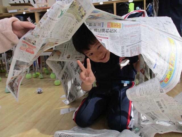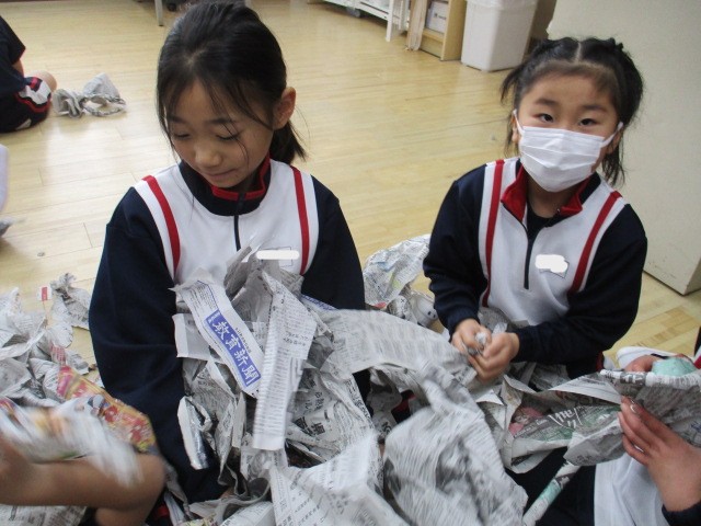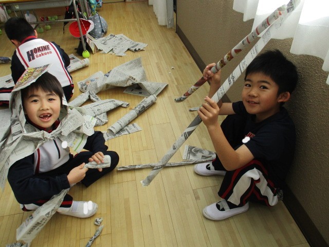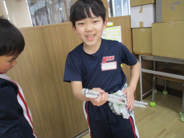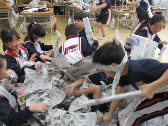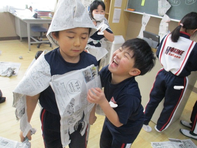 図工では、新聞紙で遊びました。丸めたり、つなげたり、体に巻き付けたり、テントにしたり、埋もれてみたり。新聞紙遊びの天才がたくさんいました。来週はこの新聞を使って作品を作ります。楽しみです。