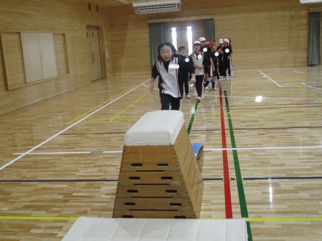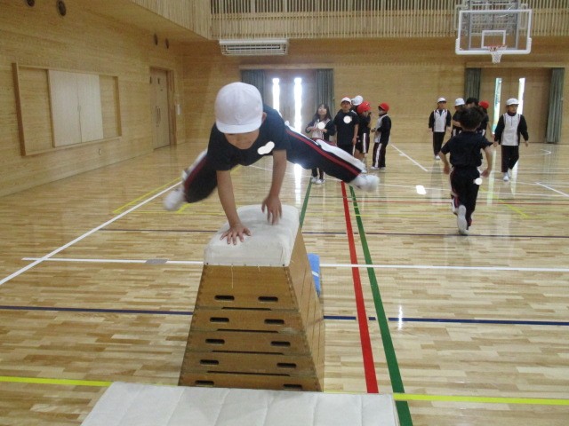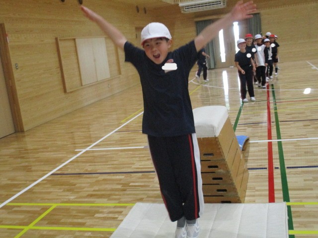 どんどん跳び箱が上達しています。最後のポーズまでかっこよくできるように練習しています。