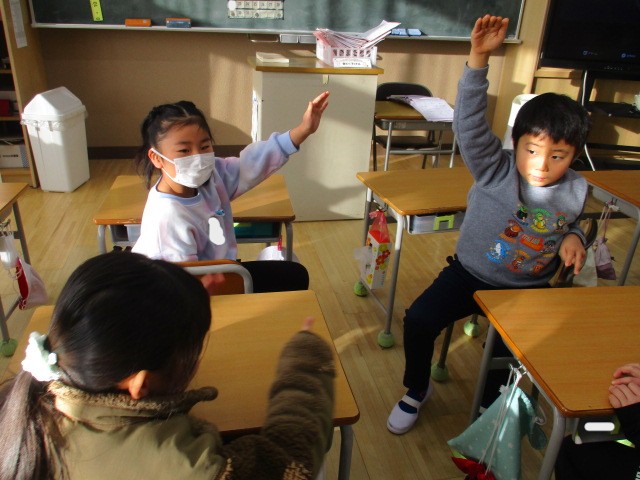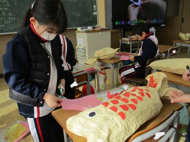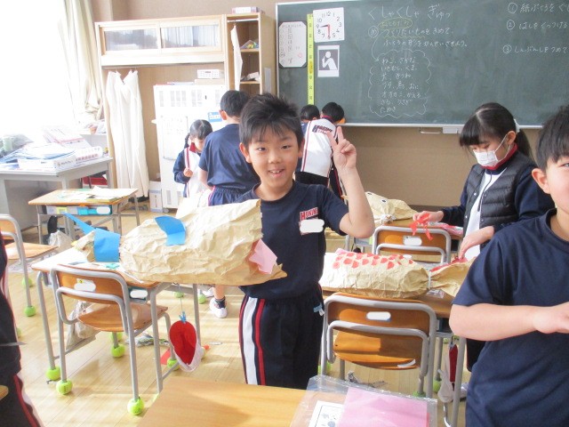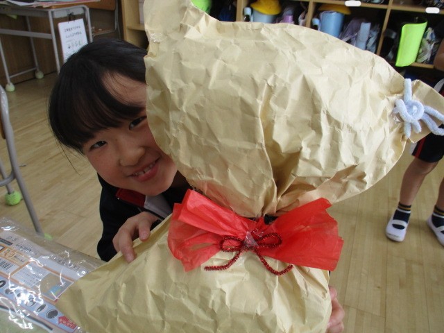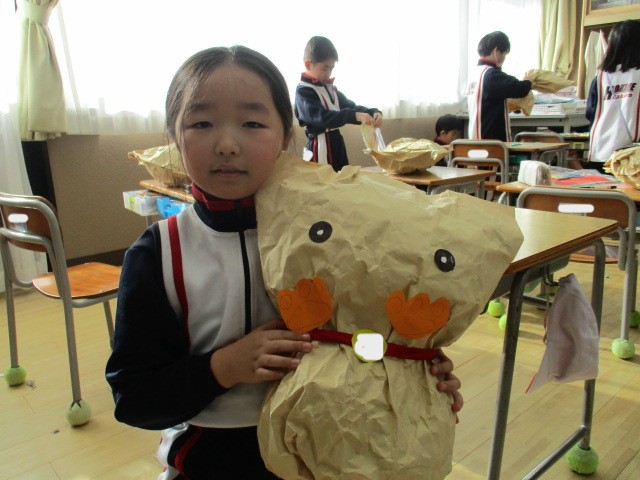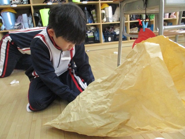 図工では、「くしゃくしゃぎゅっ」の学習で作品作りをしています。はじめは大きな紙袋に驚いていましたが、自慢のおともだちになるよう一生懸命作っていました。完成するのが楽しみですね。