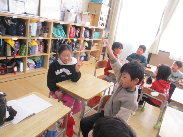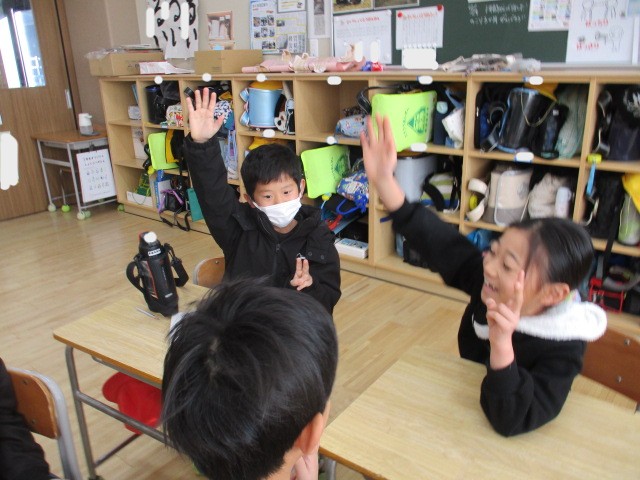 ソーシャルスキルトレーニングの様子です。遊びの中で友達の話を聞いたり、自分の考えを伝えたりしています。お題に対してたくさん手を挙げて発表していました。