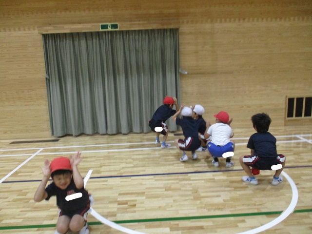 体育では、様々な動物になりきって表現する活動を行っています。リーダーの真似をして、クワガタにちょうちょ、へび、うさぎなどとても上手に表現しています。